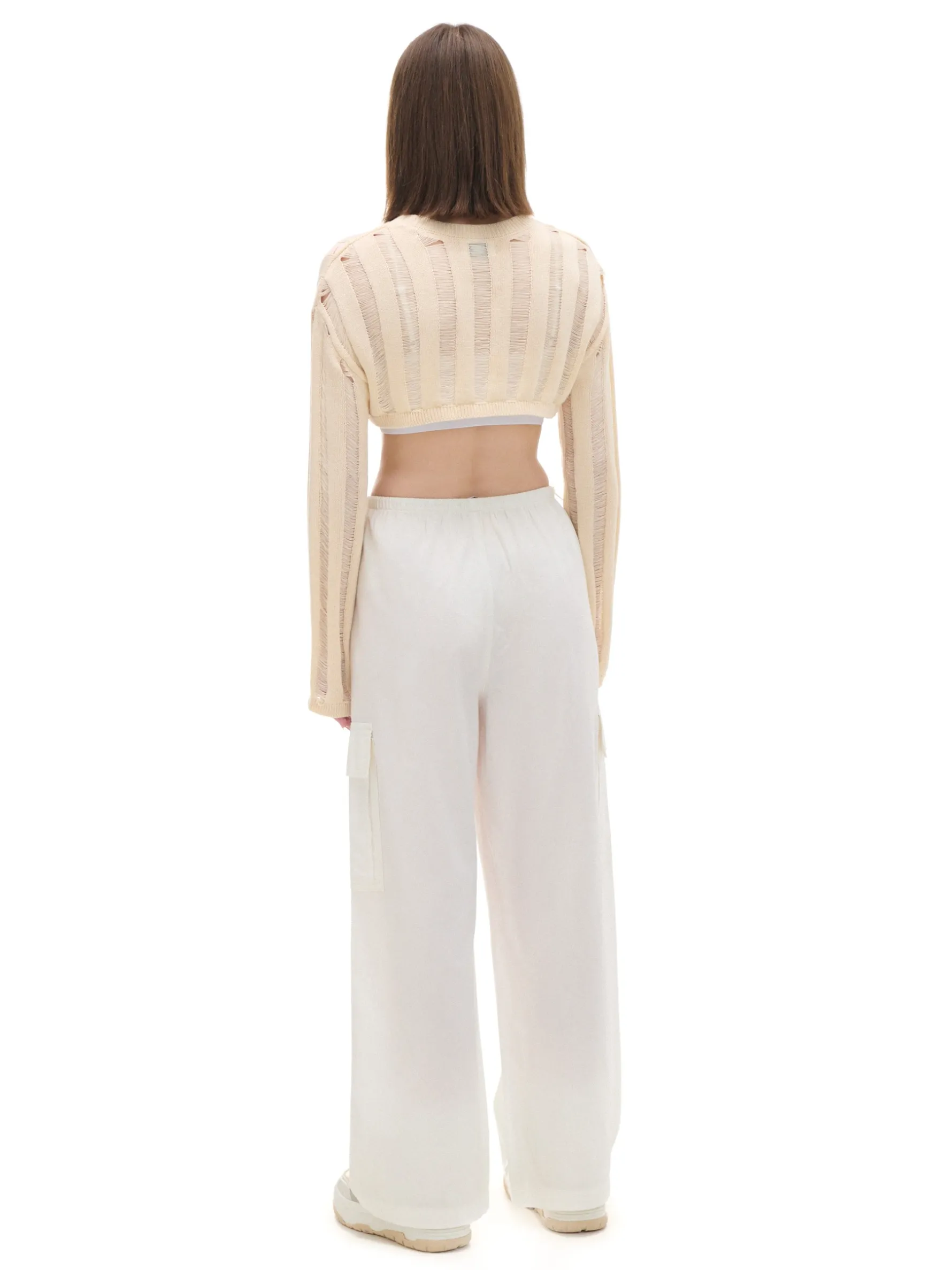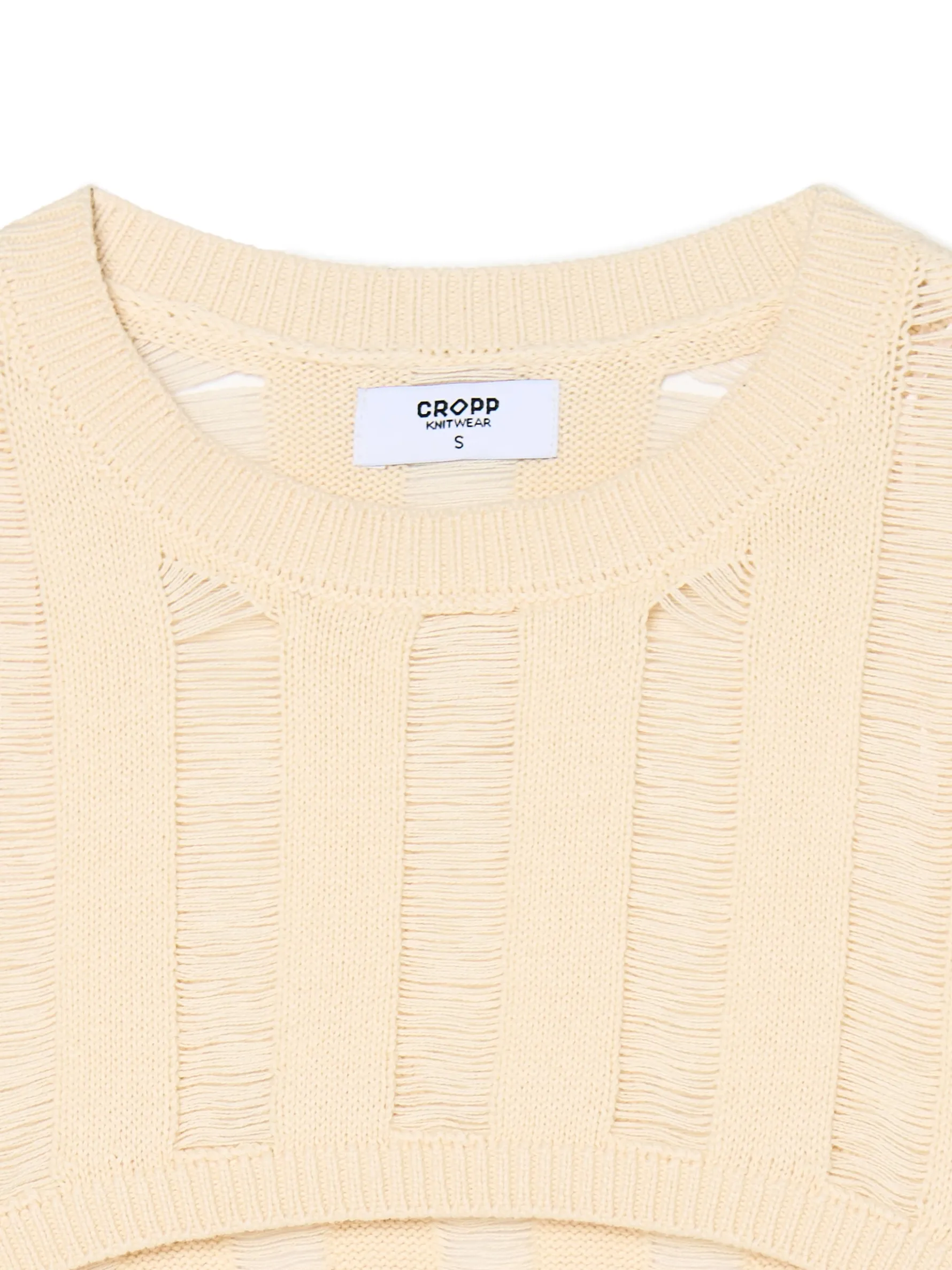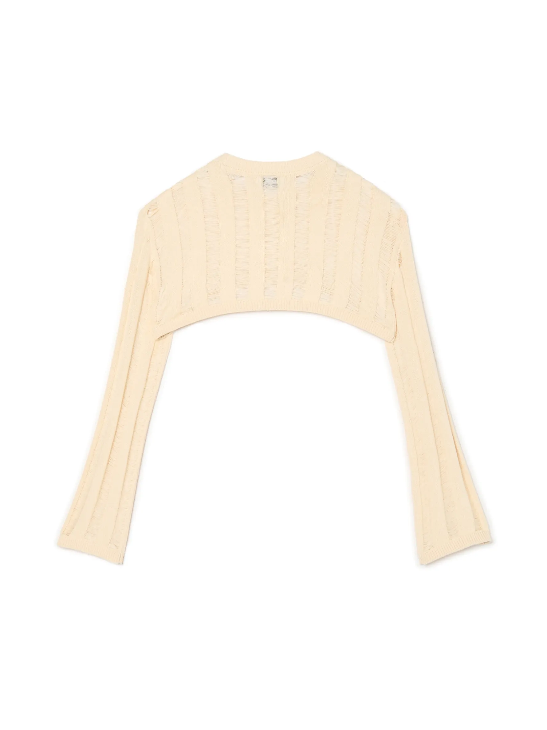Damski kremowy sweter o krótszym kroju uszyty z bawełny. Delikatne prześwity stanowią ozdobę tego modelu i idealnie fitują zarówno z topami, jak i sukienkami. 100% bawełny krótki krój długie, swobodne rękawy półokrągły dekolt wykończony ściągaczem Wzrost modelki: 172 cm
