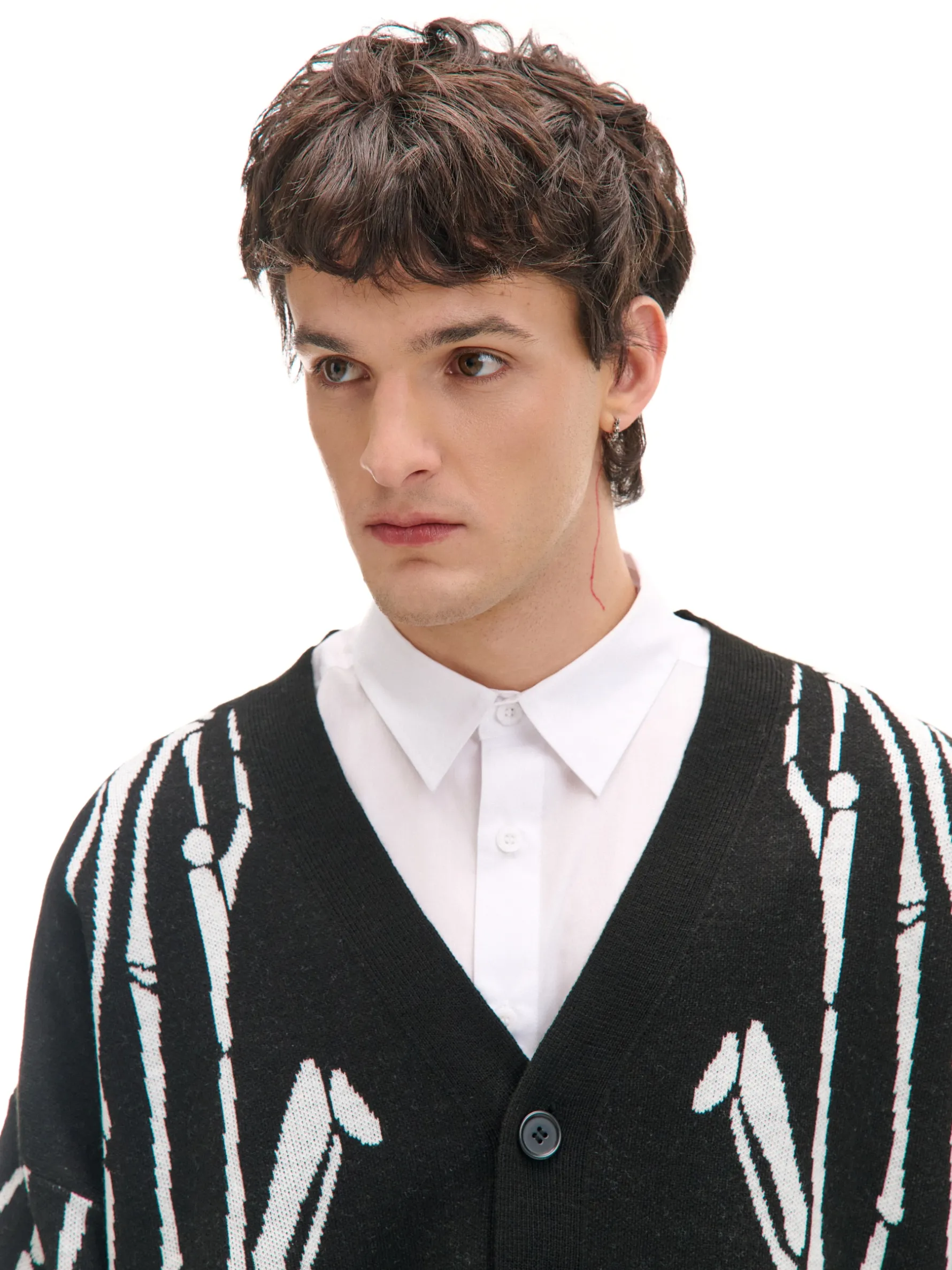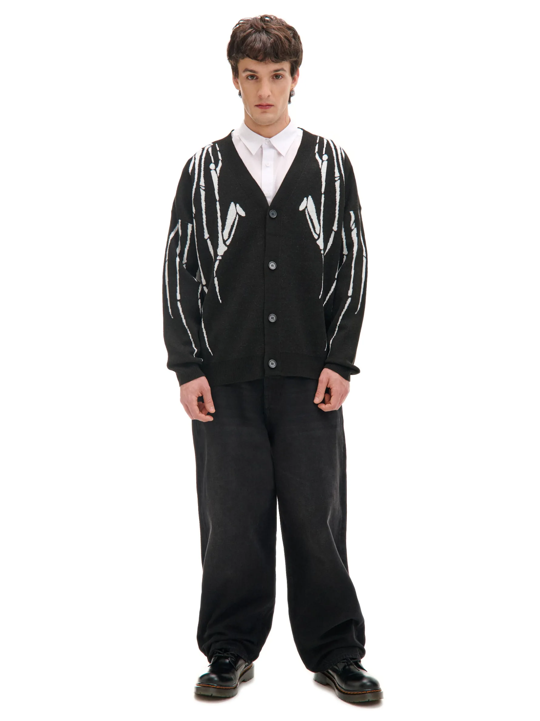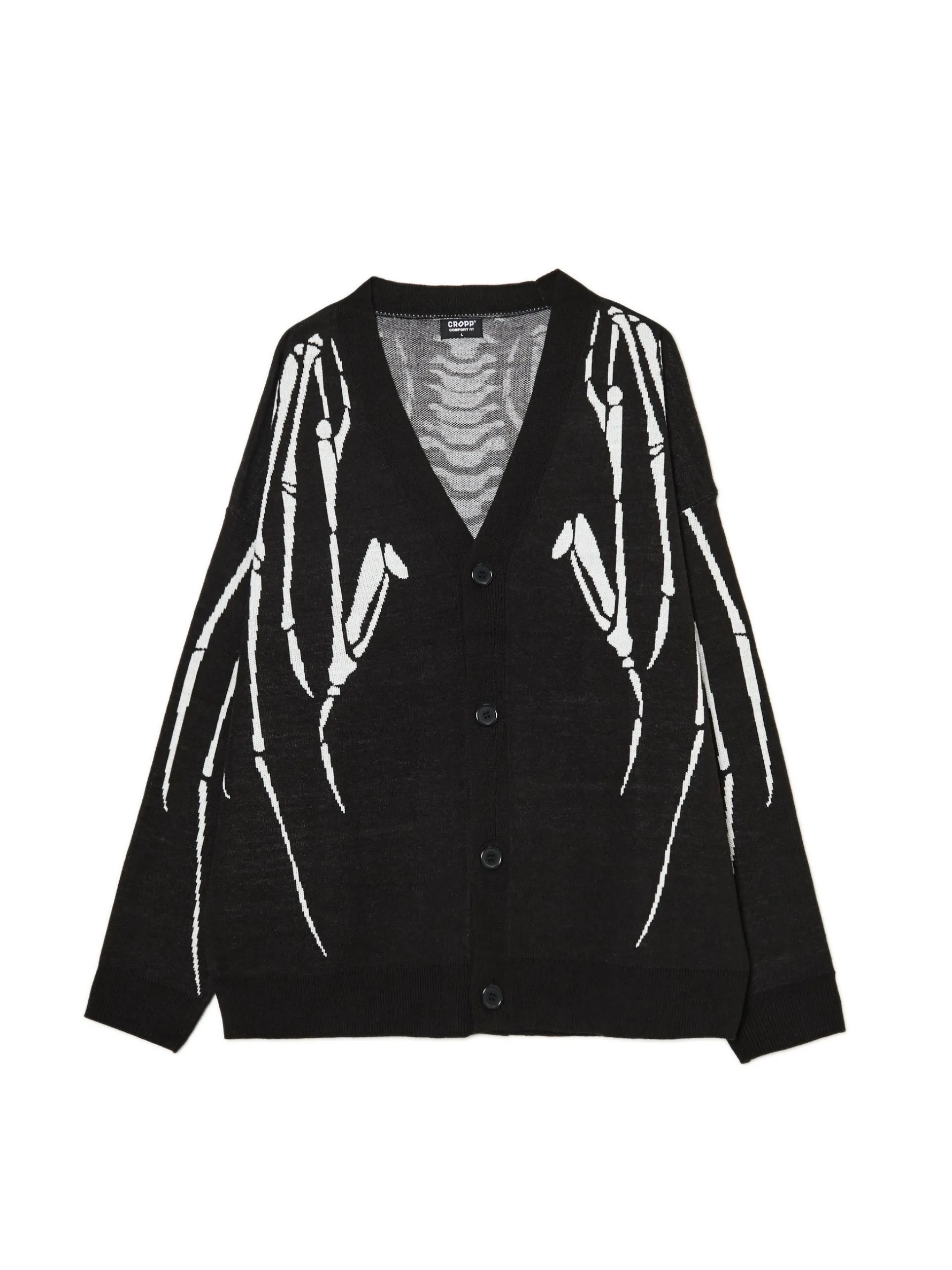 Czarny męski sweter rozpinany typu kardigan, uszyty z dzianiny. Idealny na imprezę z okazji Halloween! wygodny krój comfort zapinany na guziki brzegi i rękawy zakończone dzianinowym ściągaczem nadruk z motywem Halloween