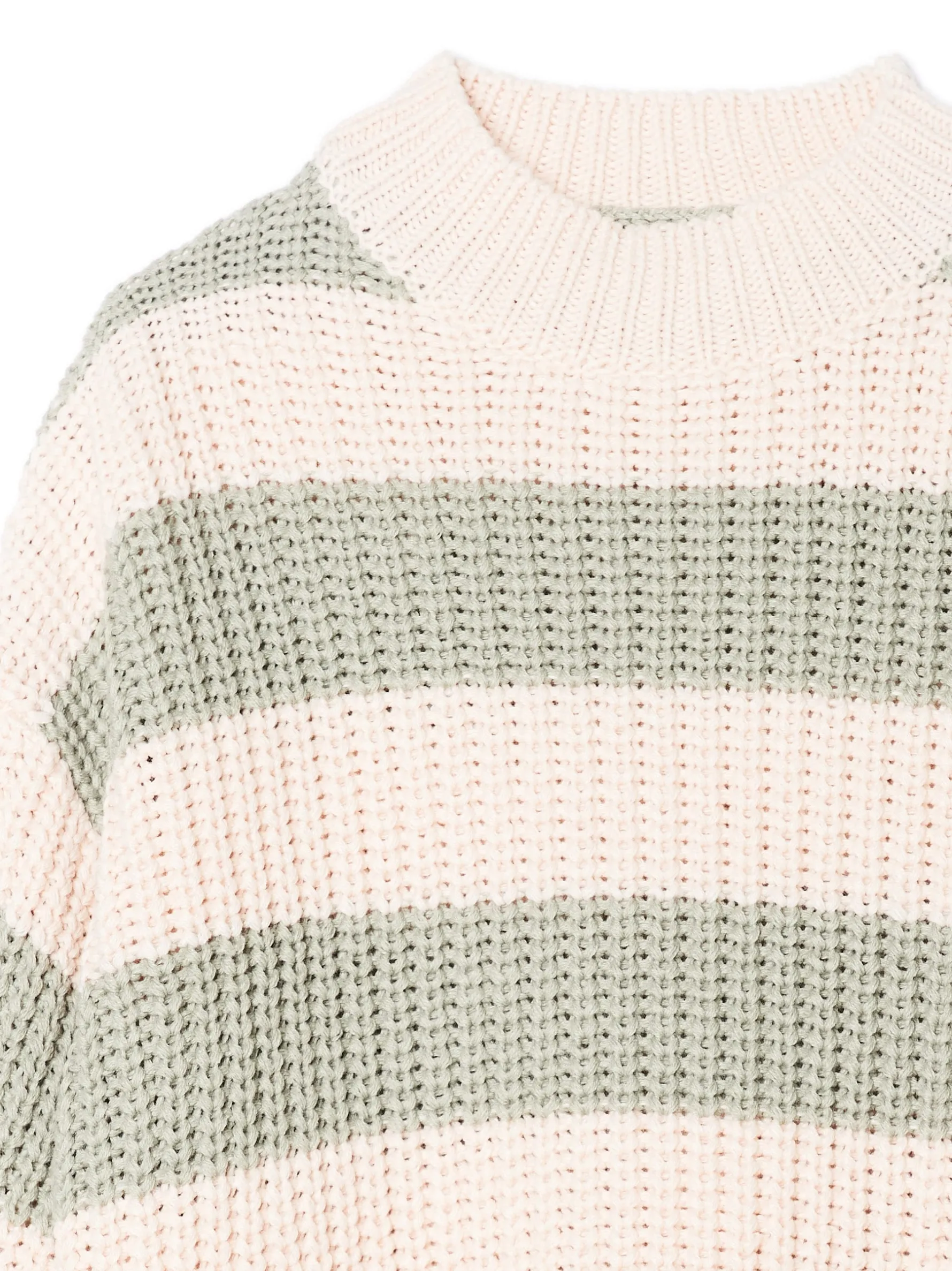 Kremowo-zielony sweter o regularnym kroju, uszyty z dzianiny. Zabudowany dekolt ze ściągaczem. Na całości wzór w paski. Dostępne inne warianty kolorystyczne.