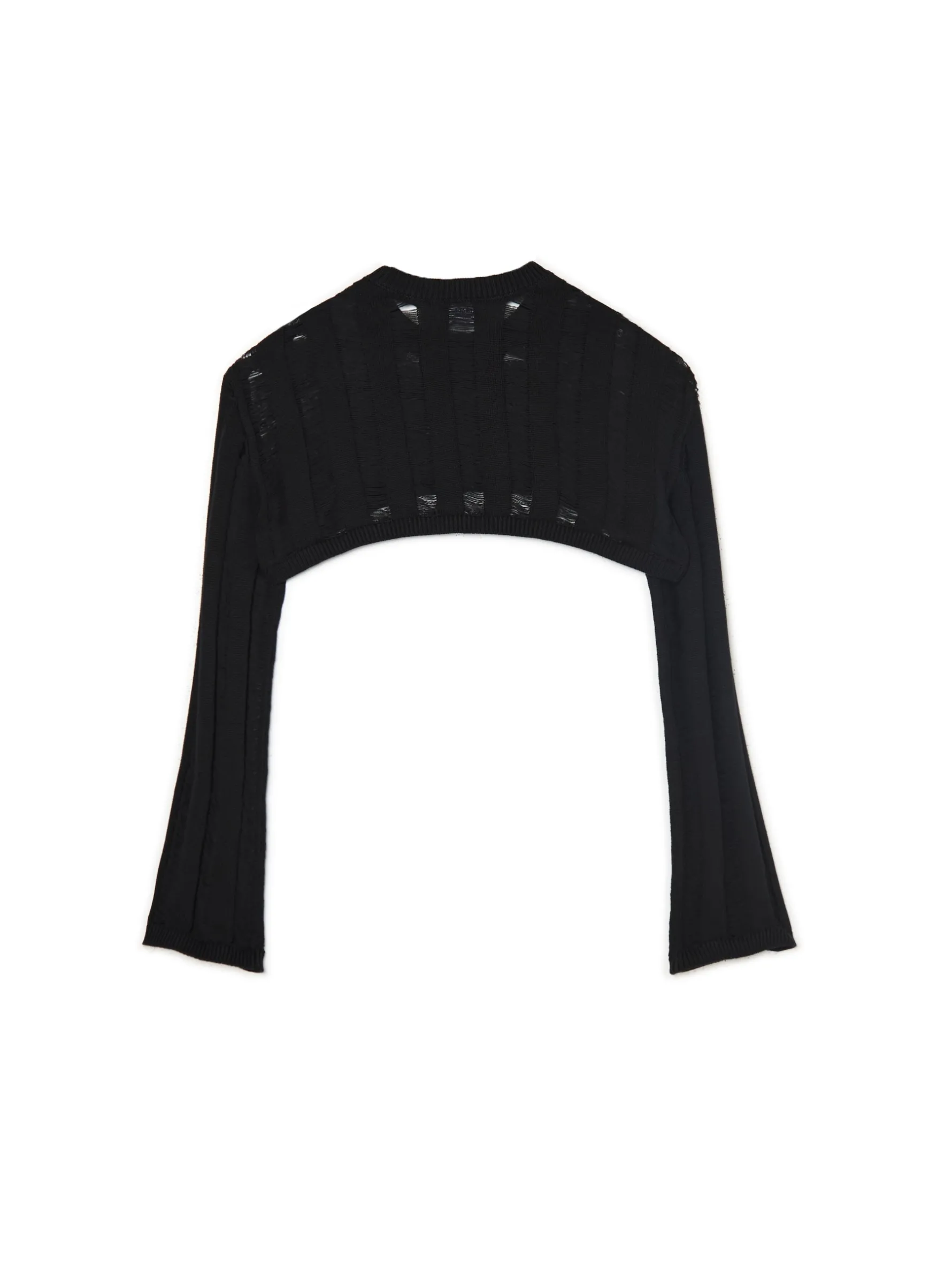 Damski czarny sweter o krótszym kroju uszyty z bawełny. Delikatne prześwity stanowią ozdobę tego modelu i idealnie fitują zarówno z topami, jak i sukienkami. 100% bawełny krótki krój długie, swobodne rękawy półokrągły dekolt wykończony ściągaczem Wzrost modelki: 177 cm