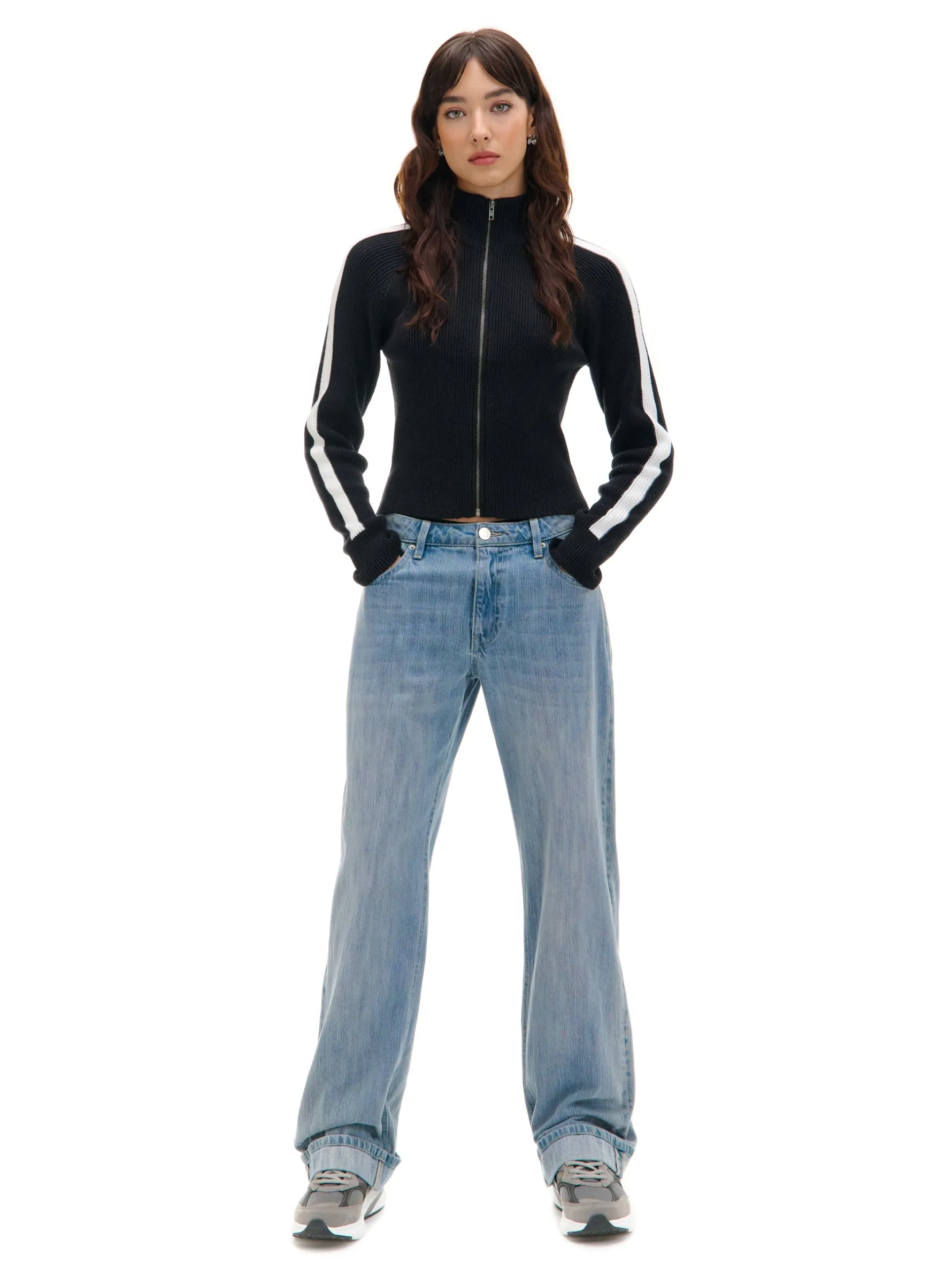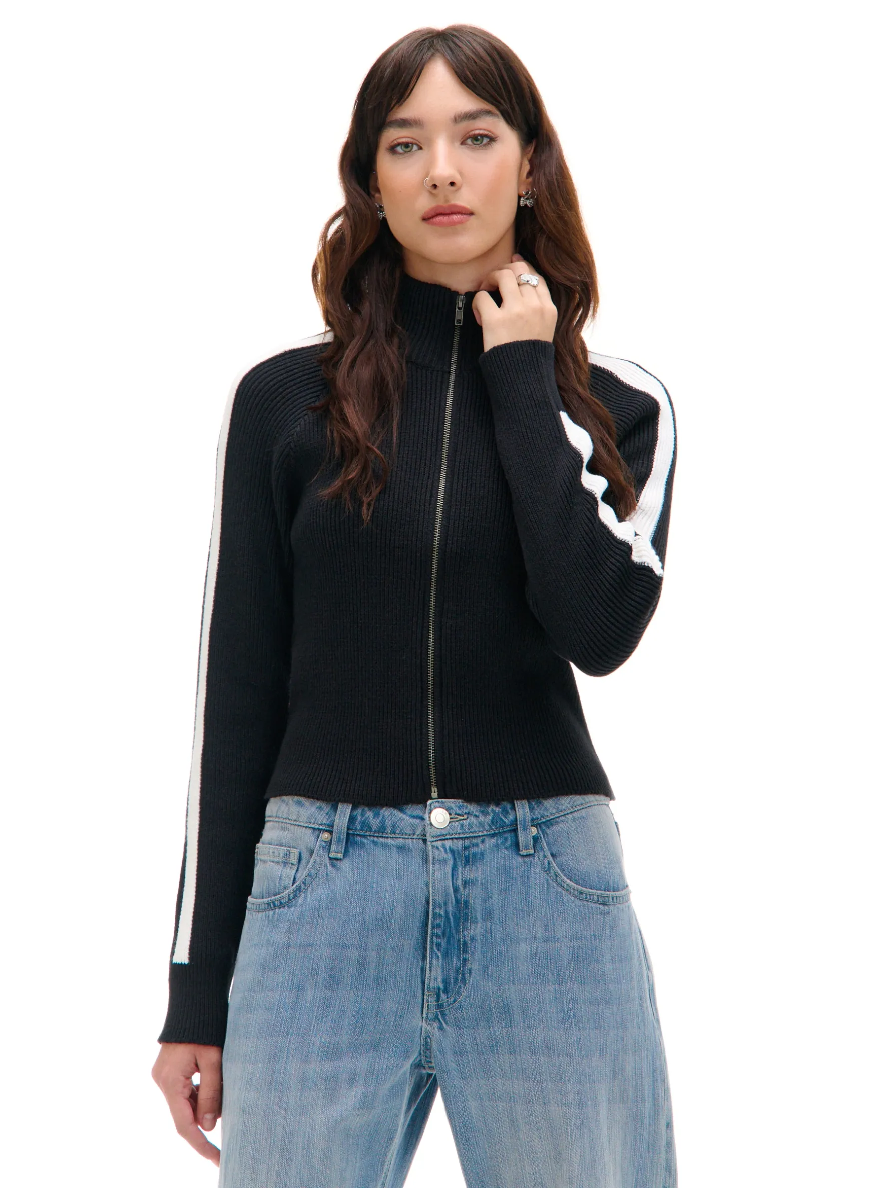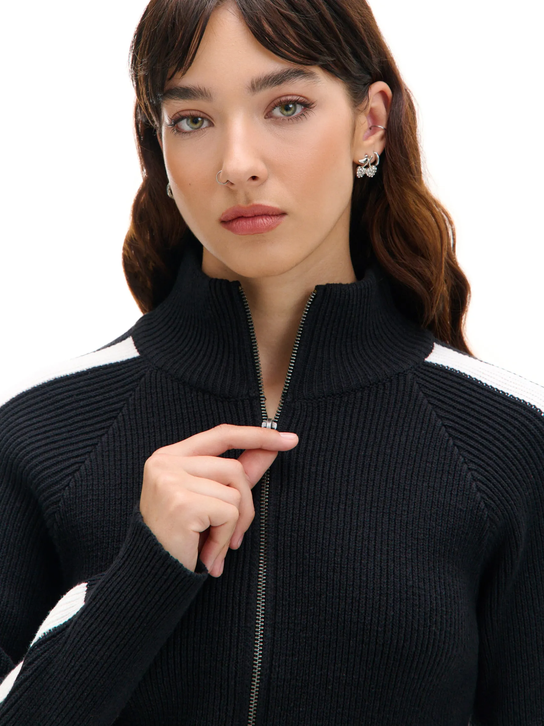 Ciepły damski sweter ze stójką zapinany na zamek na całej długości. Dzięki solidnej mieszance dzianin, możesz go śmiało założyć w mroźne, zimowe dni. Klasyczny czarny kolor i kontrastowe białe lampasy na rękach fitują z casualowymi stylizacjami. uszyty z prążkowanej dzianiny regularny krój zapięcie na zamek na całej długości niska stójka długie, dopasowane rękawy dekoracyjne, kontrastowe lampasy