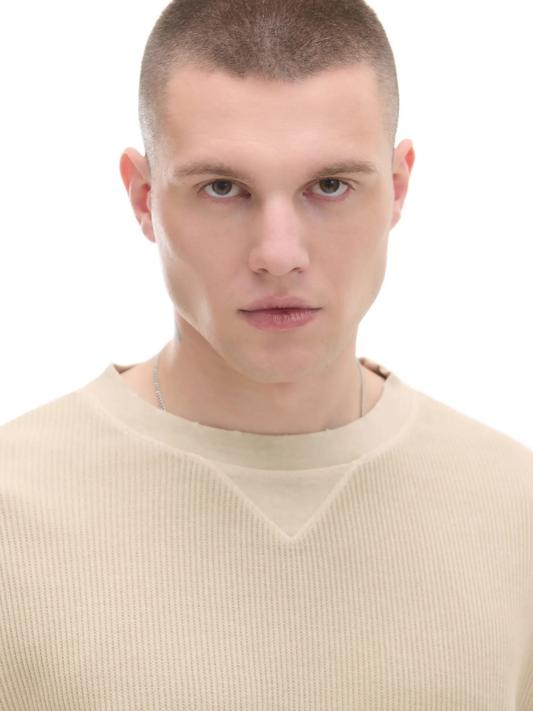 Męski sweter o kroju oversize uszyty z prążkowanej dzianiny. Casual, który warto mieć w swojej szafie! 100% bawełny krój oversize długie rękawy z obniżoną linią ramion dół i rękawy wykończone ściągaczem okragły dekolt ze ściągaczem surowe wykończenie brzegów Model prezentuje produkt w rozmiarze M/L. Wzrost modela: 185 cm
