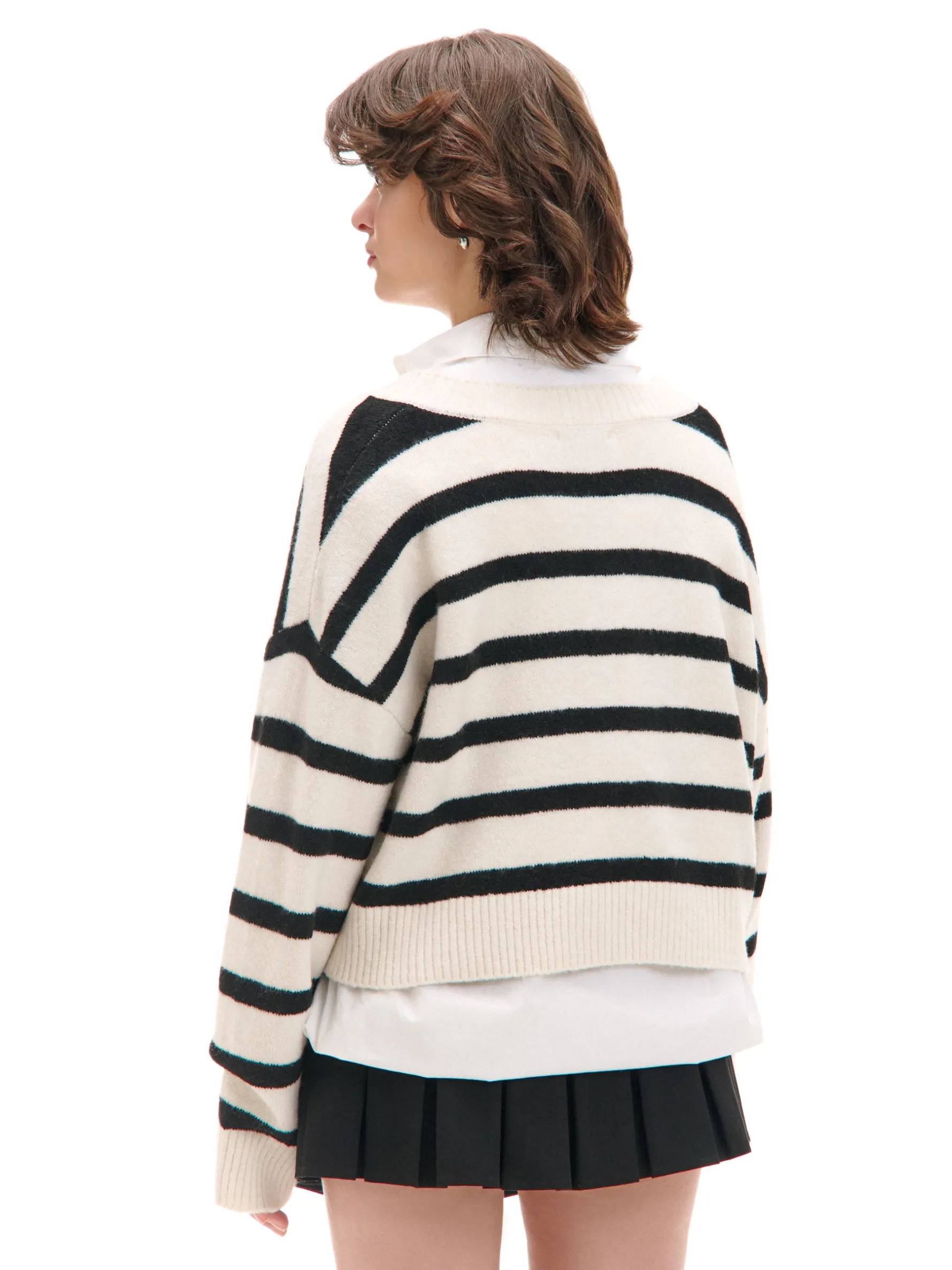 Sweter damski uszyty z solidnej i miękkiej w dotyku dzianiny. Dodatek elastycznych włókien dopasowuje item do sylwetki. Casual, który warto mieć w pobliżu podczas jesiennych wieczorów. dzianina z domieszką elastycznych włókien krótki krój głęboki dekolt w kształcie litery V dekoracyjna, prążkowana lamówka wokół dekoltu długie rękawy z obniżoną linią ramion dół i rękawy wykończone prążkowanym ściągaczem lekkie ocieplenie wzór w paski na całości