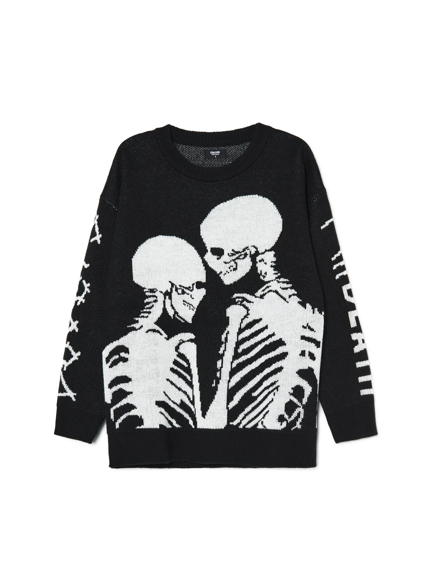 Czarno-biały damski sweter, uszyty z przyjemnej w dotyku dzianiny. Idealny na Halloween! wygodny, reglarny krój rękawy i dół zakończony ściągaczami zabudowany dekolt nadruk z motywem Halloween na rękawach napisy LOVERS Wzrost modelki: 177 cm