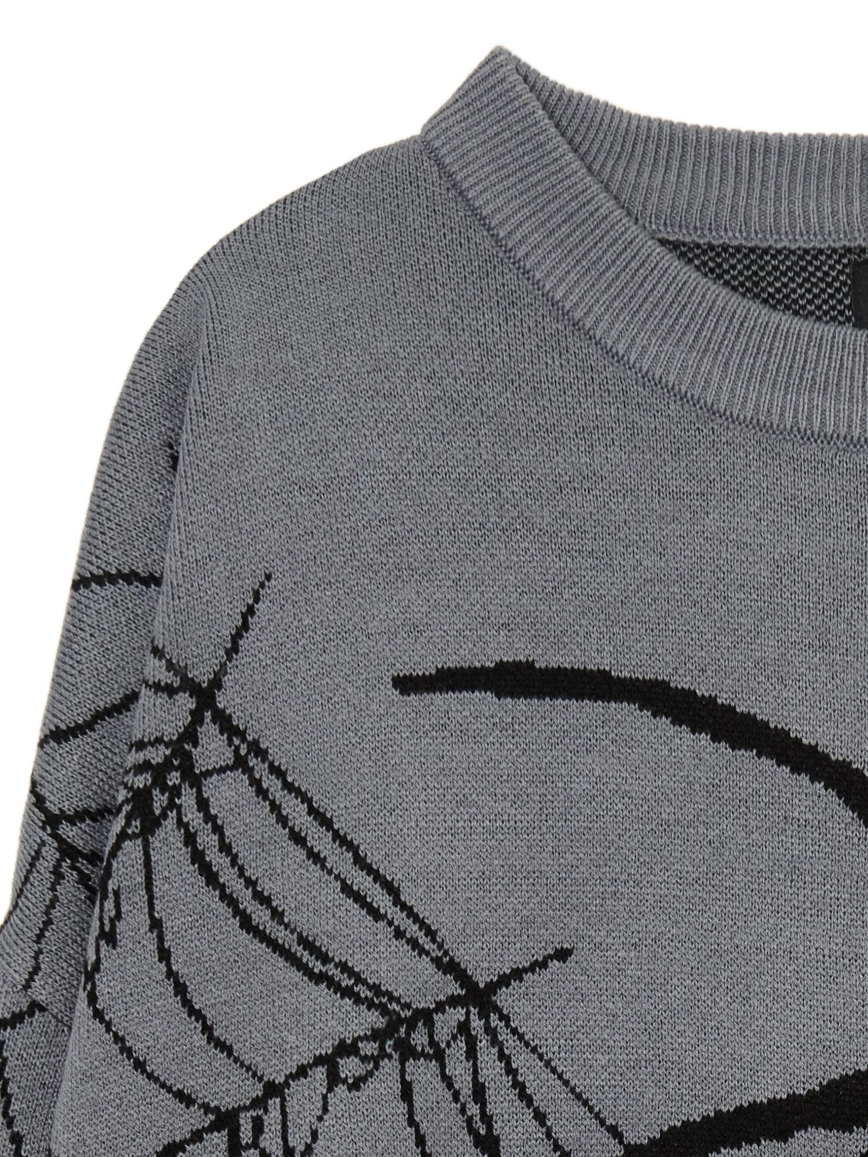 Szary męski sweter, uszyty z miękkiej żakardowej dzianiny. Idealny na casualowe Halloween! luźny krój boxy dolny brzeg i długie rękawy zakończone ściągaczem nadruk z motywem Halloween