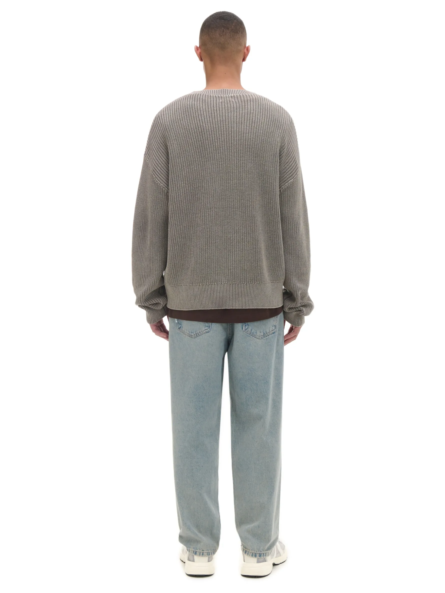 Sweter męski uszyty z prążkowanej, bawełnianej dzianiny z efektem sprania. Służy jako casual lub dodatek do białej koszuli. 100% bawełny prążkowany materiał obszerny krój boxy okrągły dekolt z lamówką długie, swobodne rękawy dół i rękawy wykończone prążkowanym ściągaczem silikonowe taśmy wszyte wewnątrz na wysokości ramion efekt sprania na całości Wzrost modela: 185 cm