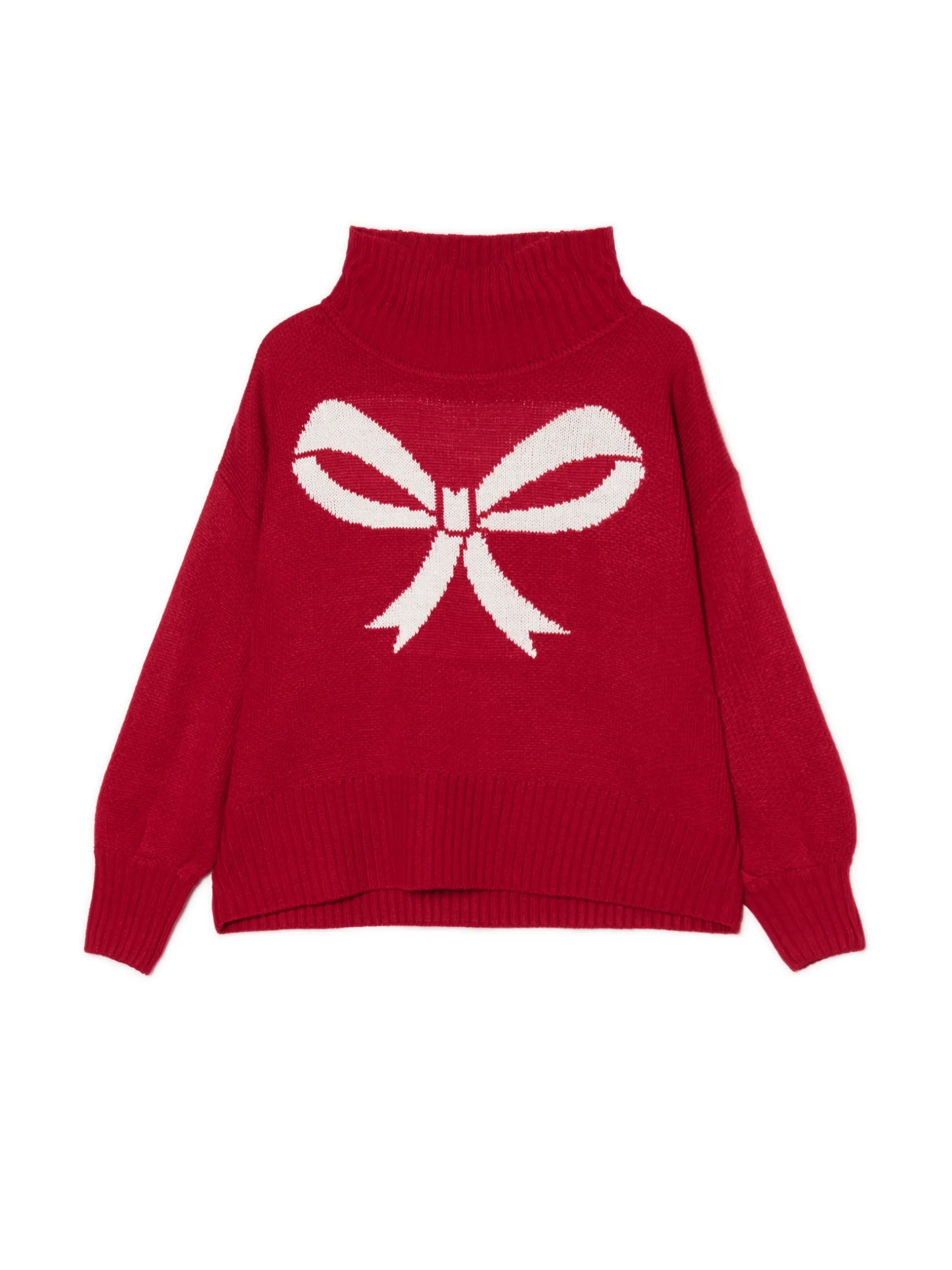 Damski sweter z półgolfem uszyty z miękkiej w dotyku dzianiny. Wyposażony w duży nadruk z motywem kokardy na przodzie. Idealny item na bardziej oficjalne spotkania świąteczne. Łap też na prezent dla mamy, siostry, babci, cioci lub bestie! sweter o regularnym kroju przyjemny w dotyku materiał zabudowany dekolt z półgolfem długie rękawy z obniżoną linią ramion dół i rękawy wykończone prążkowanym ściągaczem nadruk z motywem Xmas