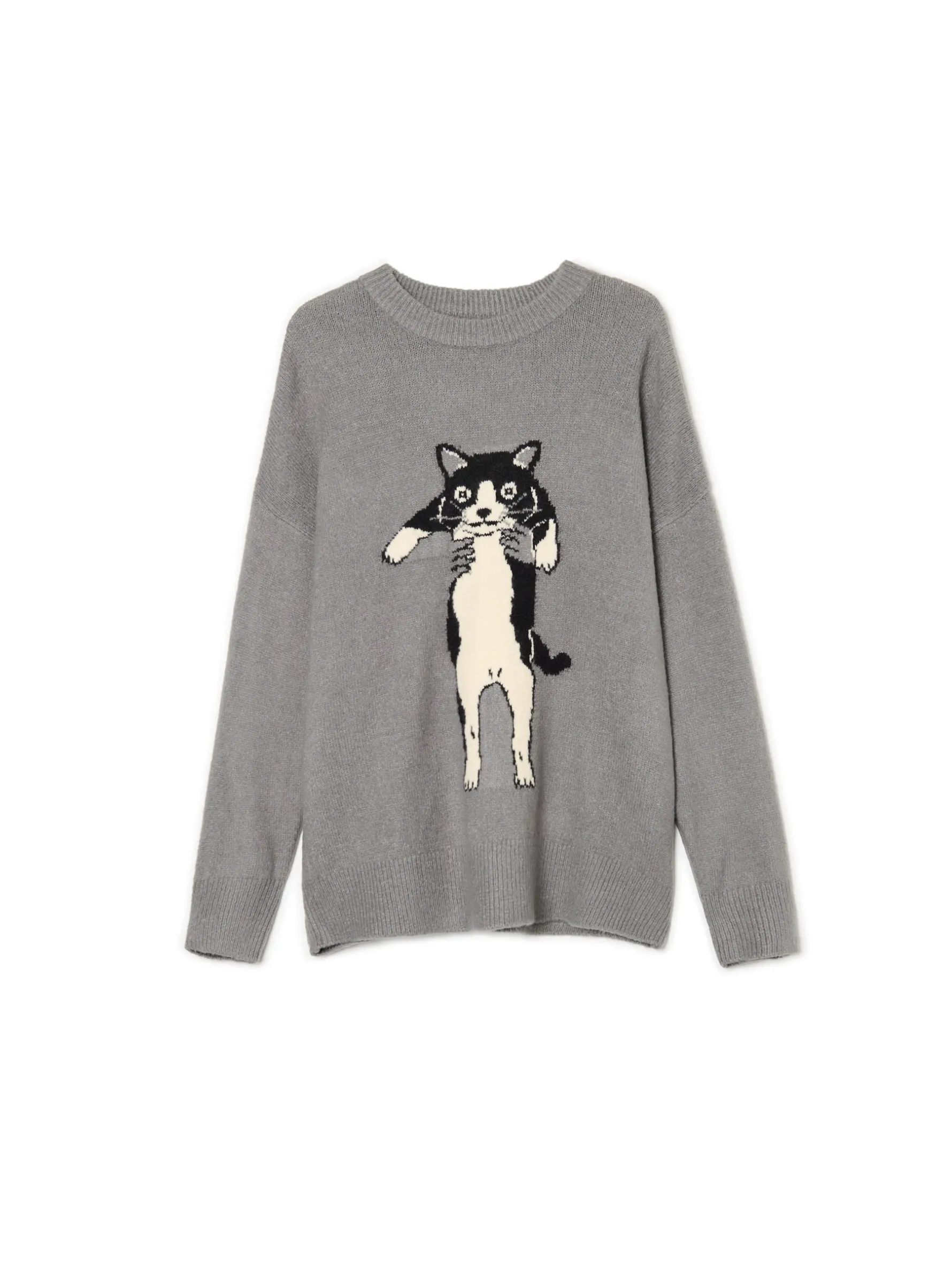 Kocyk, herbatka i ciepły sweter to idealny mix na jesień! Damski item uszyty z przyjemnej w dotyku dzianiny w szarym kolorze matchuje z tą wizją. Łap kotka i do koszyka! dzianina z domieszką elastycznych włókien regularny krój okrągły dekolt z lamówką długie rękawy z obniżoną linią ramion dół i rękawy wykończone prążkowanym ściągaczem z przodu grafika z kotem