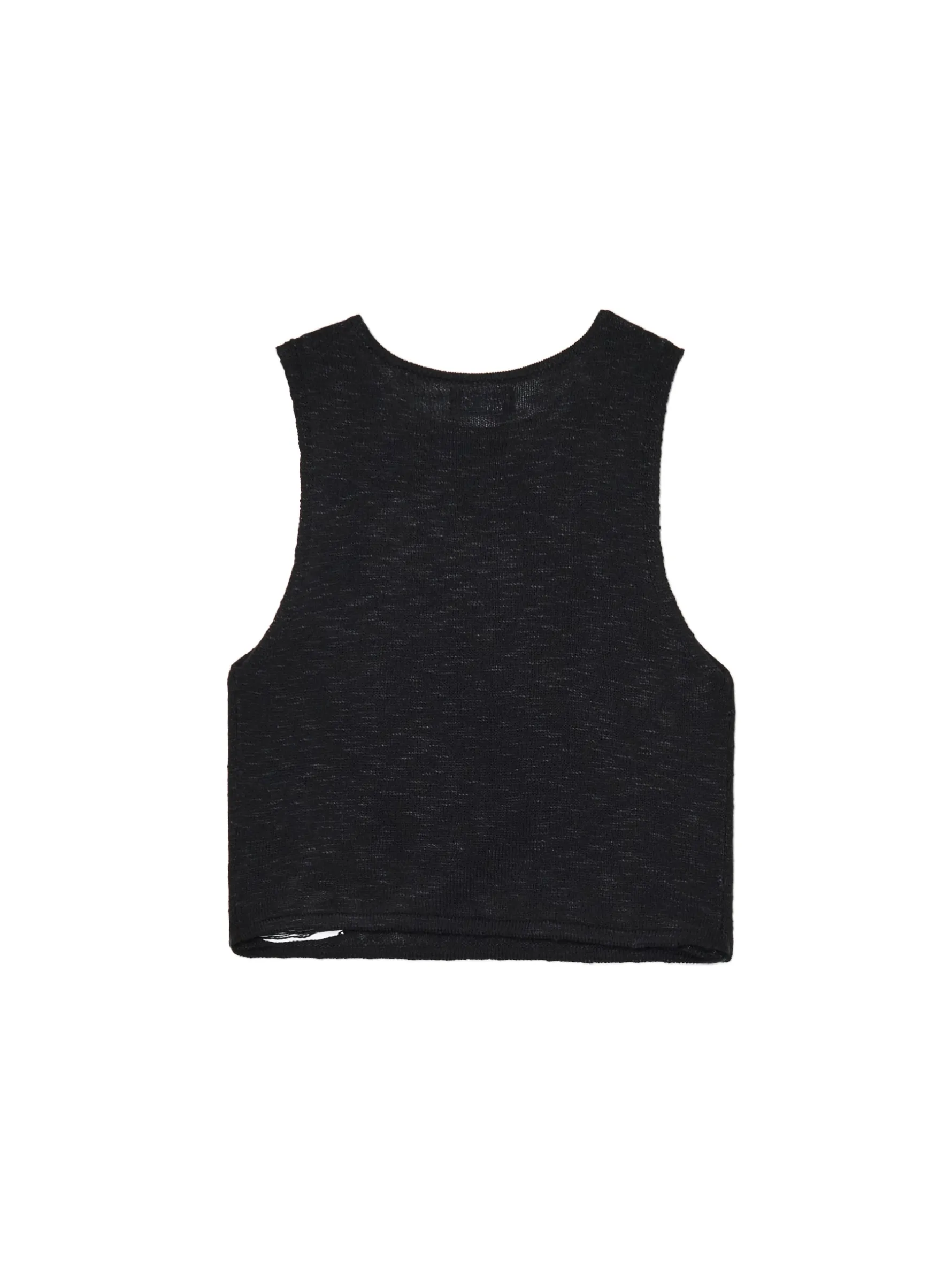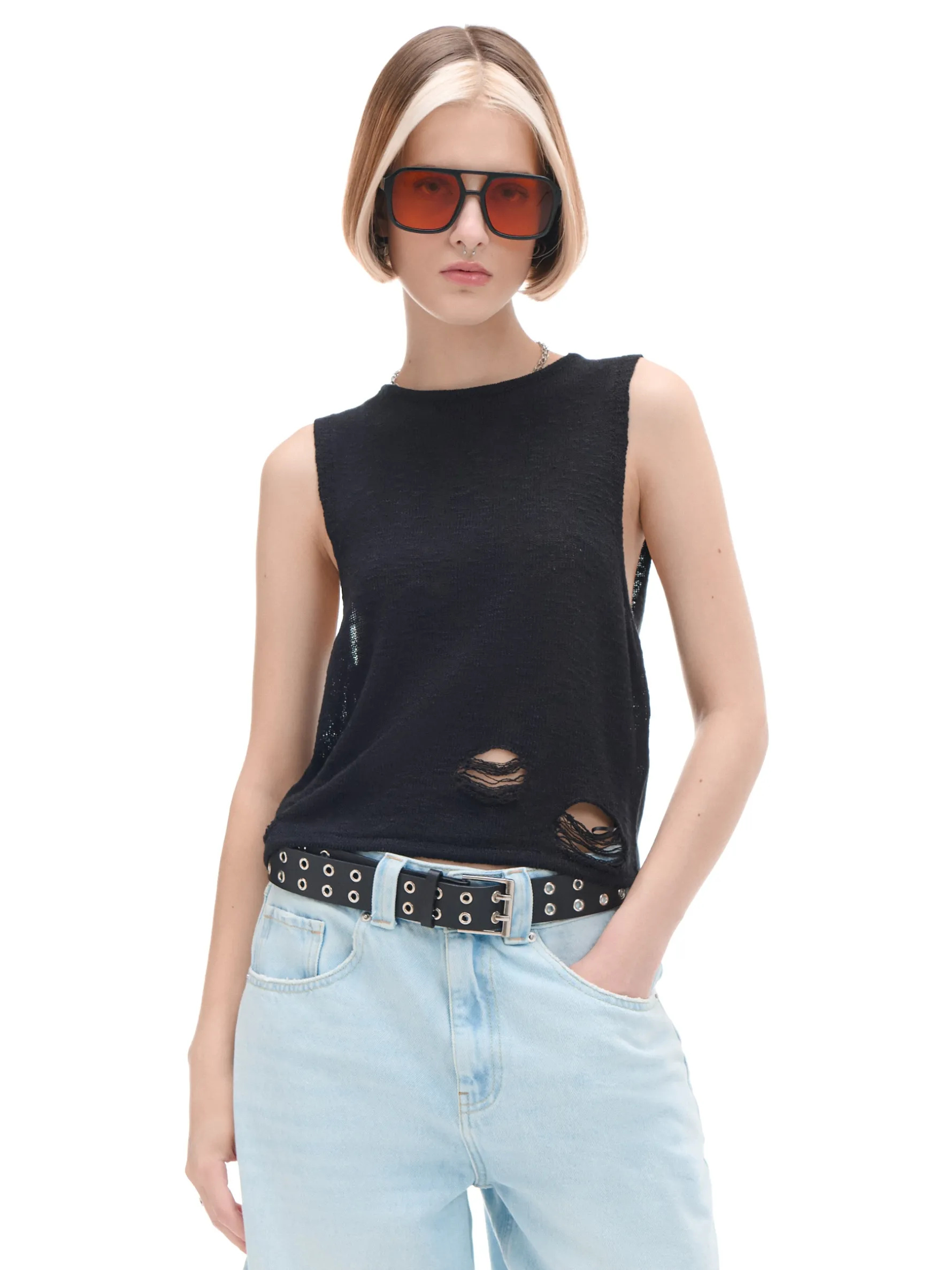 Damski czarny top typu tank uszyty z dzianiny imitującej sweter. Hitem tego modelu są delikatne przetarcia i prześwitujący materiał. wyjątkowo mocny, a jednocześnie wygodny materiał prosty krój szersze ramiączka przetarcia i postrzępienia