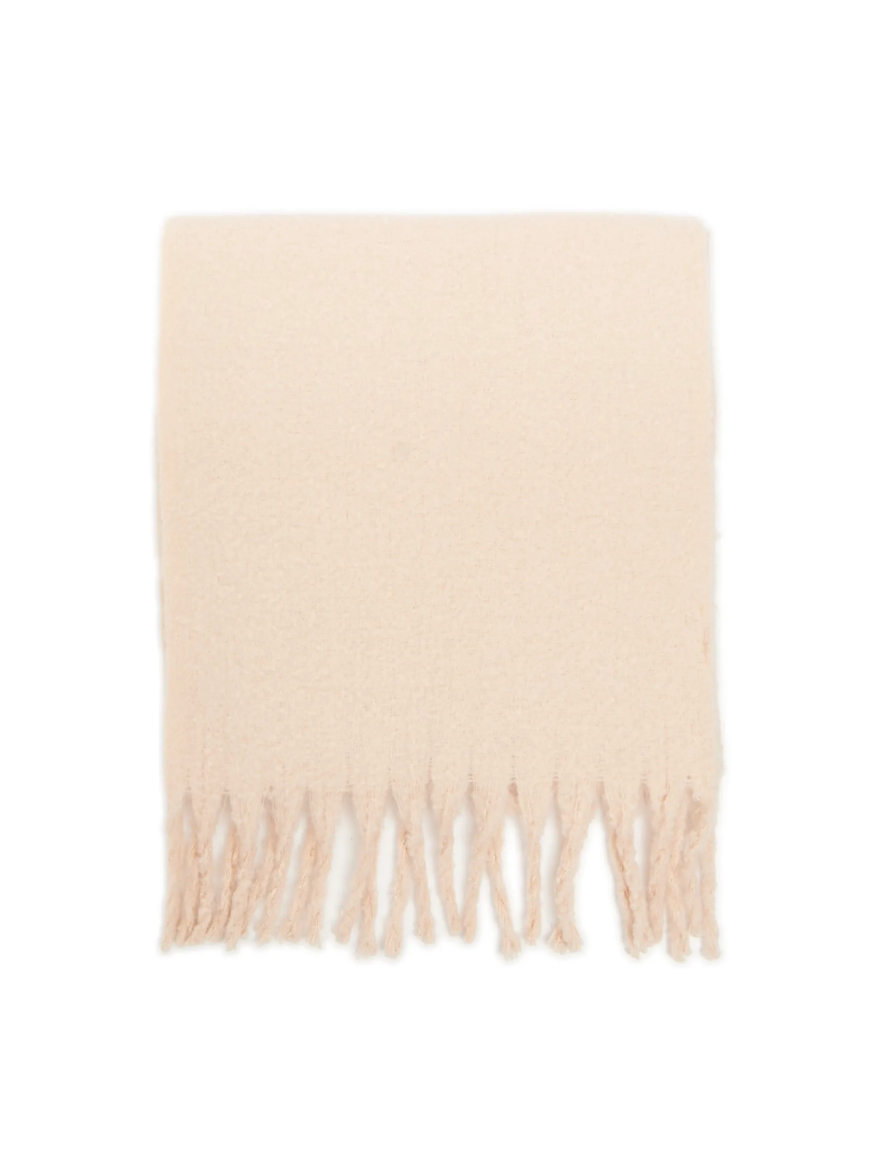 Beżowy szalik damski uszyty z miękkiej i ciepłej dzianiny, wykończony ozdobnymi frędzlami..
