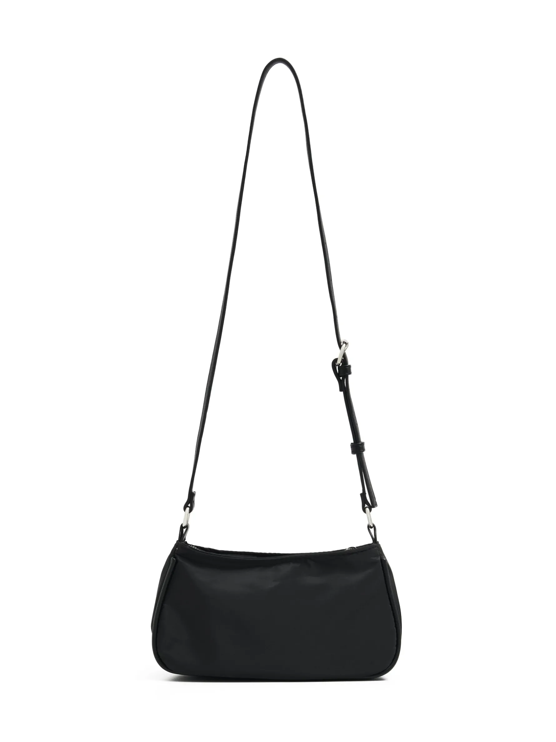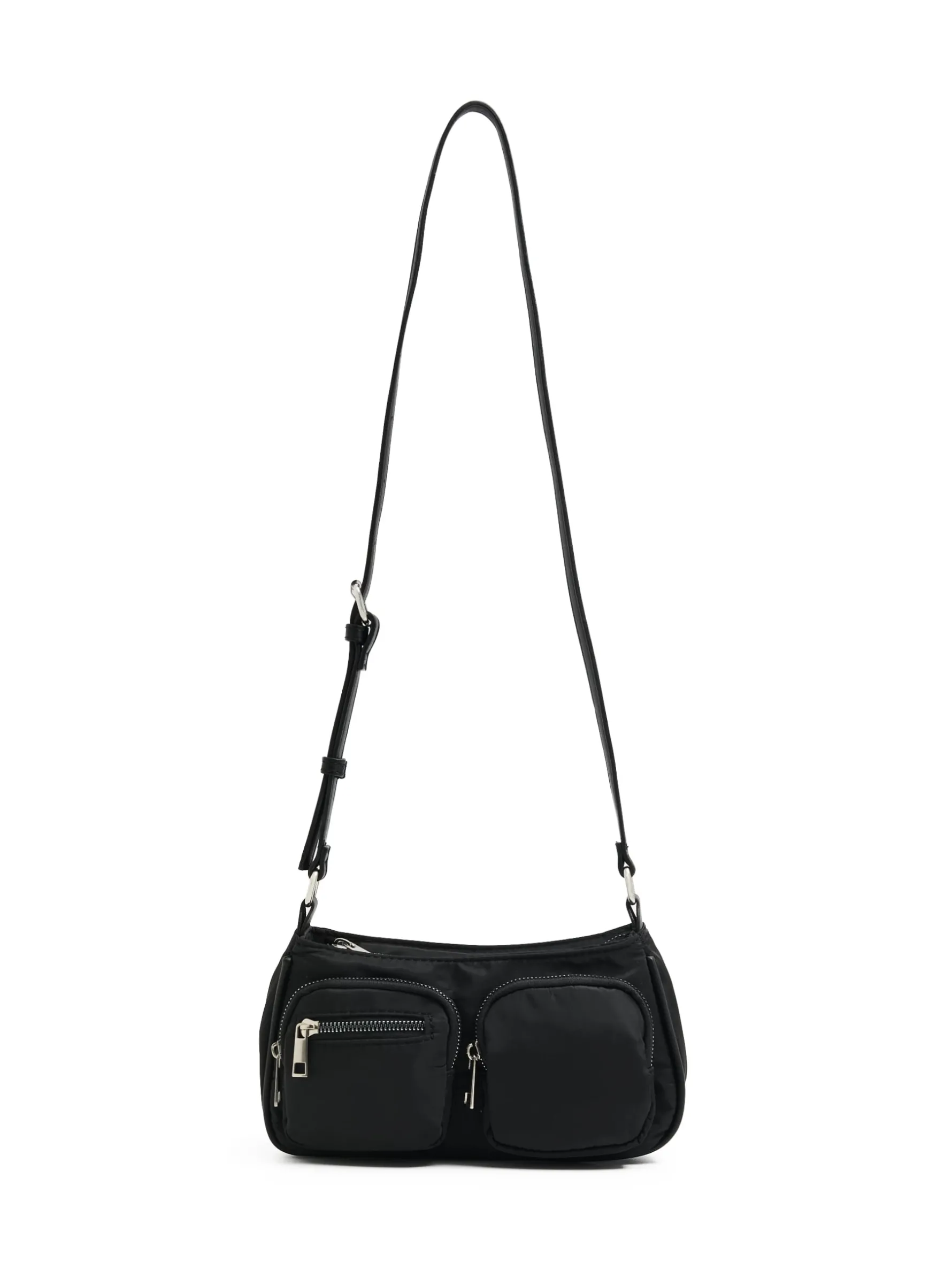 Czarna damska torebka typu crossbody z licznymi kieszeniami zewnętrznymi na zamek i jedną główną komorą. Casualowy dodatek do wielu stylizacji. mała torebka typu crossbody pasek z regulacją długości główna komora z zapięciem na zamek wewnątrz otwarta kieszeń liczne kieszenie zewnętrzne na zamek metalowe detale przy zewnętrznej kieszeni