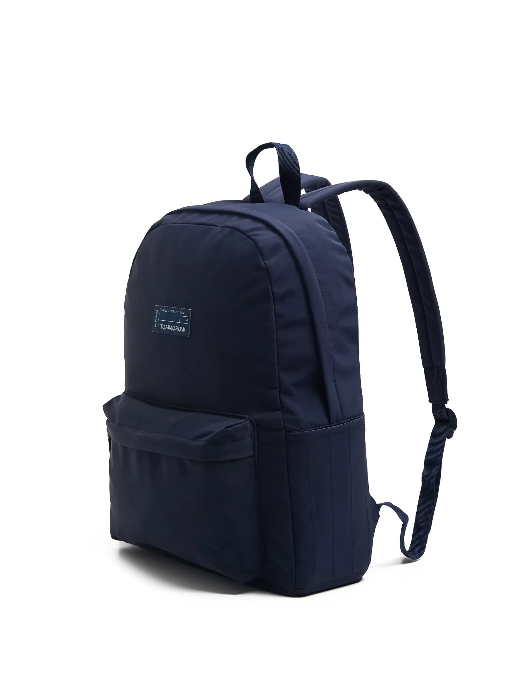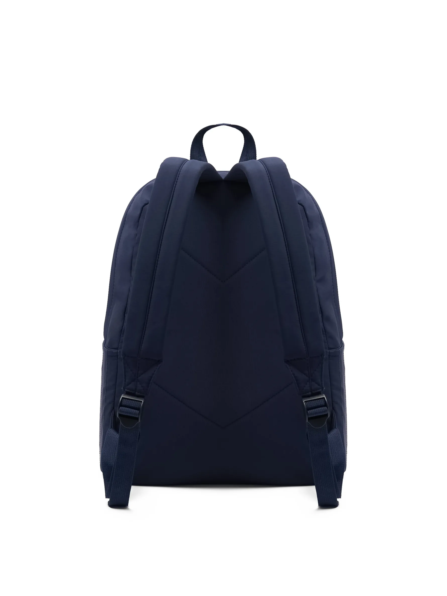Klasyczny damski plecak, uszyty z wytrzymałej granatowej tkaniny. szelki z regulacją długości główna komora z zapięciem na zamek dodatkowa kieszeń zewnętrzna z zapięciem na zamek wewnętrzna kieszeń na laptopa pojedynczy uchwyt u góry z przodu minimalistyczna naszywka z napisami Wymiary produktu: 43 x 32 x 13 cm