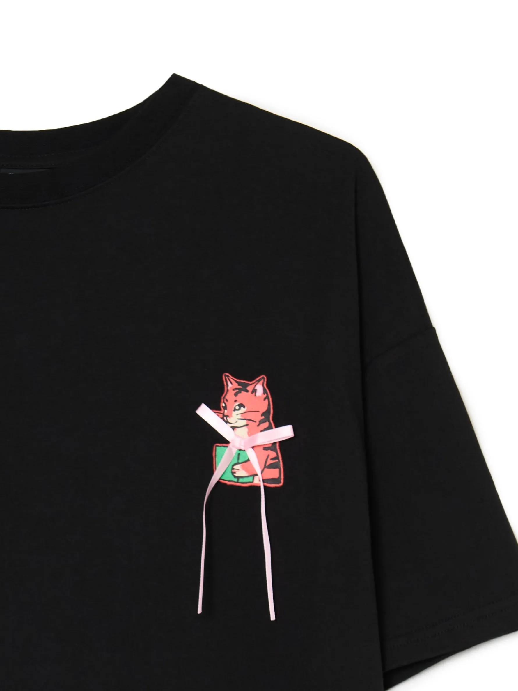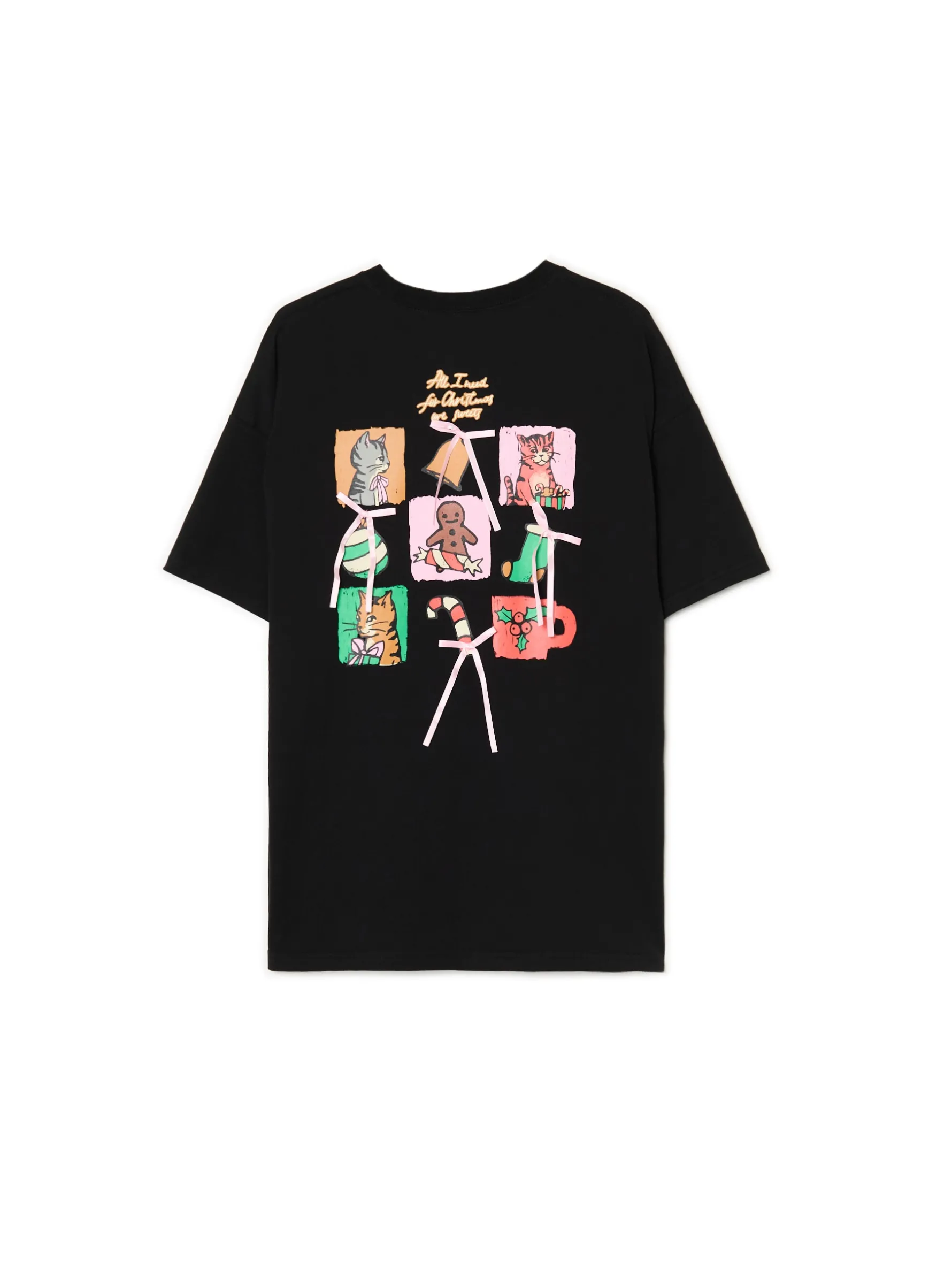 Bożonarodzeniowy merch już w sprzedaży! Damski czarny T-shirt uszyty z bawełnianej dzianiny ze świątecznymi naszywkami po obu stronach. Idealny casual na rodzinne meetingi! 100% bawełny oversizowy krój okrągły dekolt z lamówką krótkie, szerokie rękawy ozdobne naszywki z motywem Xmas