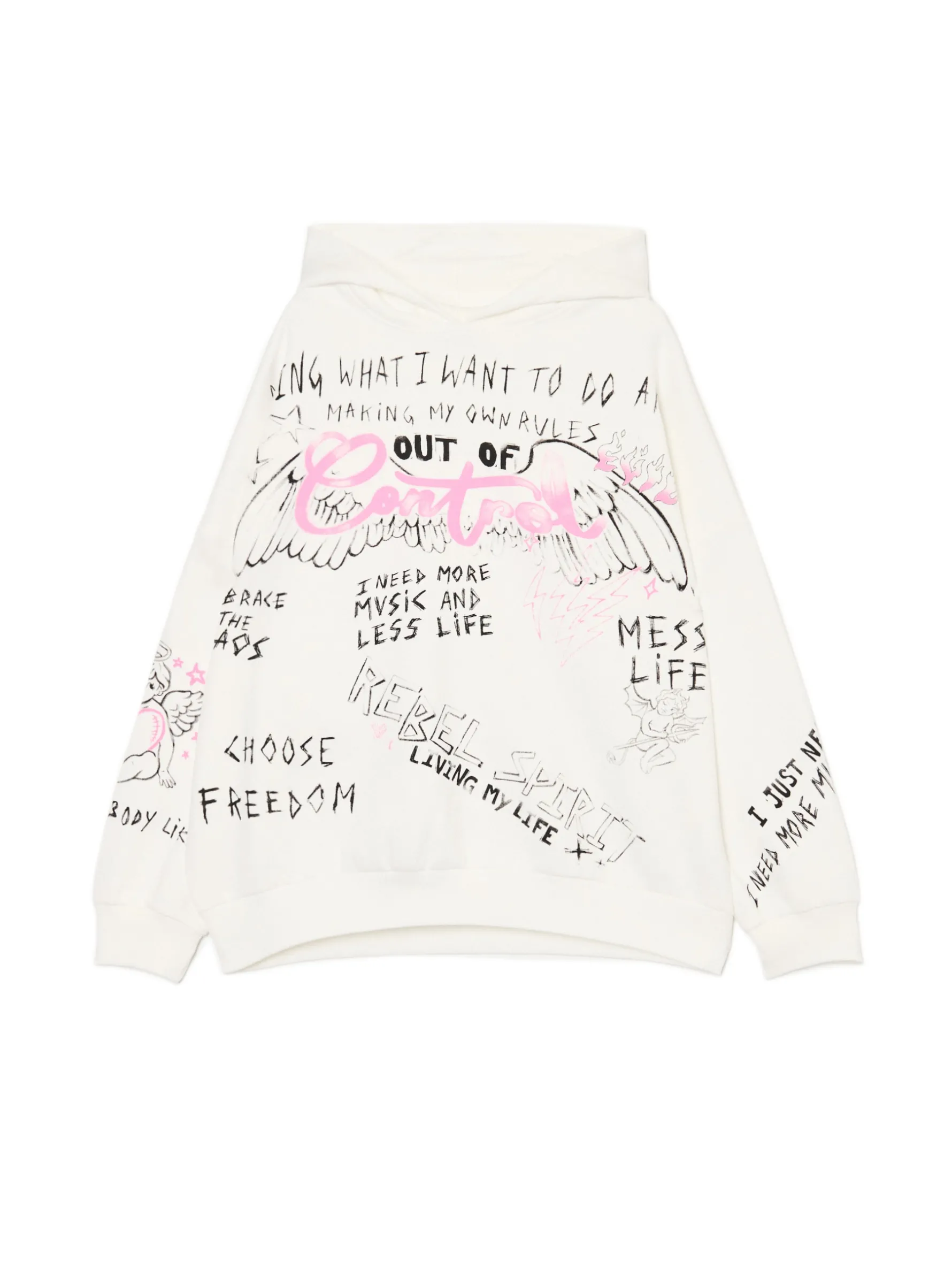 Damska bluza z kapturem o kroju oversize, uszyta z mieszanki dzianin z nadrukiem na przodzie i rękawach, jak ze szkolnego zeszytu. Otuli Cię w chłodniejsze dni! uszyta z miękkiej dzianiny z bawełną krój oversize obszerny kaptur długie, swobodne rękawy dół wykończony ściągaczem oryginalny print Ten produkt należy do kolekcji UNISEX – zalecamy wybranie mniejszego rozmiaru niż zazwyczaj, jeśli chcesz uniknąć efektu oversize.