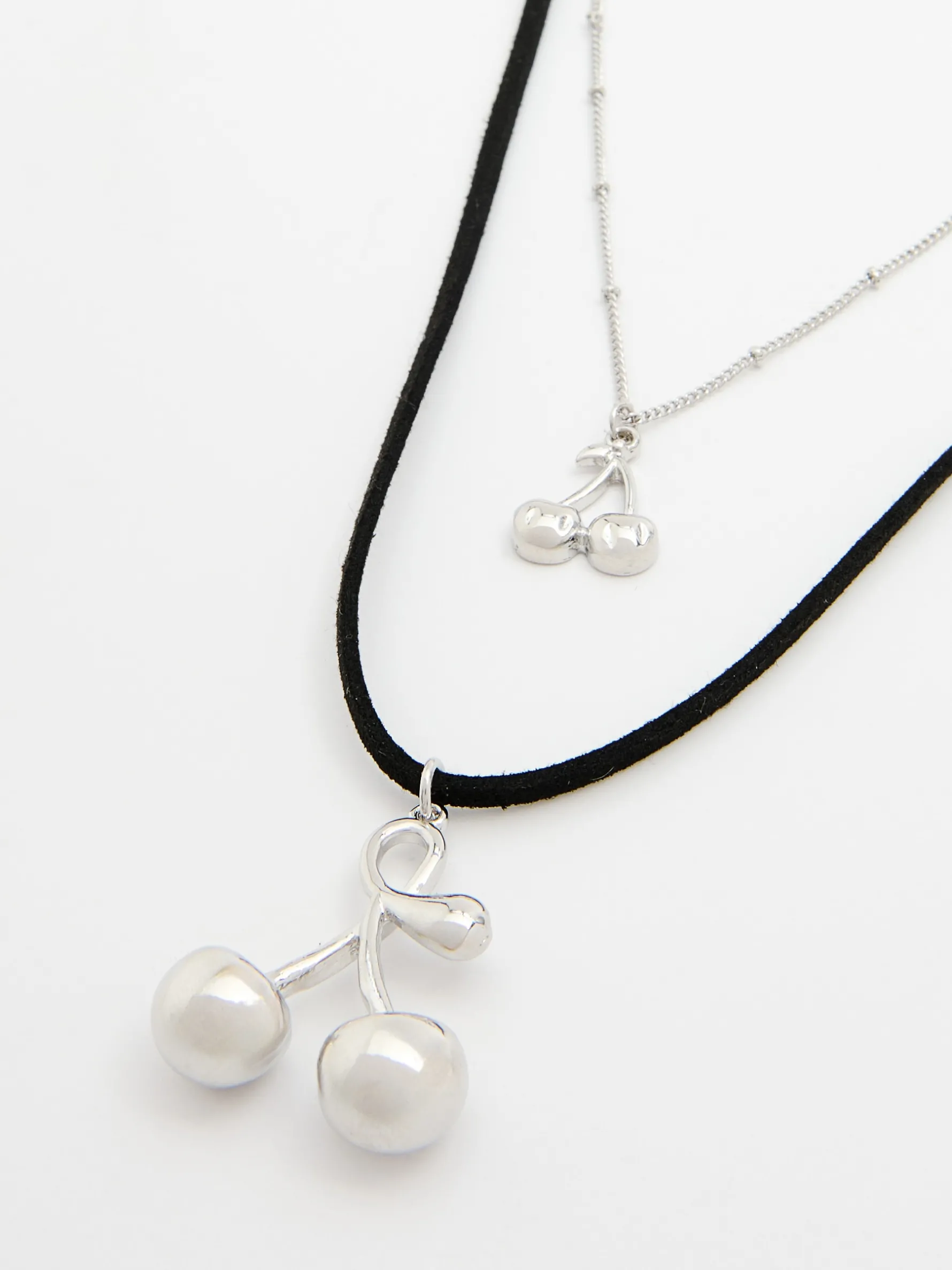Damski naszyjnik złożony z rzemykowego i srebrnego łańcuszka. Zestaw uzupełniono o dwie zawieszki z wiśniowym motywem.