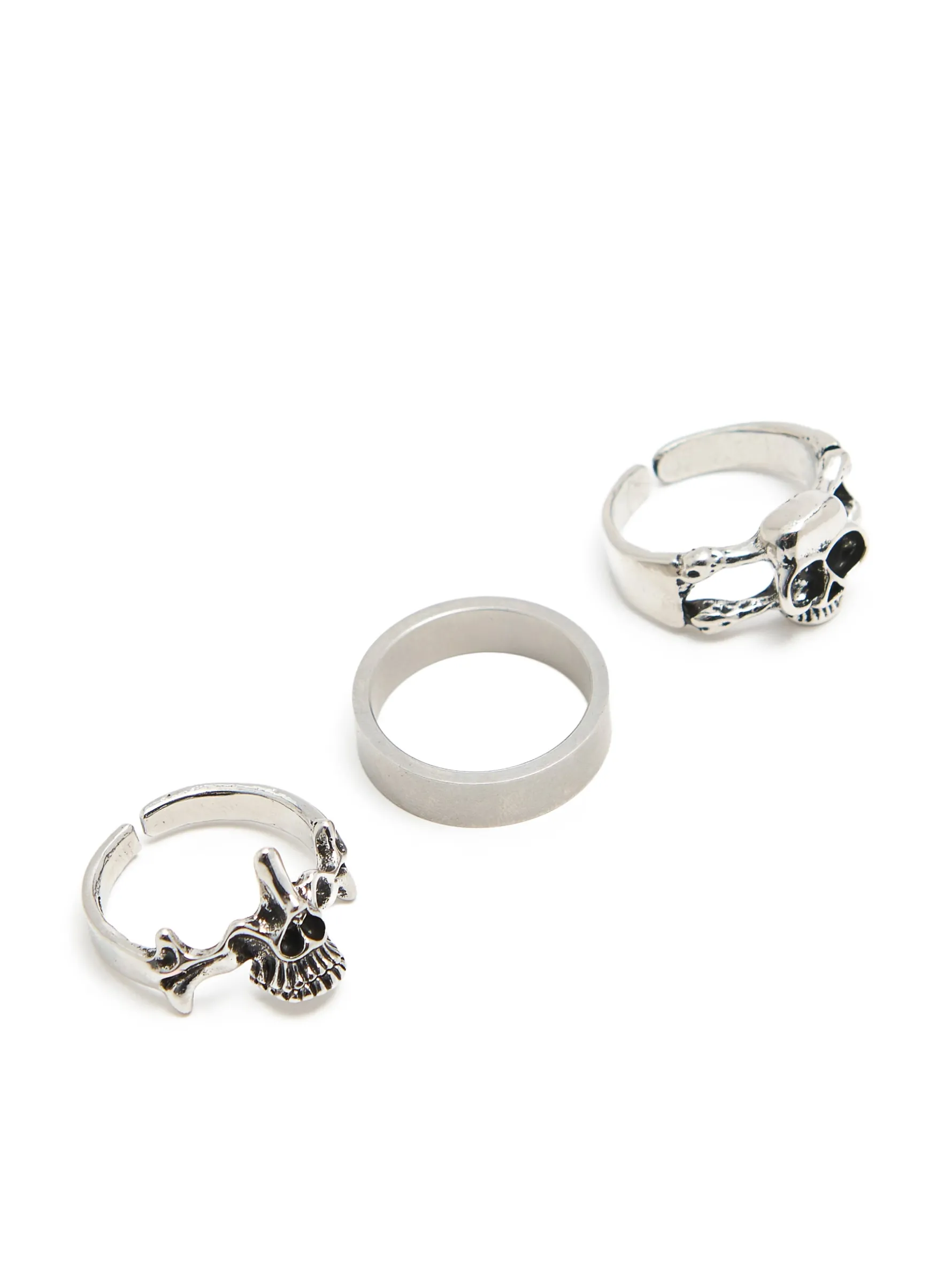 Zestaw trzech męskich pierścionków w kolorze srebrnym, w tym jeden w basicowym stylu i dwa pozostałe z motywem czaszek w różnych wersjach.