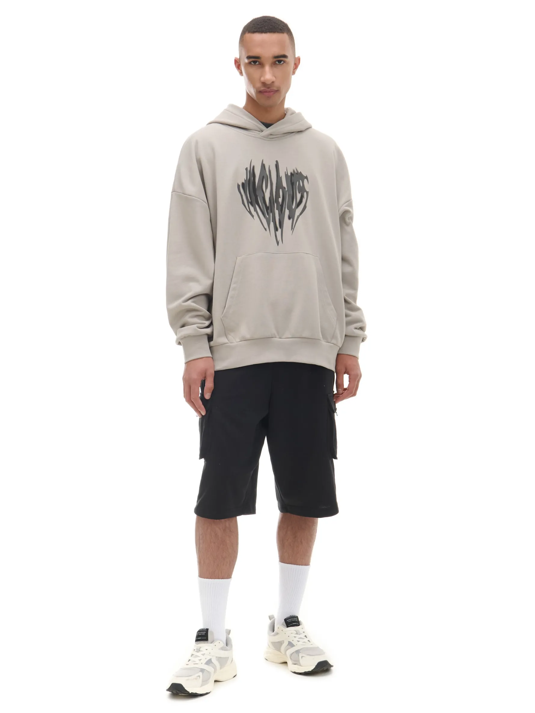 Beżowa bluza męska z kapturem, zakładana przez głowę. Uszyta z mieszanki dzianin z solidną bawełną french terry. Na przodzie kieszeń kangurka i nadruk z efektem sprania. dzianinowy materiał z bawełną krój oversize szeroki kaptur dół i rękawy wykończone ściągaczem duża kieszeń typu kangurka z przodu oryginalny print Gramatura: 340 Wzrost modela: 185 cm
