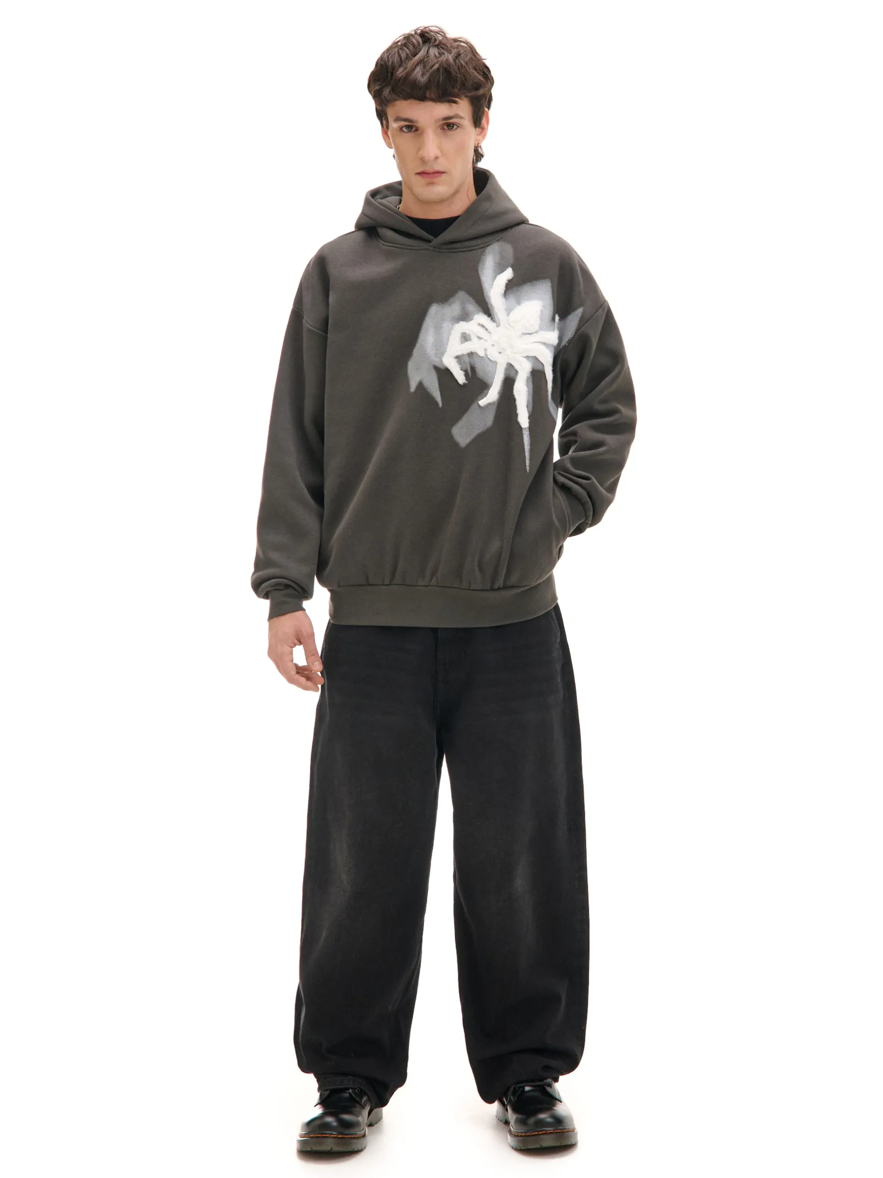 Casualowa bluza na Halloween? Check! Polecamy męską hoddie uszytą z przyjemnej w dotyku mieszanki dzianin w kolorze szarym. Na przodzie duża aplikacja w kontrastowym, białym kolorze w kształcie owłosionego pająka. Creepy i sztosowo! dzianinowy materiał z bawełną swobodny, luźny krój miękki kaptur długie rękawy z obniżoną linią ramion dwie kieszenie boczne dół i rękawy wykończone prążkowanym ściągaczem z przodu aplikacja Halloween