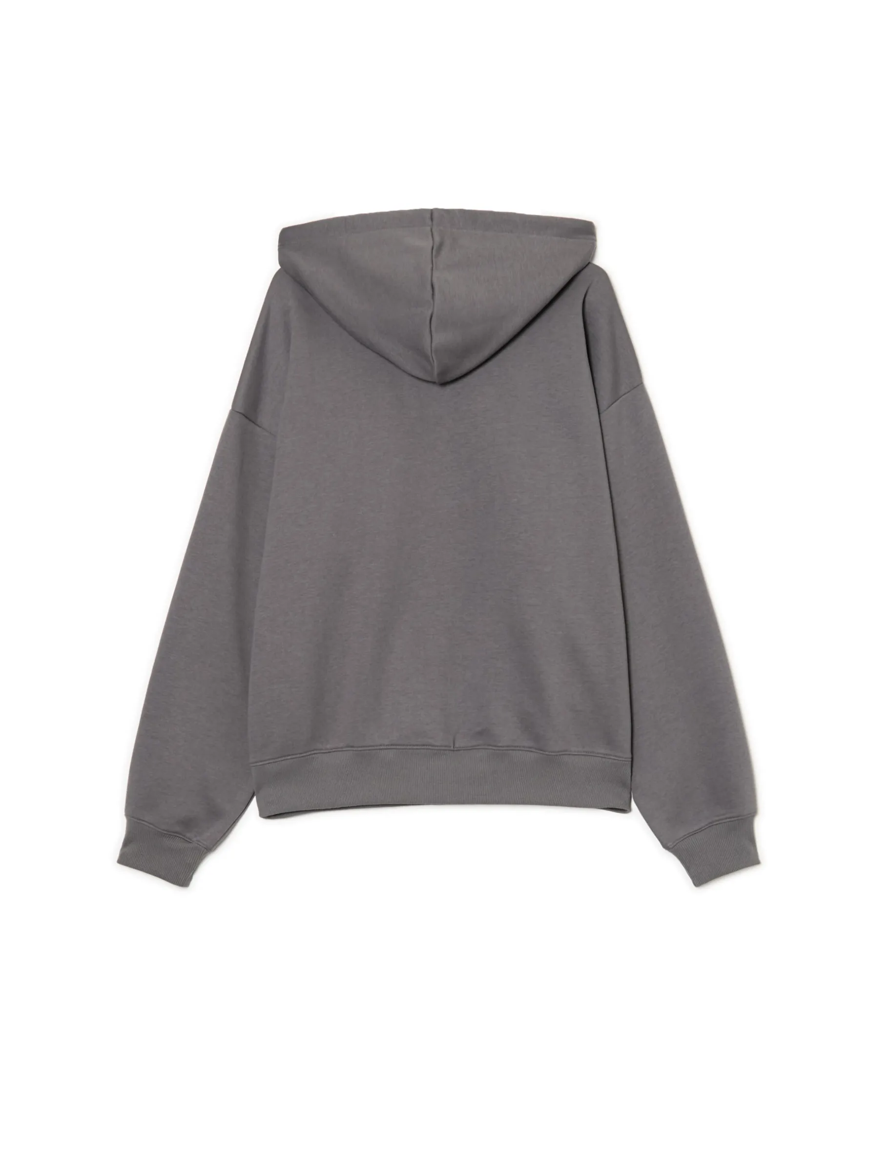 Ciepła damska bluza typu hoodie uszyta z mieszanki dzianin w szarym kolorze. Na przodzie kolorowy nadruk w stylu graffiti. Świetnie fituje ze skórzanymi dodatkami. swobodny, luźny krój lekkie ocieplenie miękki kaptur z troczkami długie, proste rękawy dół i rękawy wykończone prążkowanym ściągaczem kolorowy fotoprint z przodu