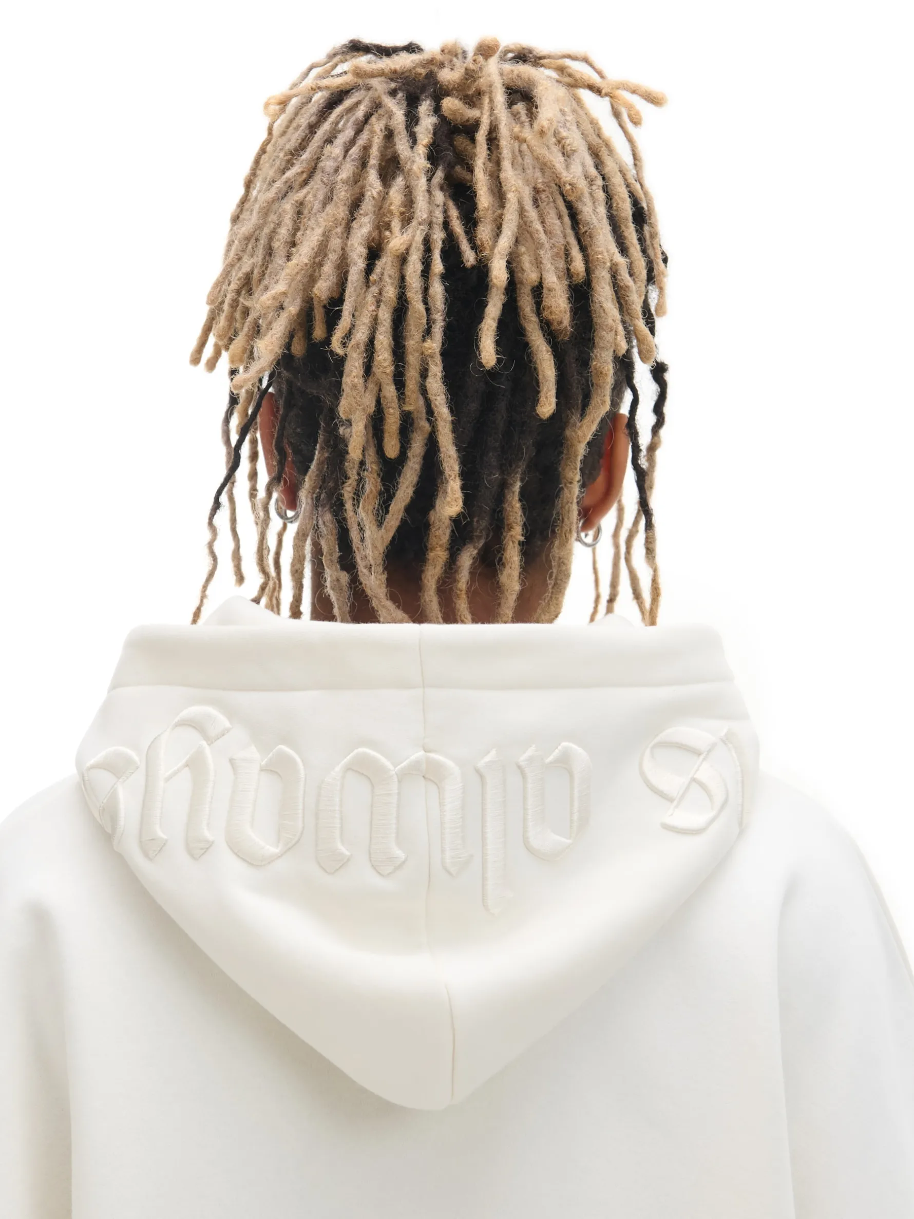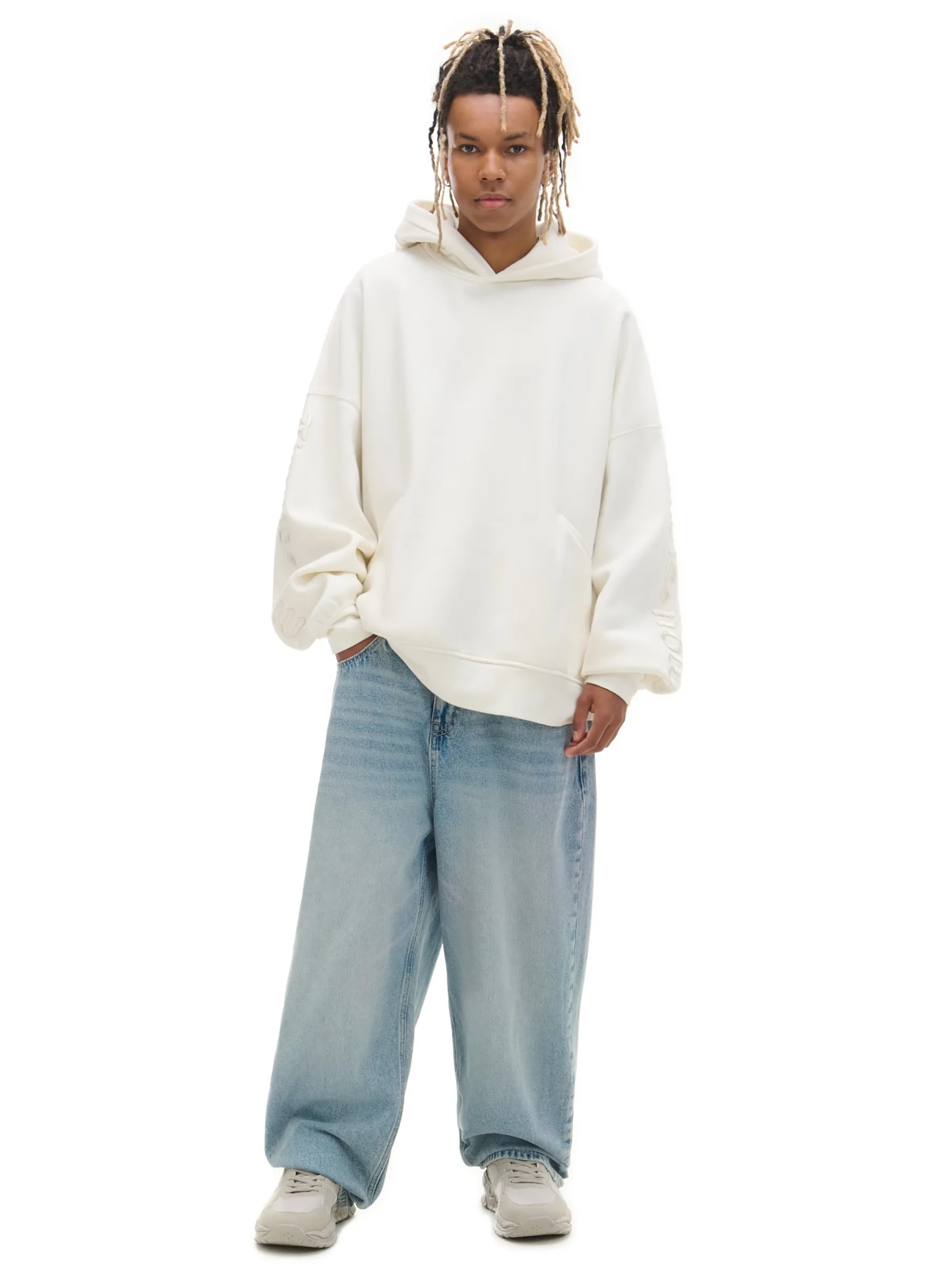 Męska bluza z kapturem uszyta z mieszanki dzianin z dodatkiem bawełny fleecy. Wyjątkowe w tym modelu są dekoracyjne hafty w formie napisów na rękawach i kapturze. uszyta z miękkiej dzianiny z bawełną obszerny krój boxy miękki kaptur dół i mankiety wykończone ściągaczami dwie kieszenie po bokach ozdobne naszywki na rękawach i kapturze