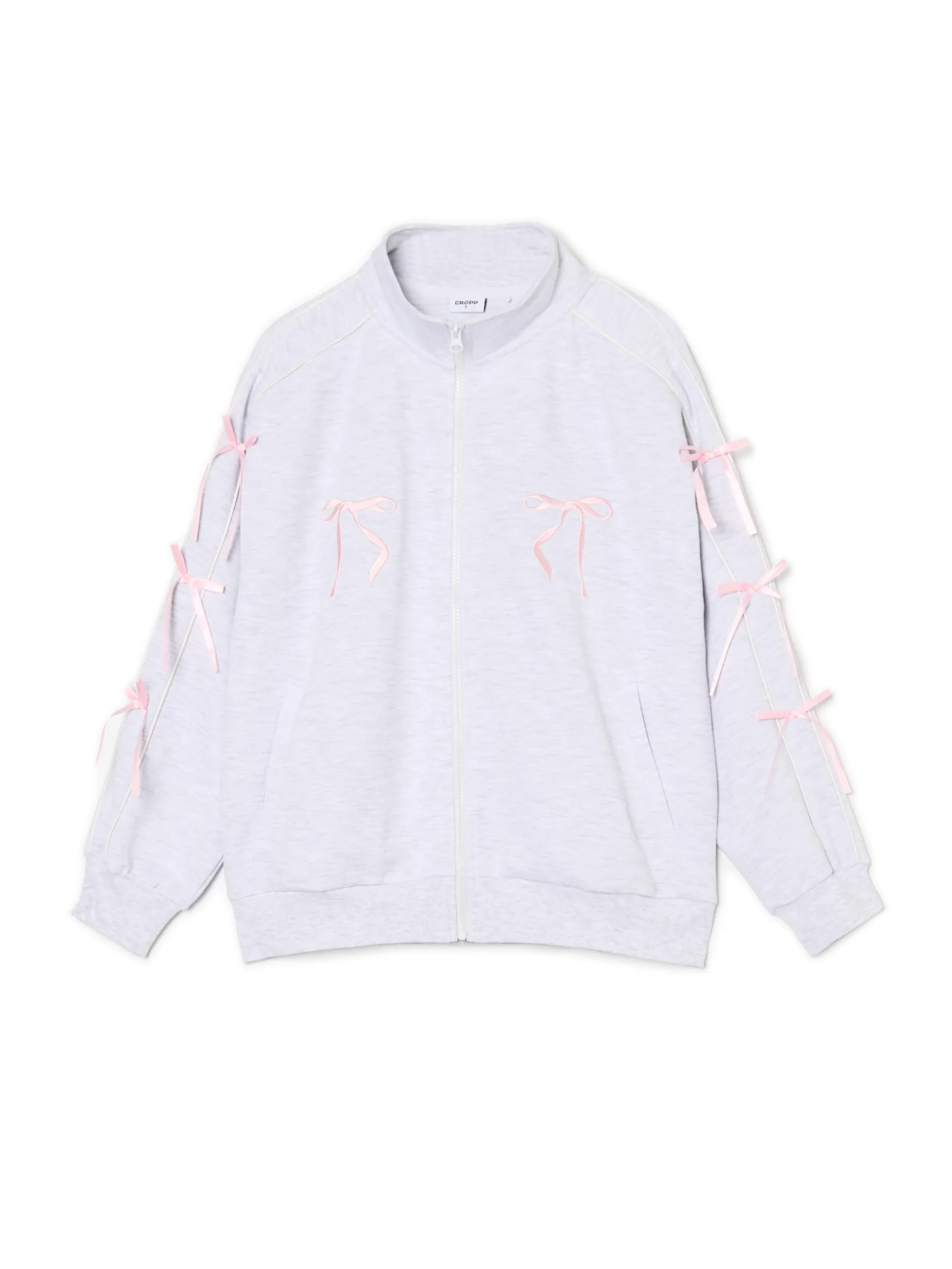 Rozpinana damska bluza ze stójką uszyta z mieszanki dzianin w jasnoszarym odcieniu. Dekoracyjne lamówki i kokardki nadają jej uroczego charakteru. Łap dla siebie albo dla Bestie!