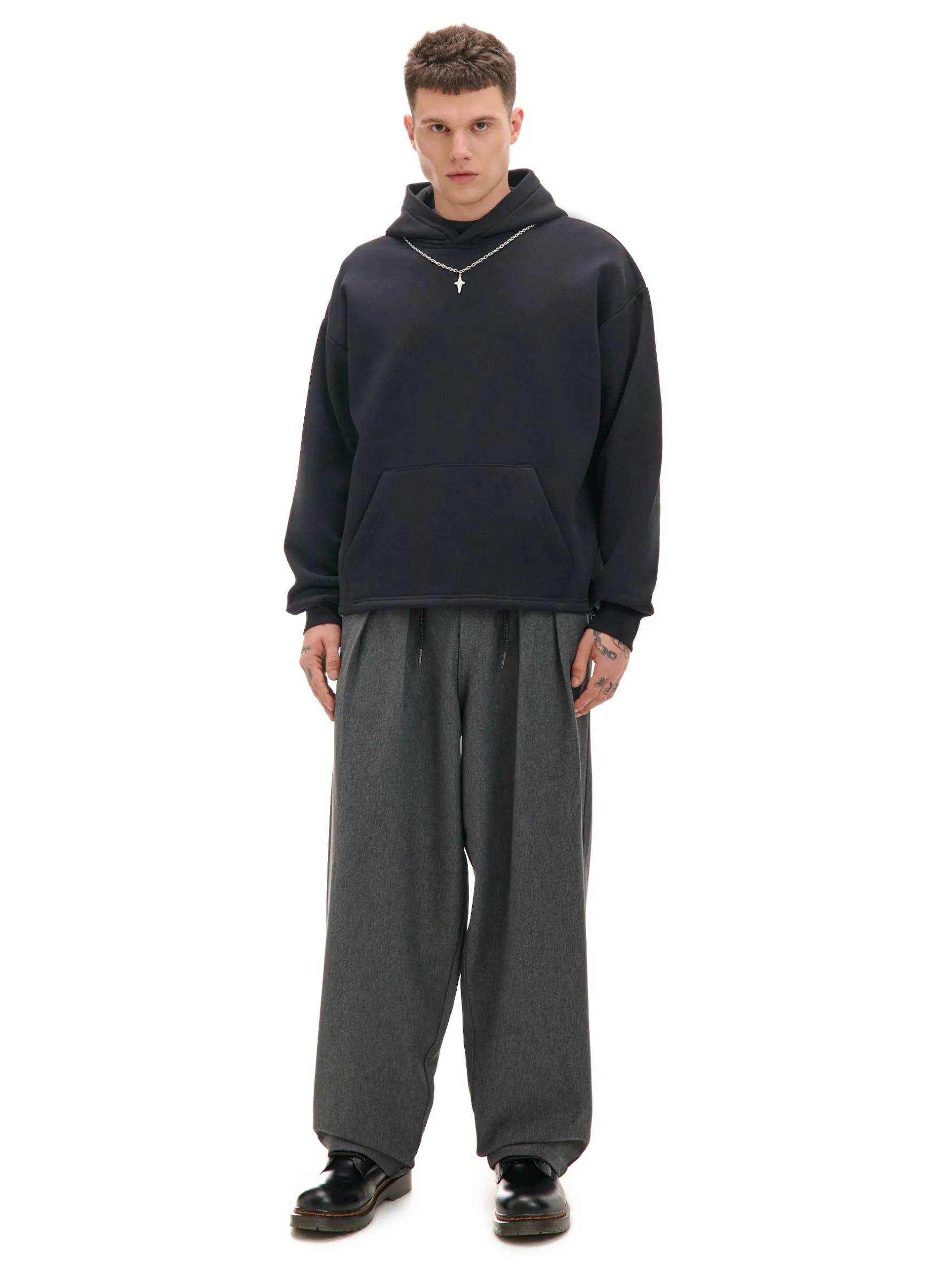 Klasyczna męska bluza z naszyjnikiem w zestawie, wykonanym ze srebrnego materiału z zawieszką. Ta hoodie uszyta jest z miękkiej mieszanki dzianin w czanym kolorze. Z przodu kieszeń kangurka na zmęczone ręce po całym dniu. dzianinowy materiał z bawełną swobodny, luźny krój miękki kaptur długie rękawy wykończone elastycznym ściągaczem lekko obniżona linia ramion kieszeń kangurka na przodzie gładkie wykończenie brzegów ozdobny metalowy łańcuszek z zawieszką Model prezentuje produkt w rozmiarze M/L. Wzrost modela: 185 cm