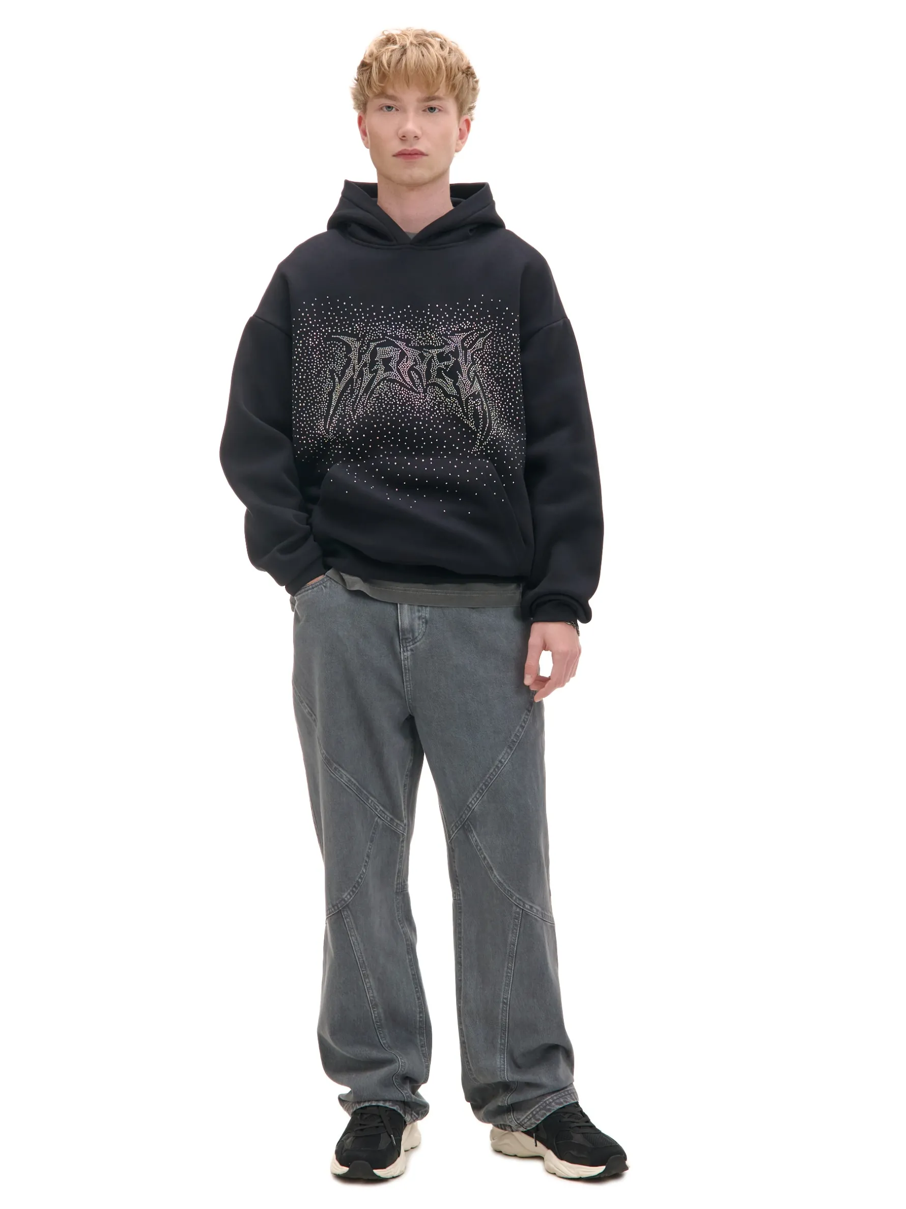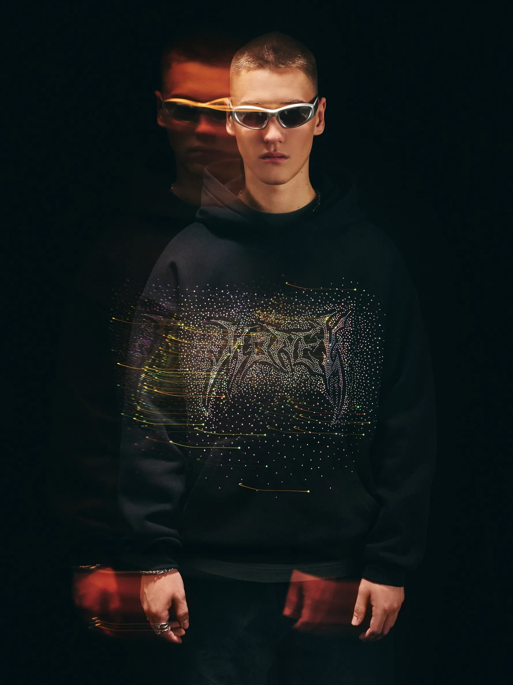 Męska czarna bluza uszyta z miękkiej mieszanki dzianin z dodatkiem bawełny fleecy. Na przodzie aplikacja z napisem 'money’ wykonanym z drobnych dżetów. Hajs się musi zgadzać! dzianinowy materiał z bawełną swobodny, luźny krój miękki kaptur dół i rękawy wykończone prążkowanym ściągaczem kieszeń kangurka na przodzie z przodu aplikacja delikatny efekt sprania