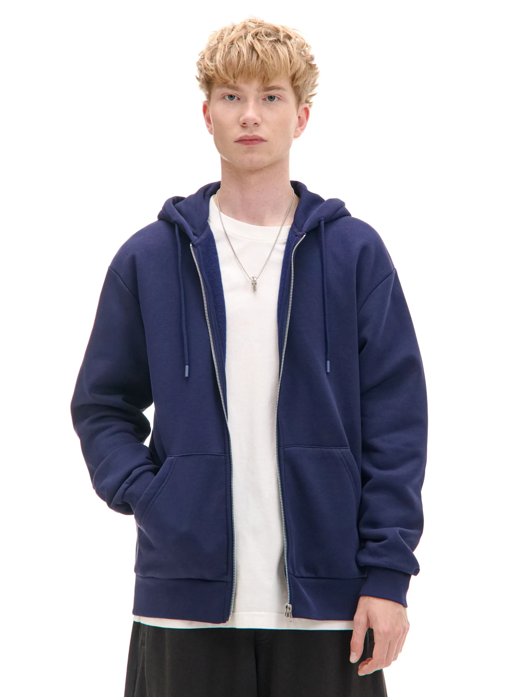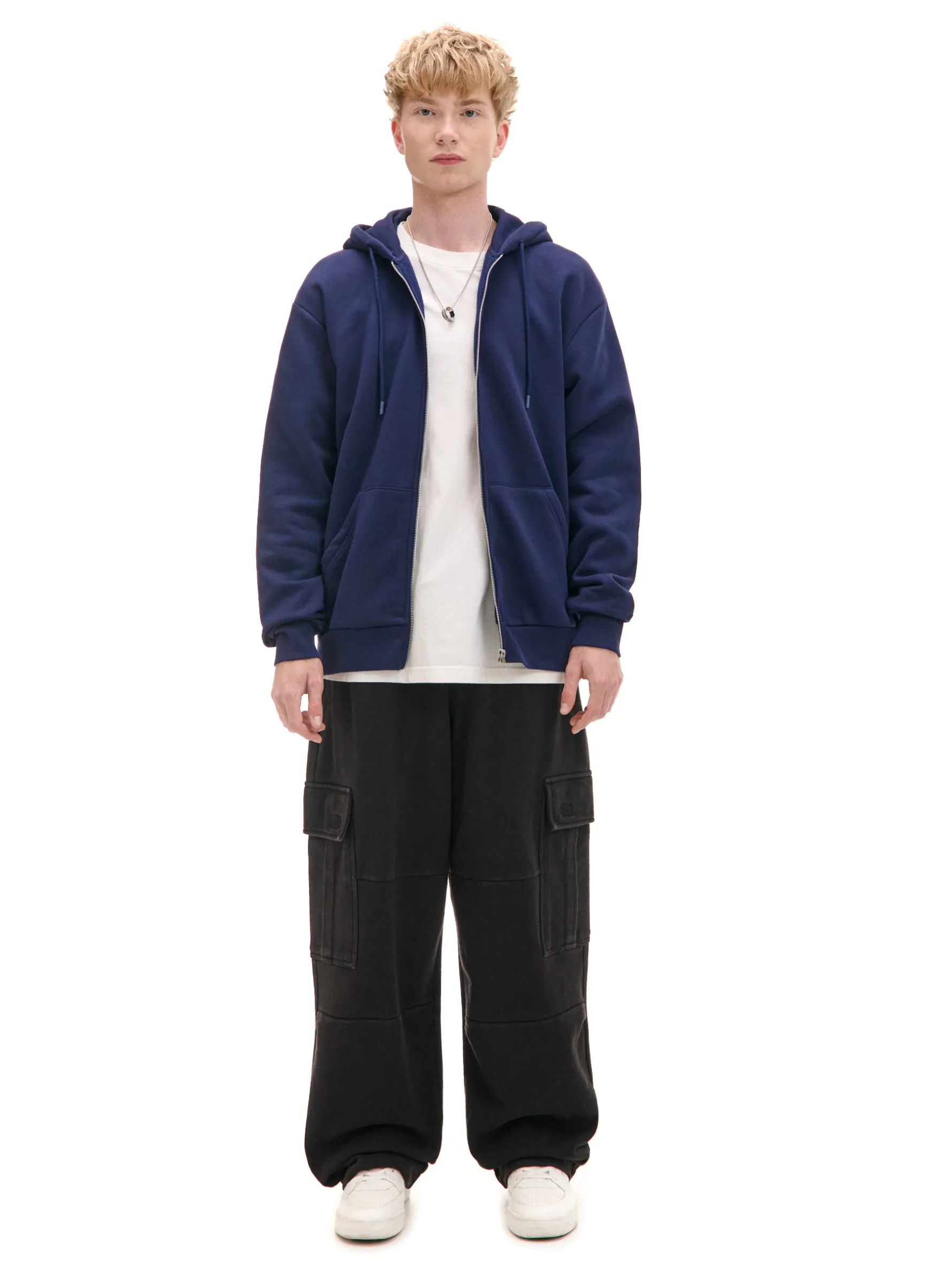 Prosta męska bluza dresowa, zapinana na suwak. Uszyta z ciemnej mieszanki dzianin o wysokiej zawartości bawełny. Idealny basic na jesień! wygodny, regularny krój z przodu zapięcie na suwak kaptur regulowany troczkami rękawy i dół zakończone ściągczem dwie kieszenie z przodu mały haft na rękawie z napisem CROPP