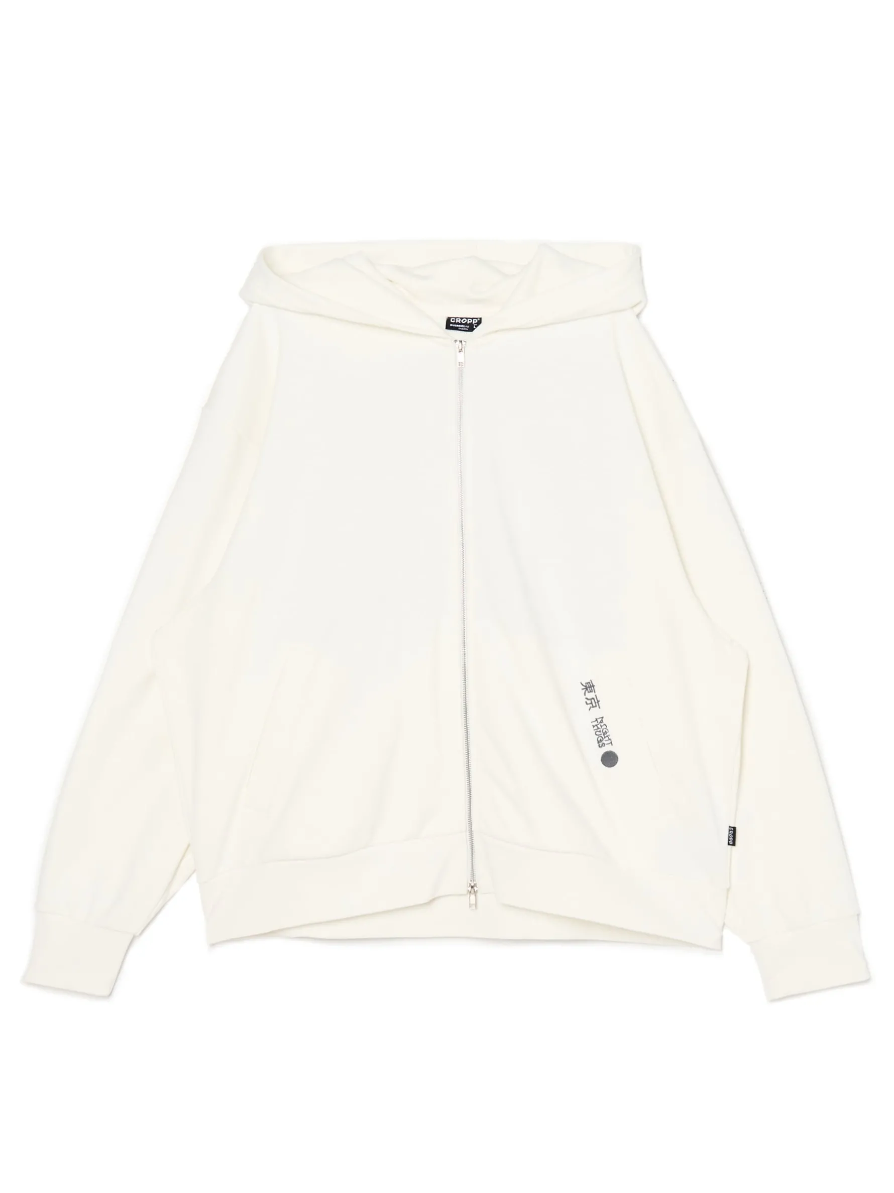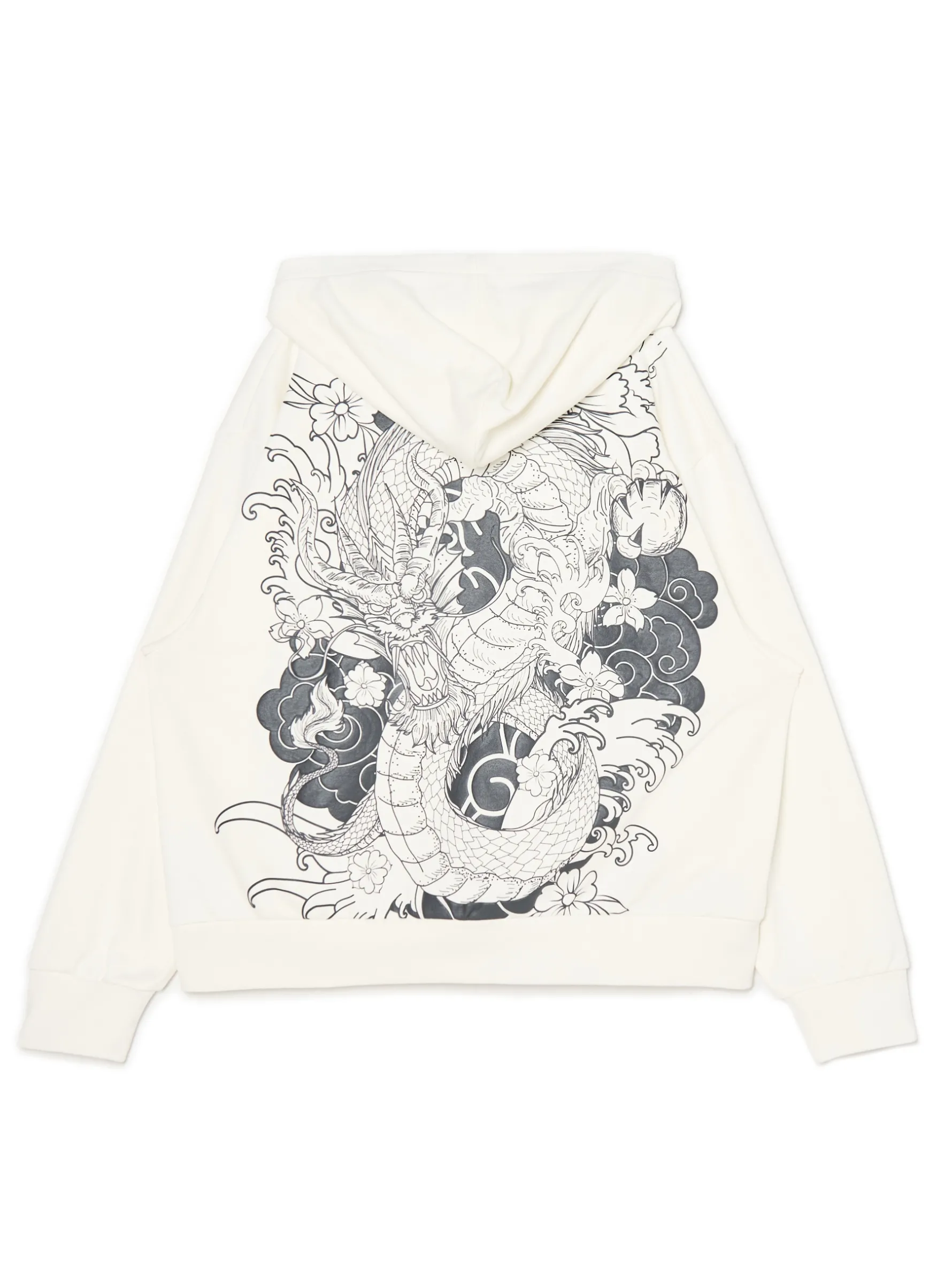 Męska bluza z kapturem, uszyta z dzianiny z dodatkiem bawełny w kremowym kolorze. Wyróżnia się podwójnym zapięciem i efektownym nadrukiem na plecach. dzianinowy materiał z bawełną luźny krój zapięcie na podwójny zamek szeroki kaptur dół i mankiety wykończone ściągaczami duży nadruk z motywem smoka Wzrost modela: 185 cm