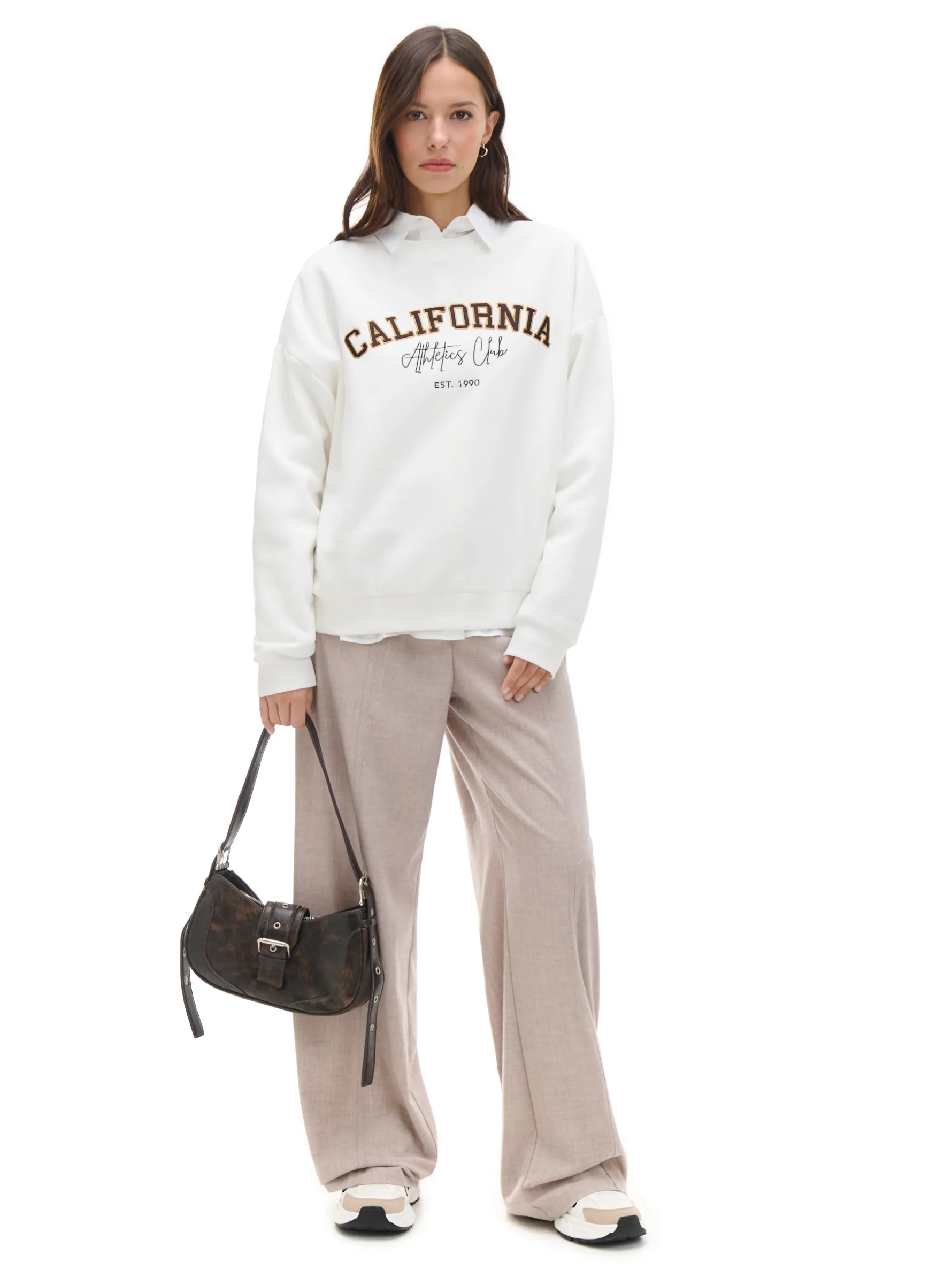 Damska bluza typu college uszyta z dzianiny z dodatkiem miękkiej bawełny fleecy. Na przodzie ozdobne naszywki w formie tekstowej. bluza typu college, uszyta z dzianiny o wysokiej zawartości bawełny dekolt, dół i rękawy z dzianinowym ściągaczem ozdobne naszywki z przodu