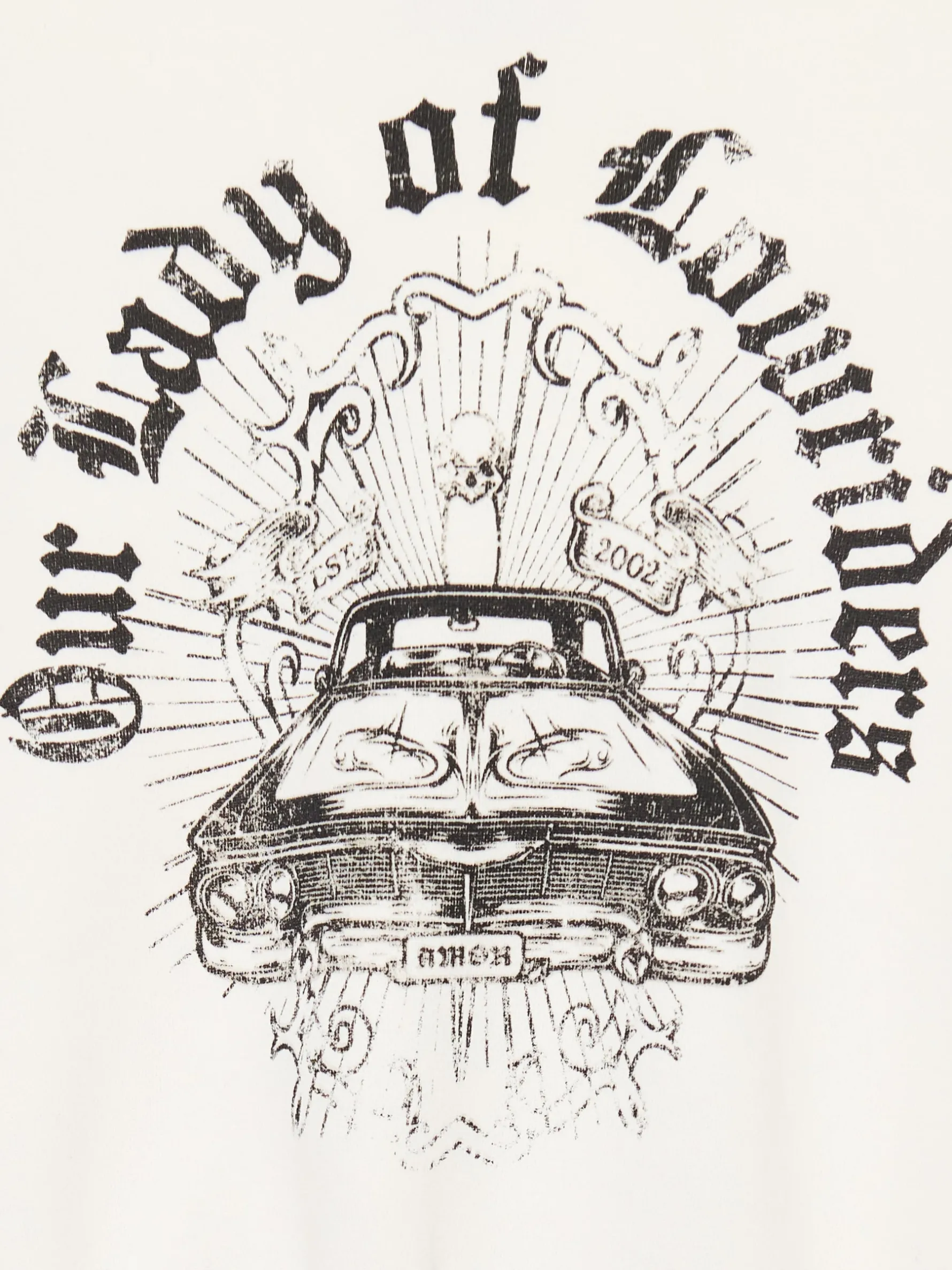 Damska bluza typu hoodie crop, uszyta z mieszanki dzianin w jasnym kolorze. Ten item wyróżnia szeroki kaptur, krótki krój i print z delikatnym efektem sprania. dzianinowy materiał z bawełną krótszy krój obszerny kaptur długie rękawy z obniżoną linią ramion dół i mankiety wykończone ściągaczami kontrastowy nadruk z przodu Wzrost modelki: 172 cm