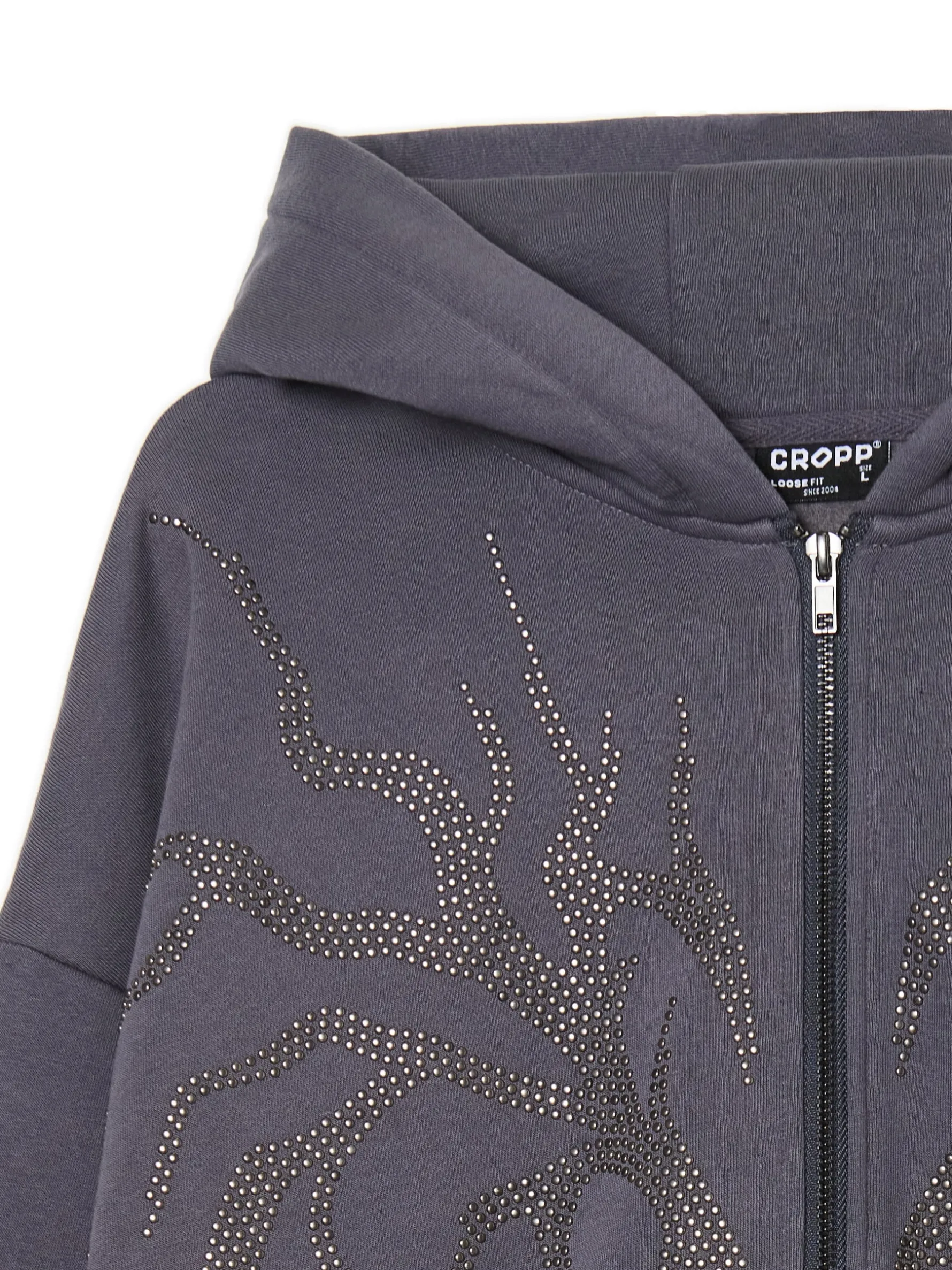 Solidna męska bluza w ciemnoszarym odcieniu z dużą, cekinową aplikacją na przodzie. Uszyta z mieszanki dzianin z dodatkiem miękkiej bawełny fleecy. Jest wygodna, luźna i delikatnie sprana, czyli must have hoodie w streetowym stylu! dzianinowy materiał z bawełną swobodny, luźny krój miękki kaptur zapinana na zamek na całej długości długie rękawy z obniżoną linią ramion dwie kieszenie po bokach dół i rękawy wykończone prążkowanym ściągaczem z przodu aplikacja efekt sprania na całości Gramatura: 340 gsm