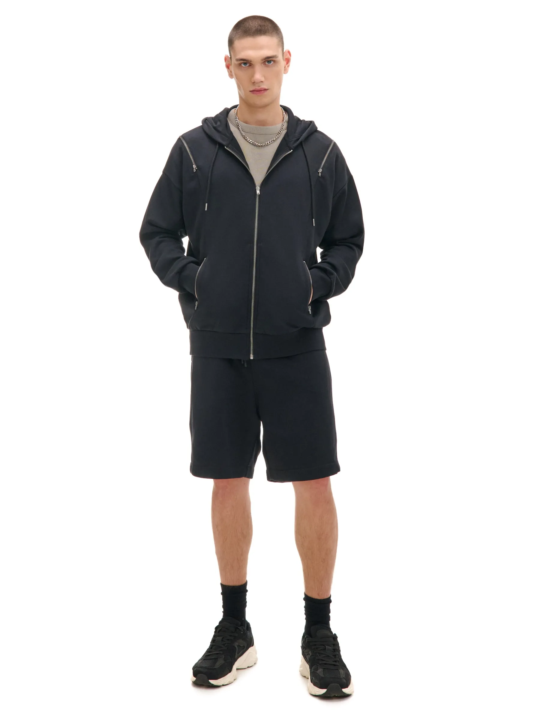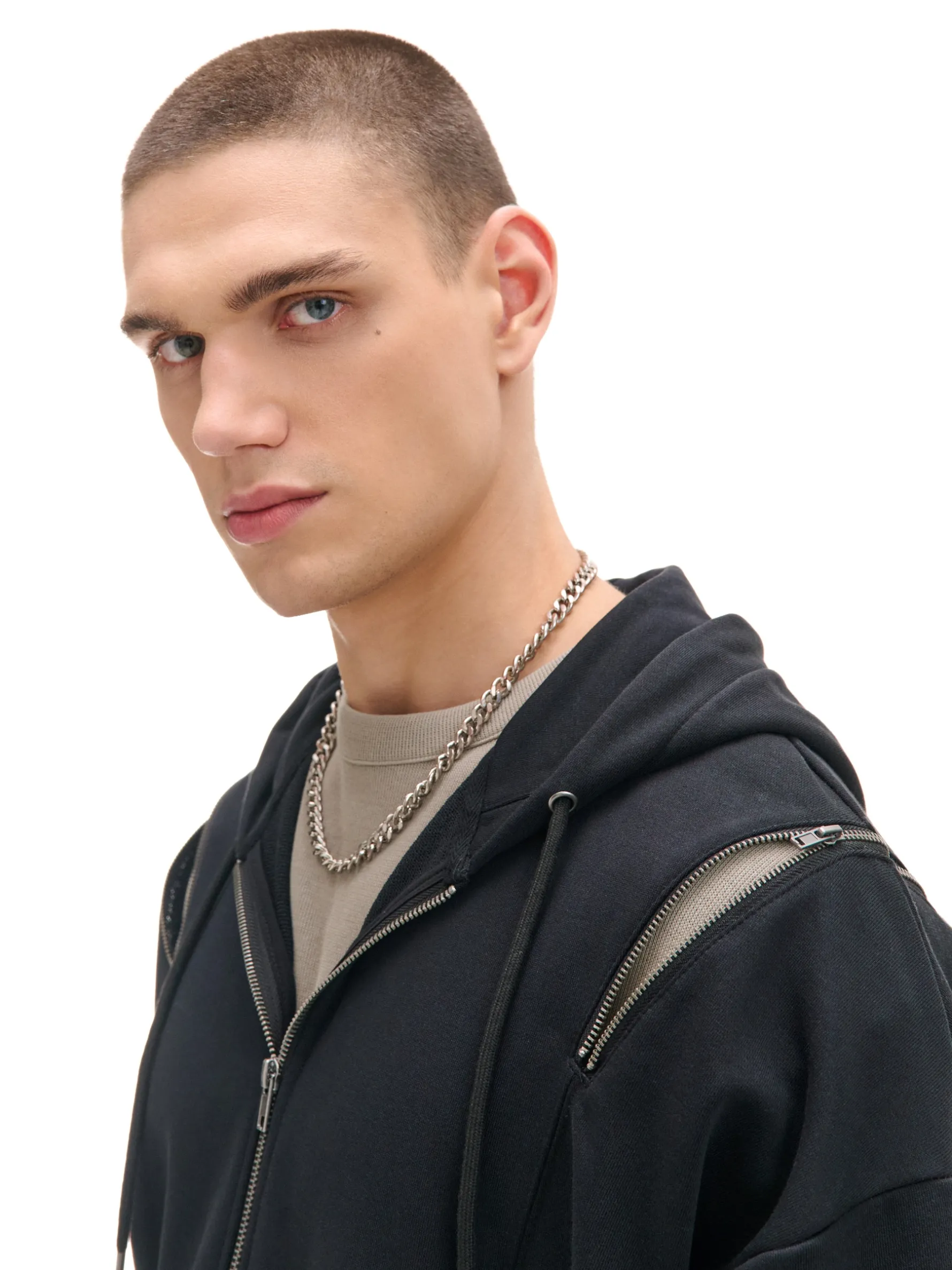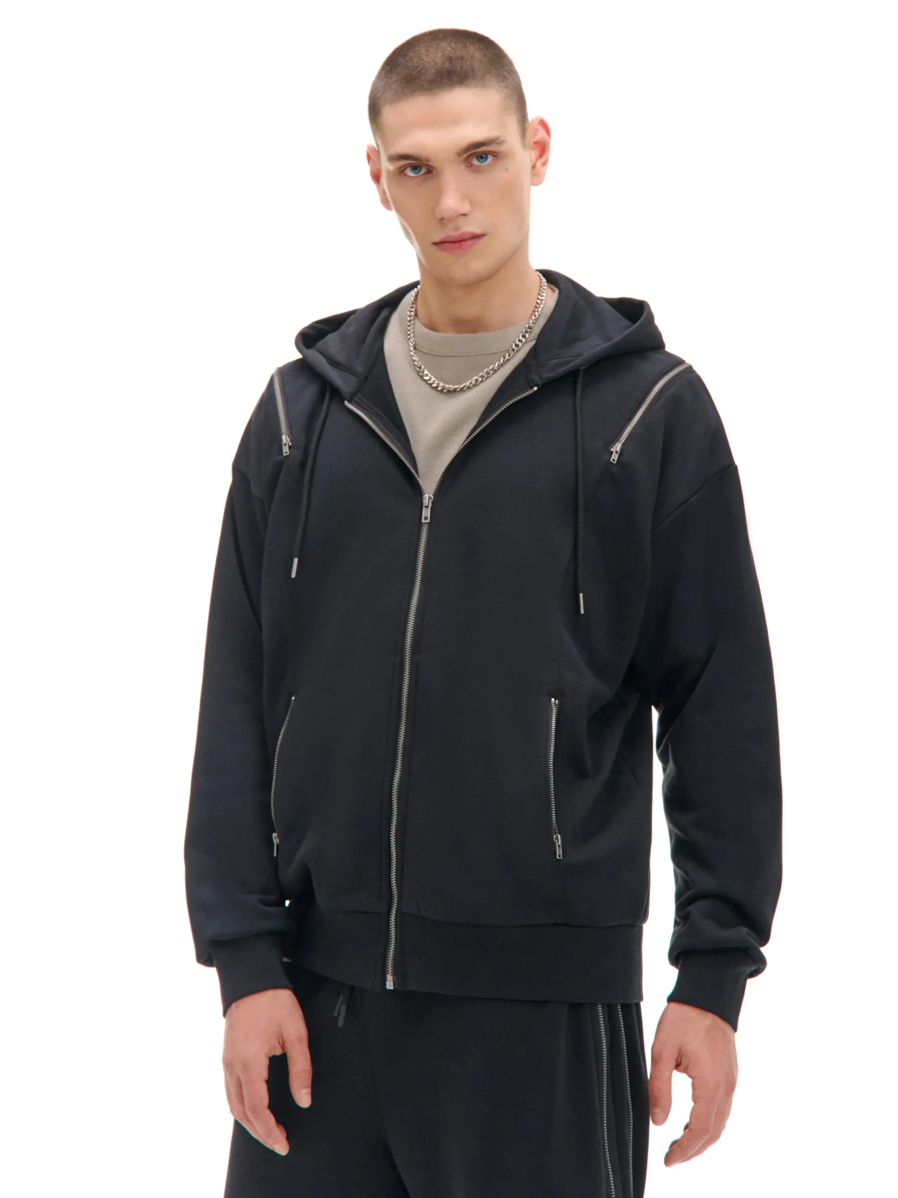 Bluza męska o kroju loose, uszyta z dzianiny z dodatkiem trwałej bawełny french terry. Metalowe zamki przy zapięciu, kieszeniach i nieszablonowe rozwiązanie na suwaki wszyte w rękawy. Wypróbuj! dzianinowy materiał z bawełną swobodny, luźny krój zapięcie na metalowy zamek miękki kaptur z troczkami długie rękawy wykończone elastycznym ściągaczem kieszenie boczne z zamkami dół wykończony ściągaczem metalowe zamki przy rękawach Gramatura: 340 gsm Ten produkt należy do kolekcji UNISEX – zalecamy wybranie mniejszego rozmiaru niż zazwyczaj, jeśli chcesz uniknąć efektu oversize.
