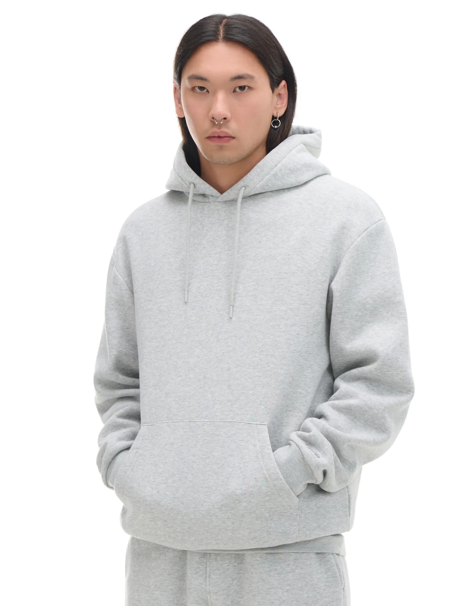 Gładka męska bluza z kapturem o regularnym kroju, uszyta z mieszanki dzianin o wysokiej zawartości bawełny. Casual, który warto mieć pod ręką! uszyta z gładkiej, bawełnianej dzianiny regularny krój miękki kaptur z troczkami swobodne rękawy z obniżoną linią ramion dół i rękawy wykończone ściągaczem z przodu duża kieszeń typu kangurka