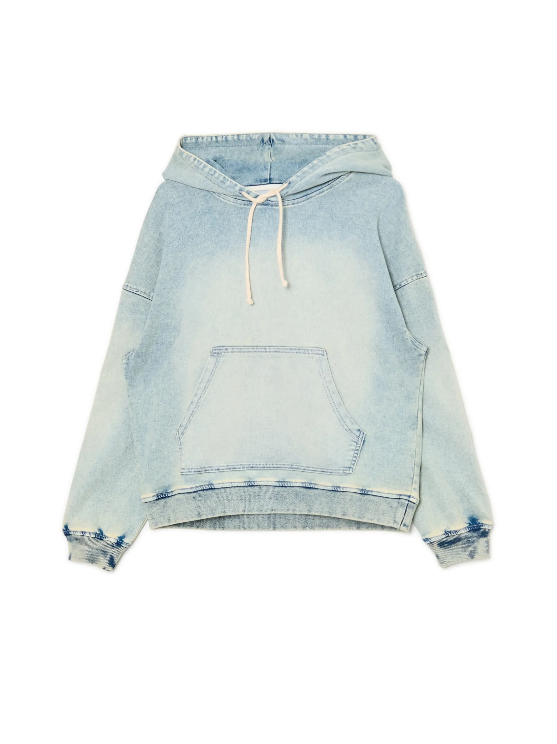 Damska bluza typu hoodie, uszyta z denimu w jasnym kolorze z efektem sprania. Wygodna regulacja kaptura, niepodwijające się ściągacze i praktyczna kieszeń kangurka to must have sztosowej bluzy. denim o klasycznym kolorze z delikatnym efektem sprania swobodny krój dół i rękawy wykończone ściągaczem obszerny kaptur z troczkami duża kieszeń typu kangurka z przodu efekt sprania na całości Wzrost modelki: 172 cm