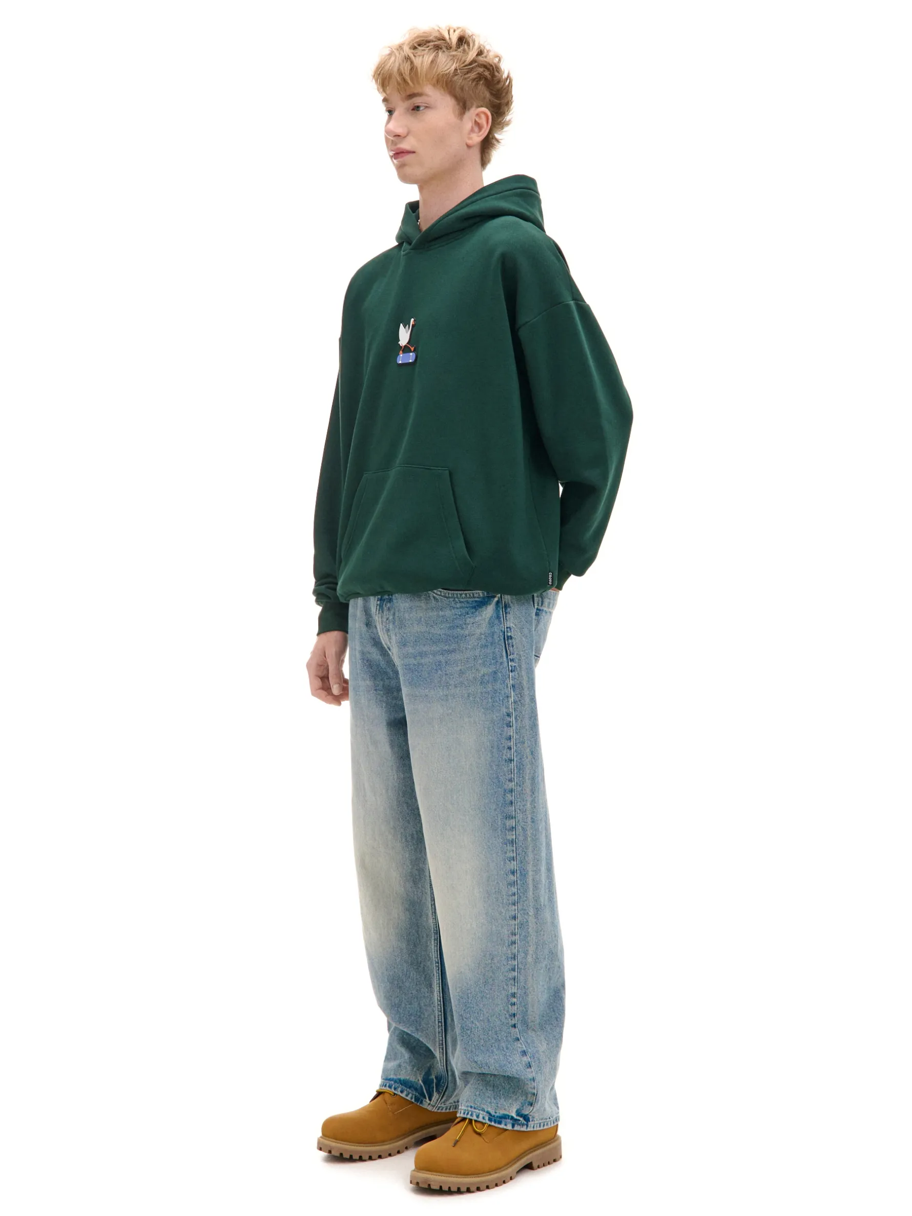 Gęś na deskorolce? Czemu nie! Męska bluza typu hoodie uszyta z dzianiny z dodatkiem bawełny fleecy w kolorze butelkowej zieleni. Na przodzie artystyczna naszywka z gęsią skaterem. uszyta z miękkiej dzianiny z bawełną swobodny, luźny krój miękki kaptur długie rękawy z obniżoną linią ramion dół i rękawy wykończone ściągaczem kieszeń kangurka na przodzie na środku dekoracyjny haft