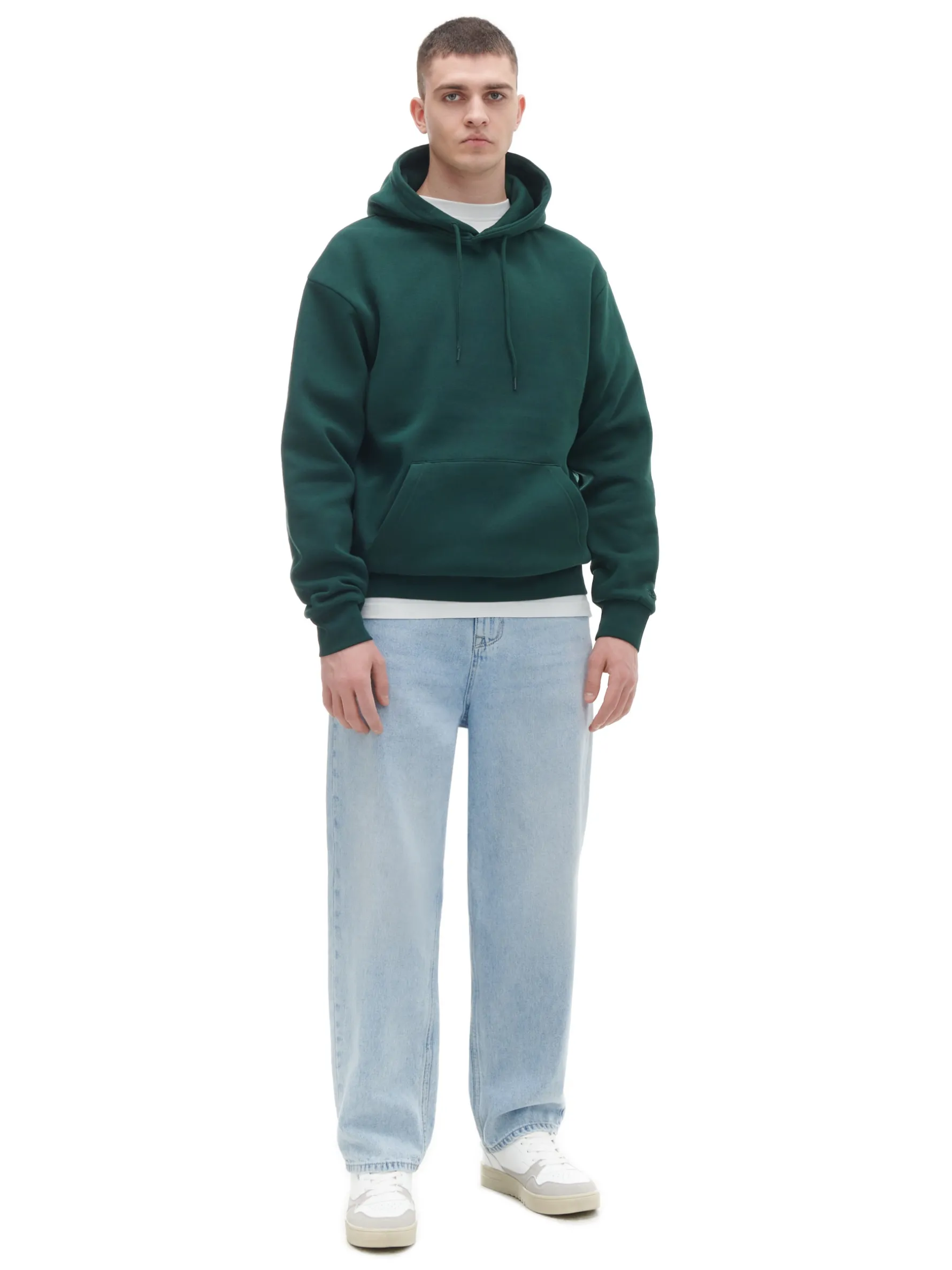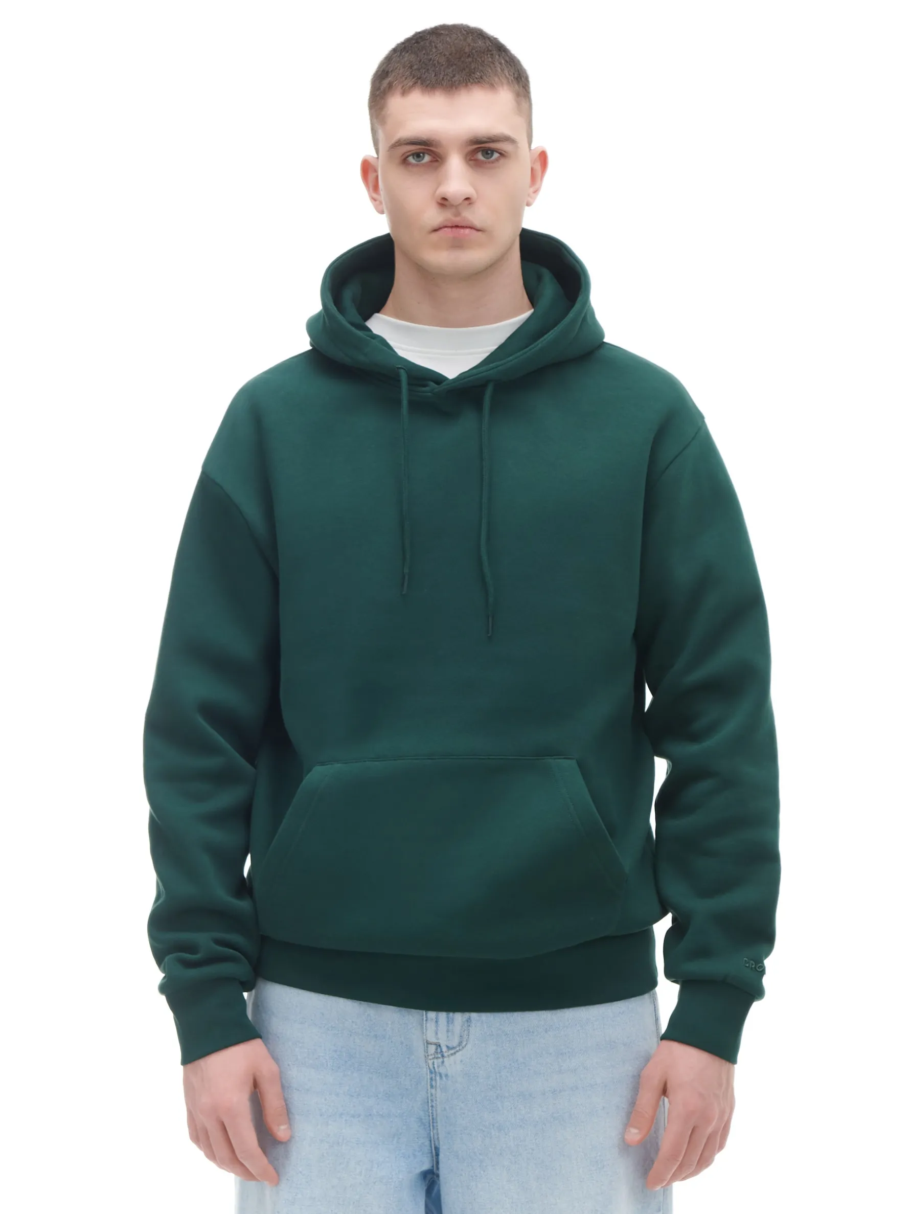 Zielona bluza z kapturem w stylu basic, uszyta z dzianiny o wysokiej zawartości bawełny. regularny krój kaptur regulowany sznurkiem rękawy i dół zakończoe ściągaczem kieszeń kangurka