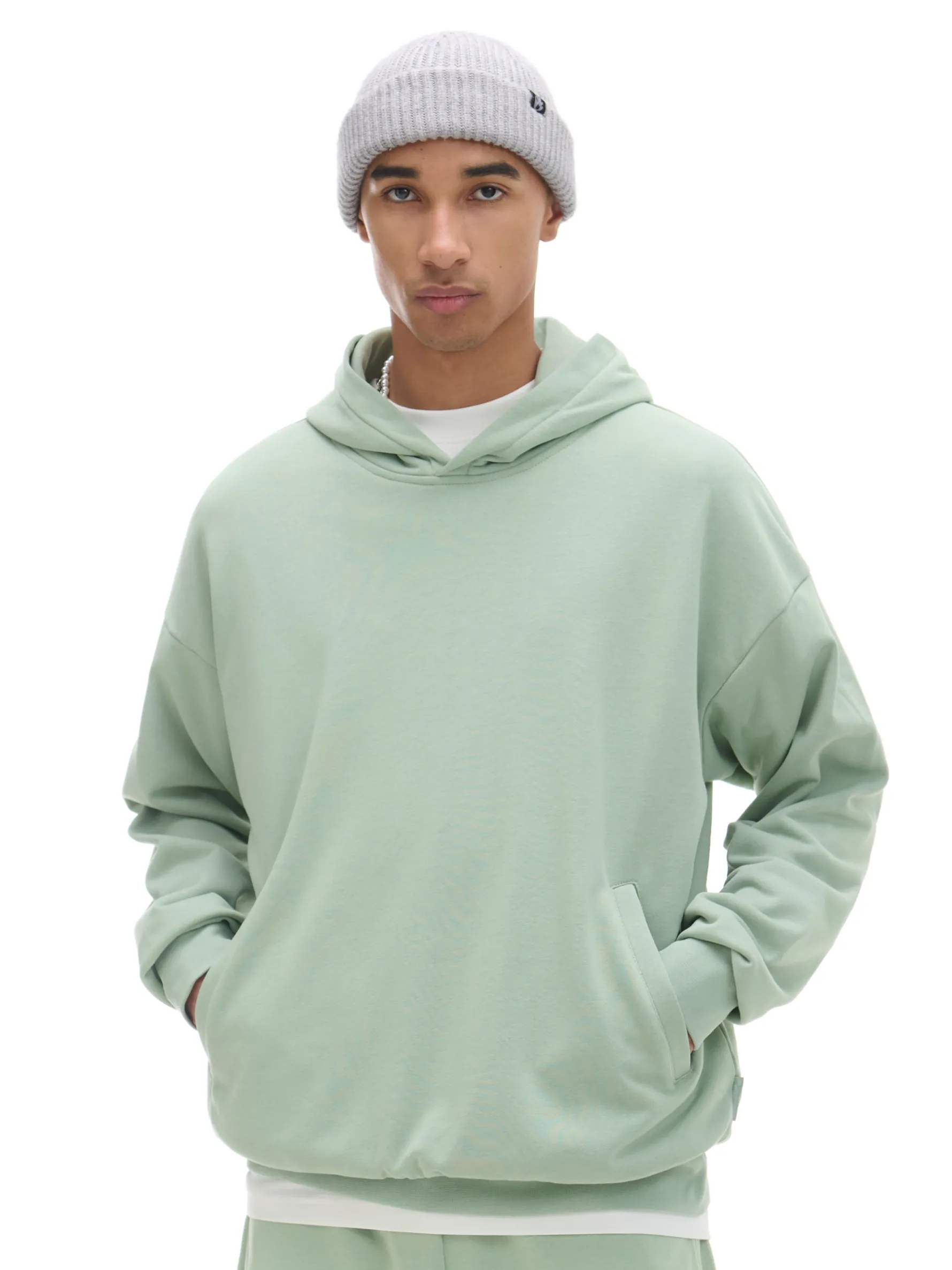 Męska dresowa bluza, zakładana przez głowę. Uszyta z miękkiej, miłej w dotyku dzianiny zawierającej bawełnę. luźny krój obniżona linia ramion miękki kapur dół i rękawy wykończone ściągaczem dwie kieszenie z przodu Wzrost modela: 185 cm
