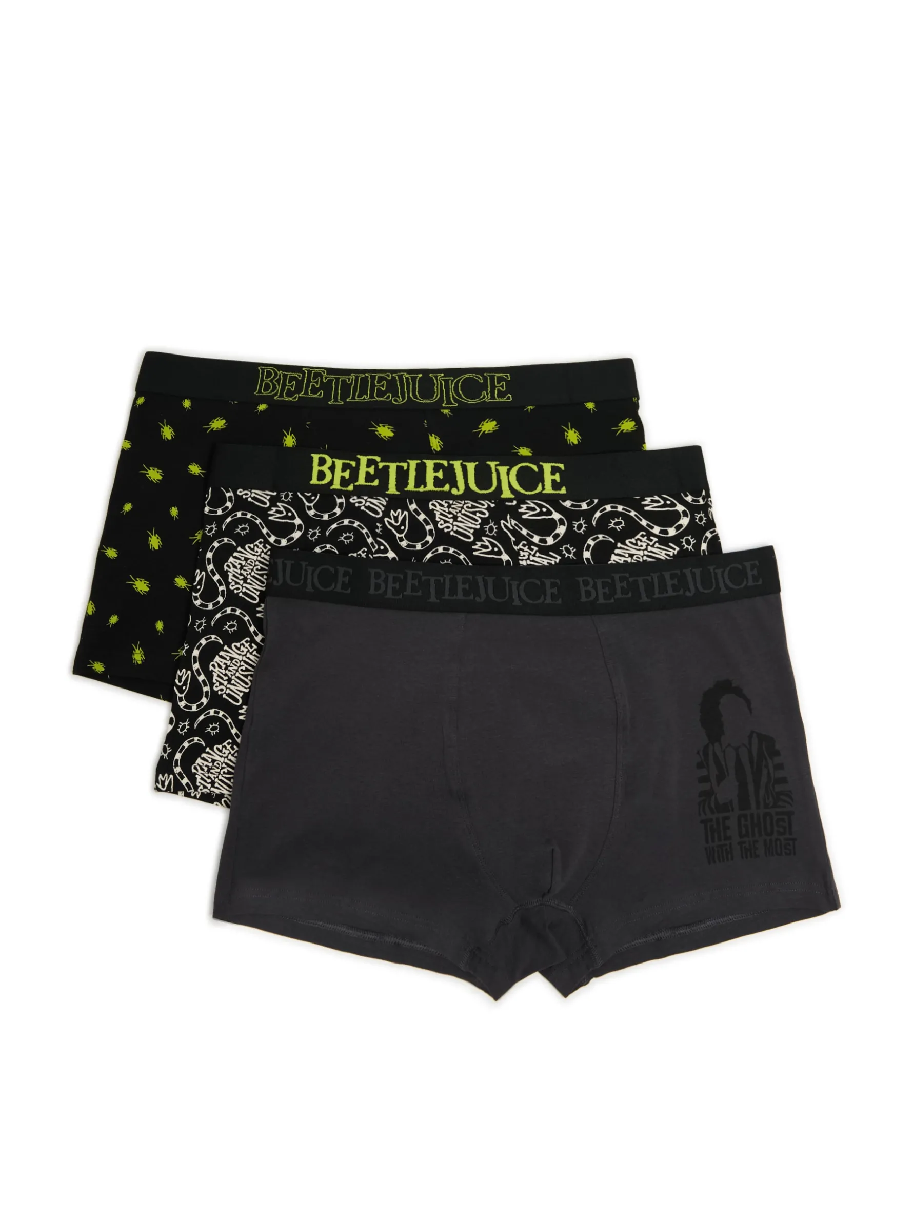 Zestaw trzech par majtek typu bokserki o kroju regular, uszyte z mieszanki dzianin. Na całej powierzchni licencjonowane nadruki z kultowego filmu 'Sok z żuka’. bawełna z dodatkiem elastycznych włókien regularny stan elastyczna gumka w pasie nadruk z motywem Halloween BEETLEJUICE and all related characters and elements © & TM Warner Bros, Entertainment Inc. WB SHIELD: © & TM WBEI. (s24)