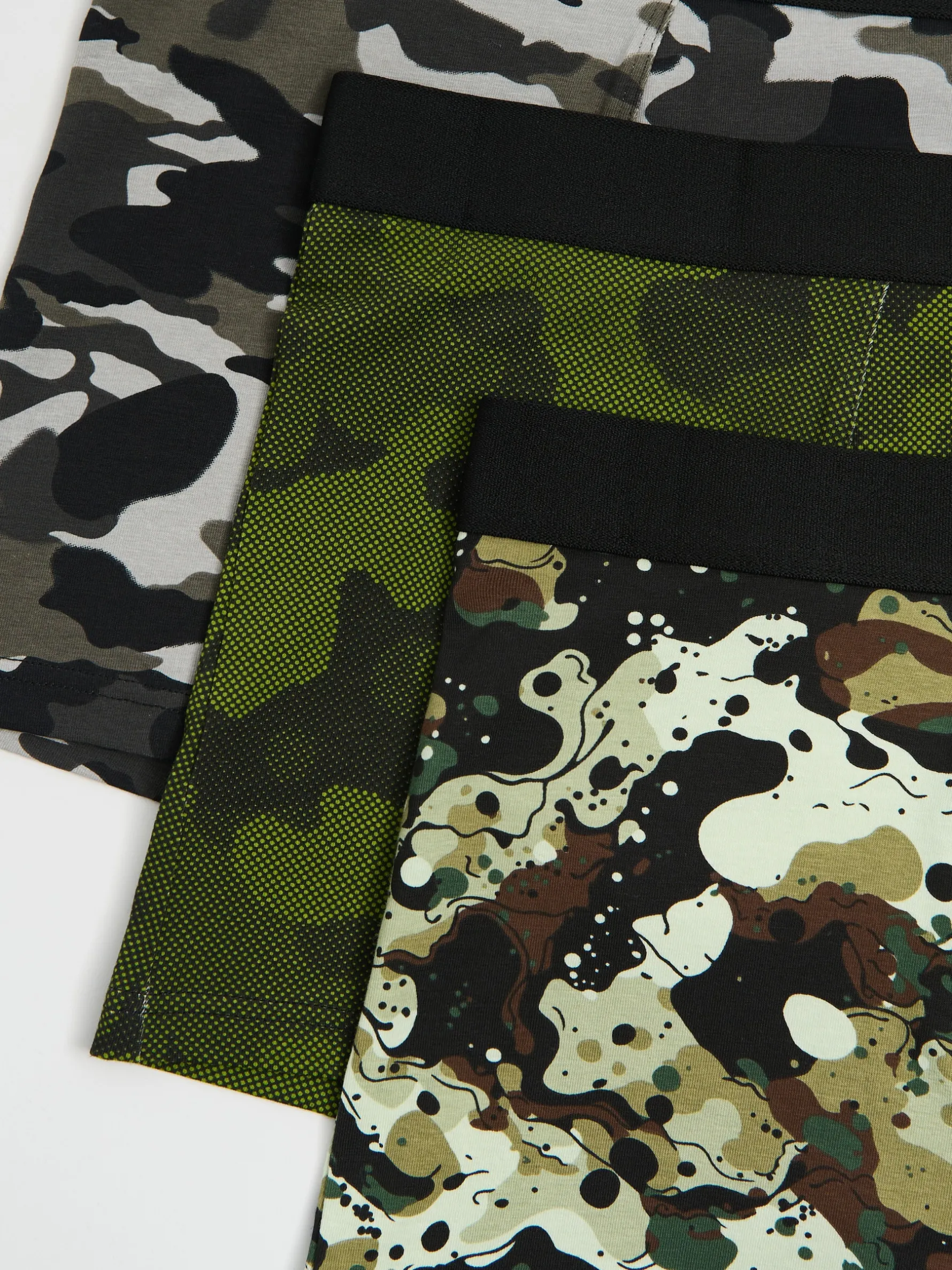 Zestaw 3 par męskich majtek typu bokserki, uszytych z elastycznej mieszanki dzianin. Na całej powierzchni nadruki z motywem militarnym. Gotowe do zadań specjalnych! bawełna z domieszką elastycznych włókien regularny krój elastyczna guma w pasie wzór moro all over