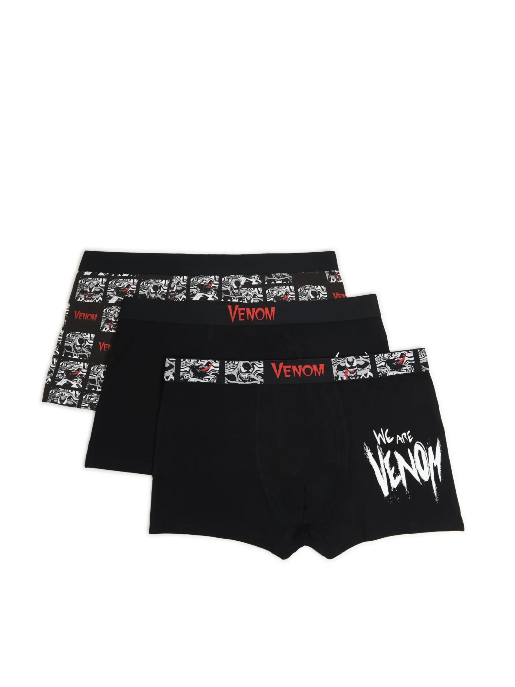 Trójpak męskich bokserek, uszytych z dzianiny o bardzo wysokiej zawartości bawełny. Na każdej parze nadruk nawiązujący do postaci Venoma. Venom © MARVEL