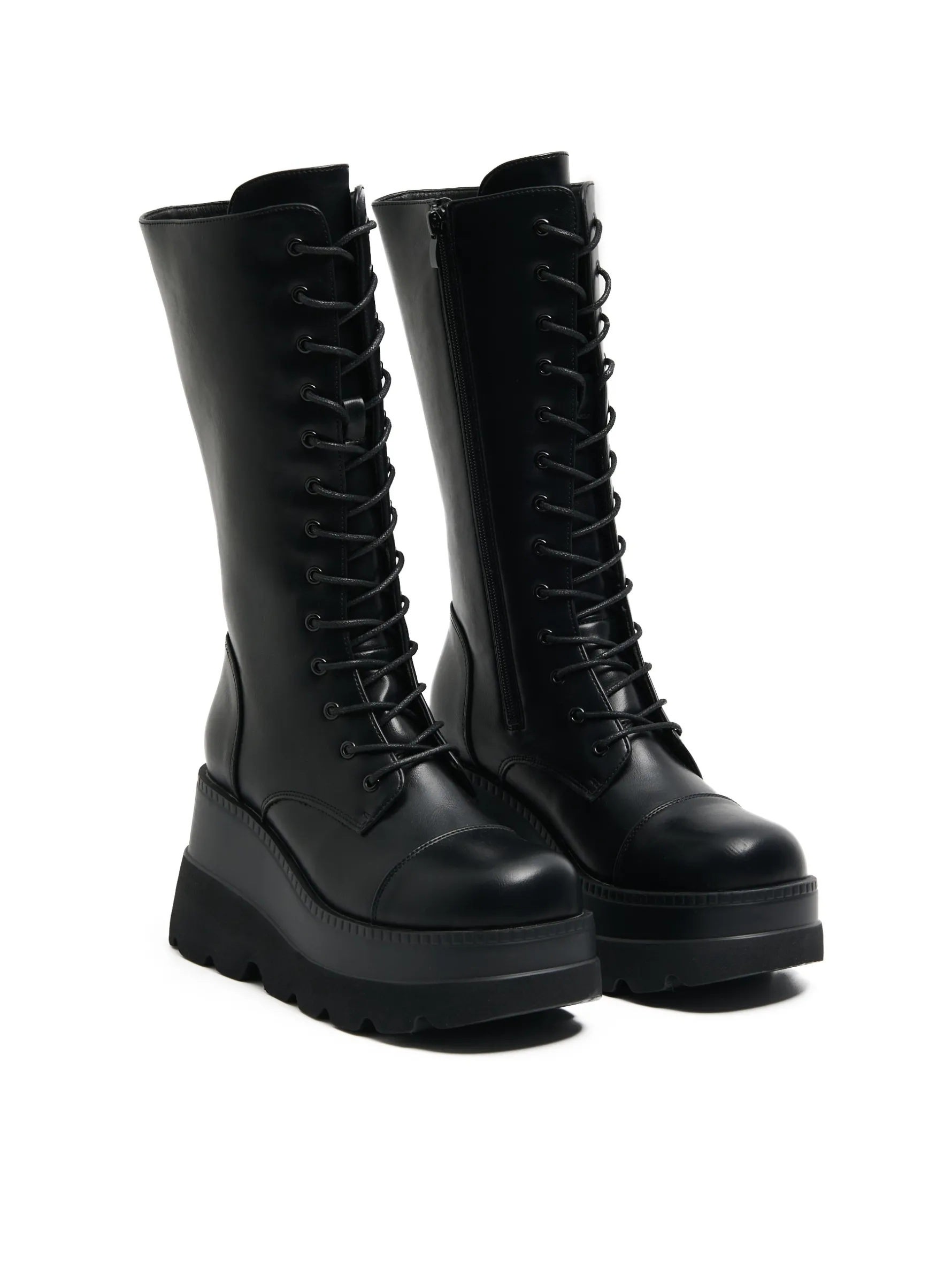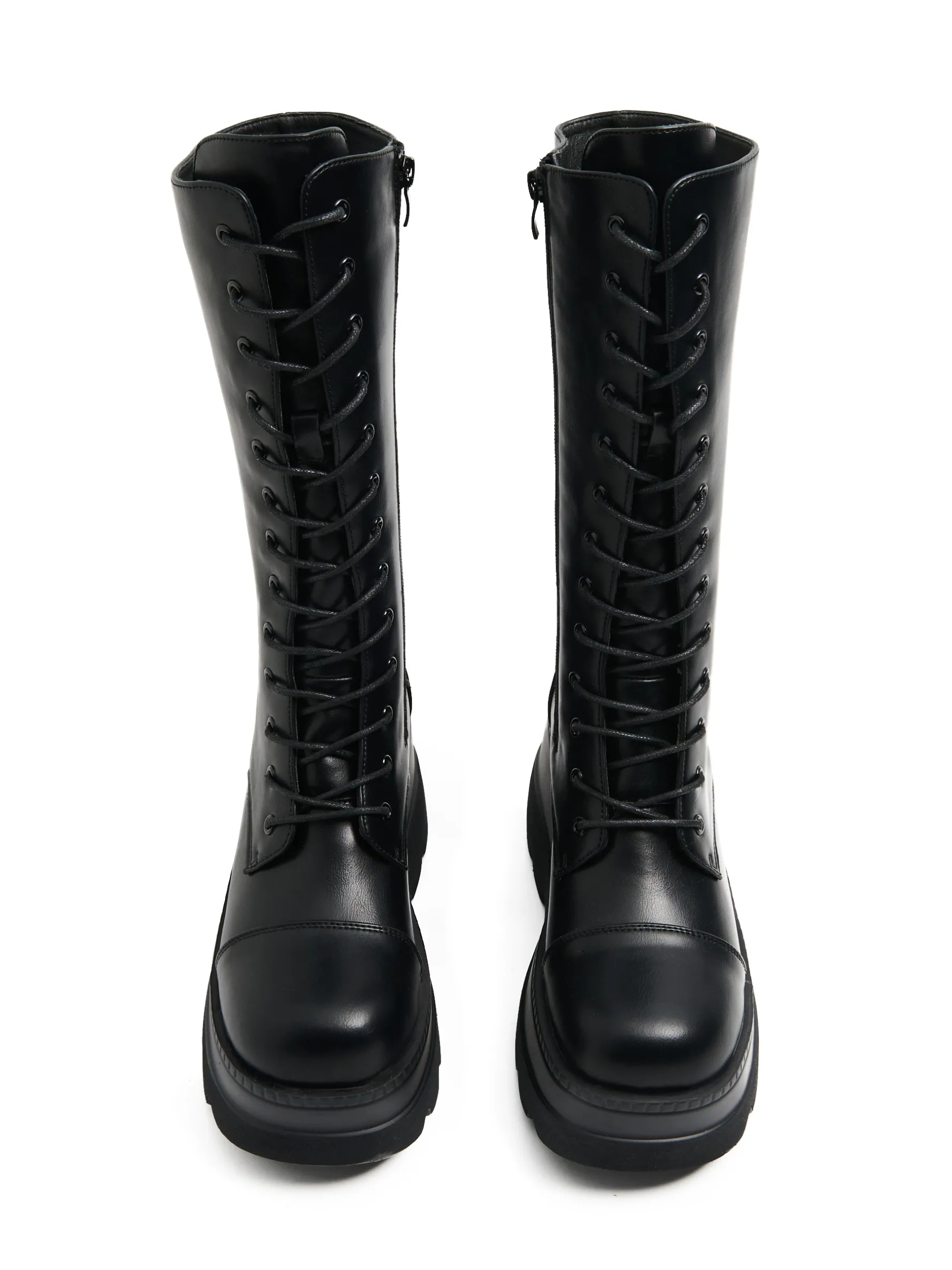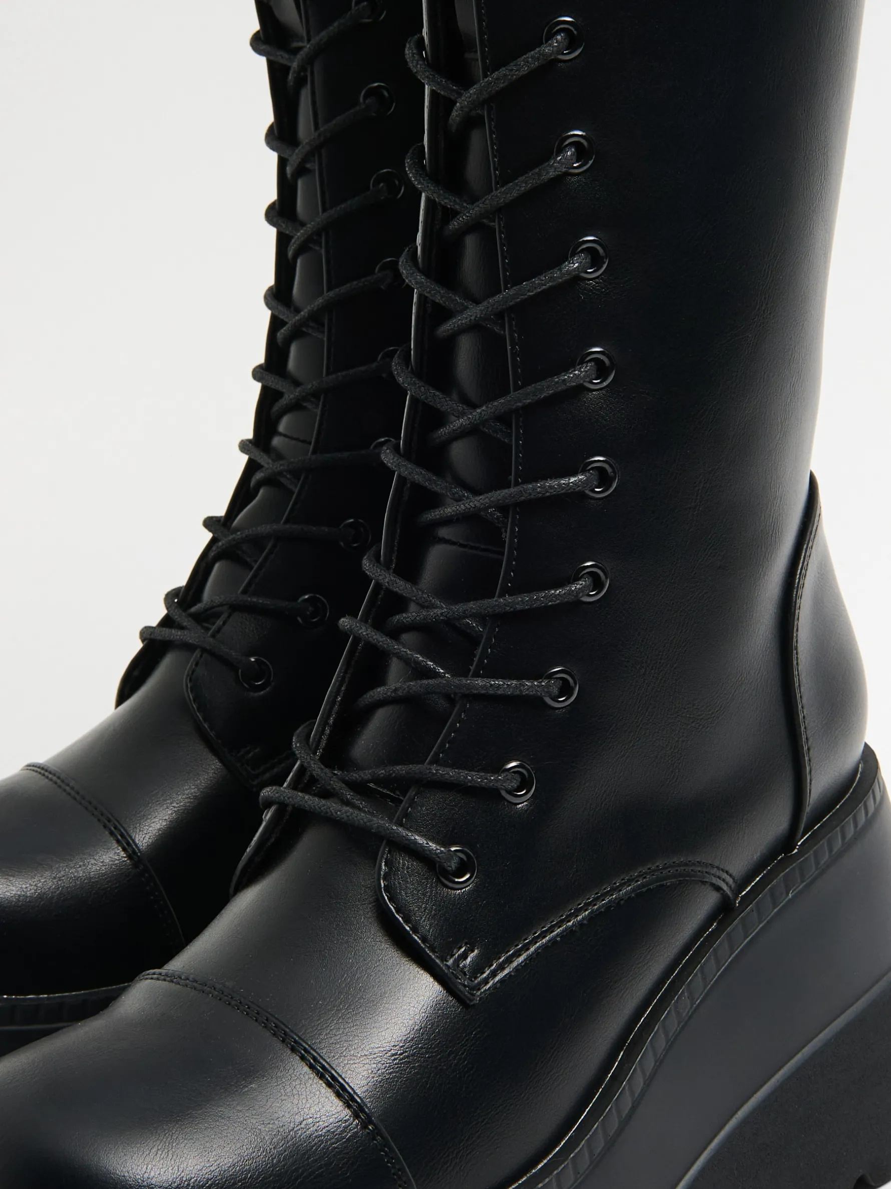 Czarne damskie botki za kostkę, wykonane z lekko połyskującej imitacji skóry. Otwory przeznaczone do przeciągania sznurówki mają metalowe zakończenie. Są trwałe, a sznurowanie na 13 par oczek podobno przynosi szczęście. True story! przejściowe botki za kostkę uszyte z imitacji skóry sznurowanie i zapięcie na zamek z boku gruba, solidna podeszwa na platformie ozdobne przeszycia metalowe detale