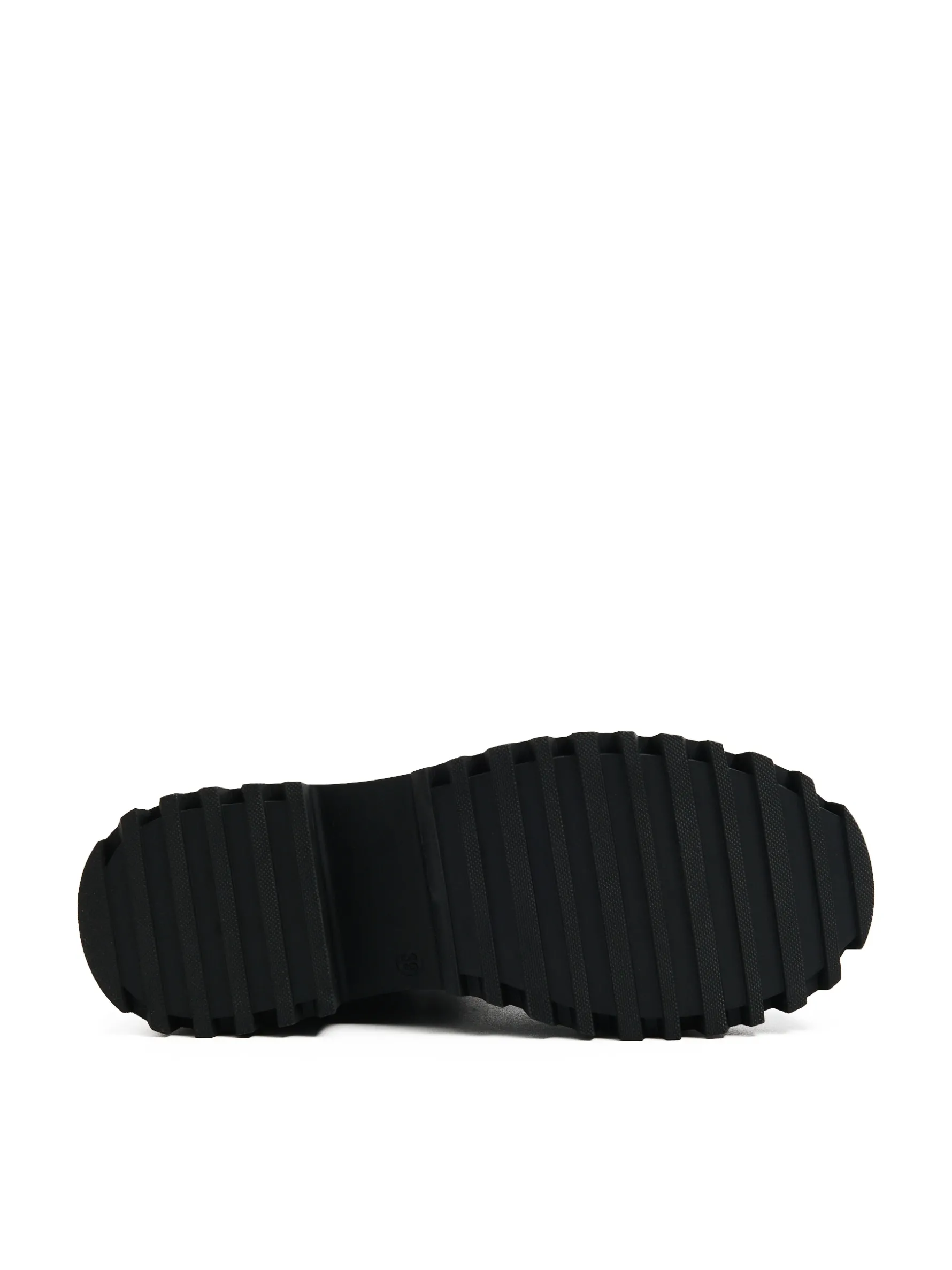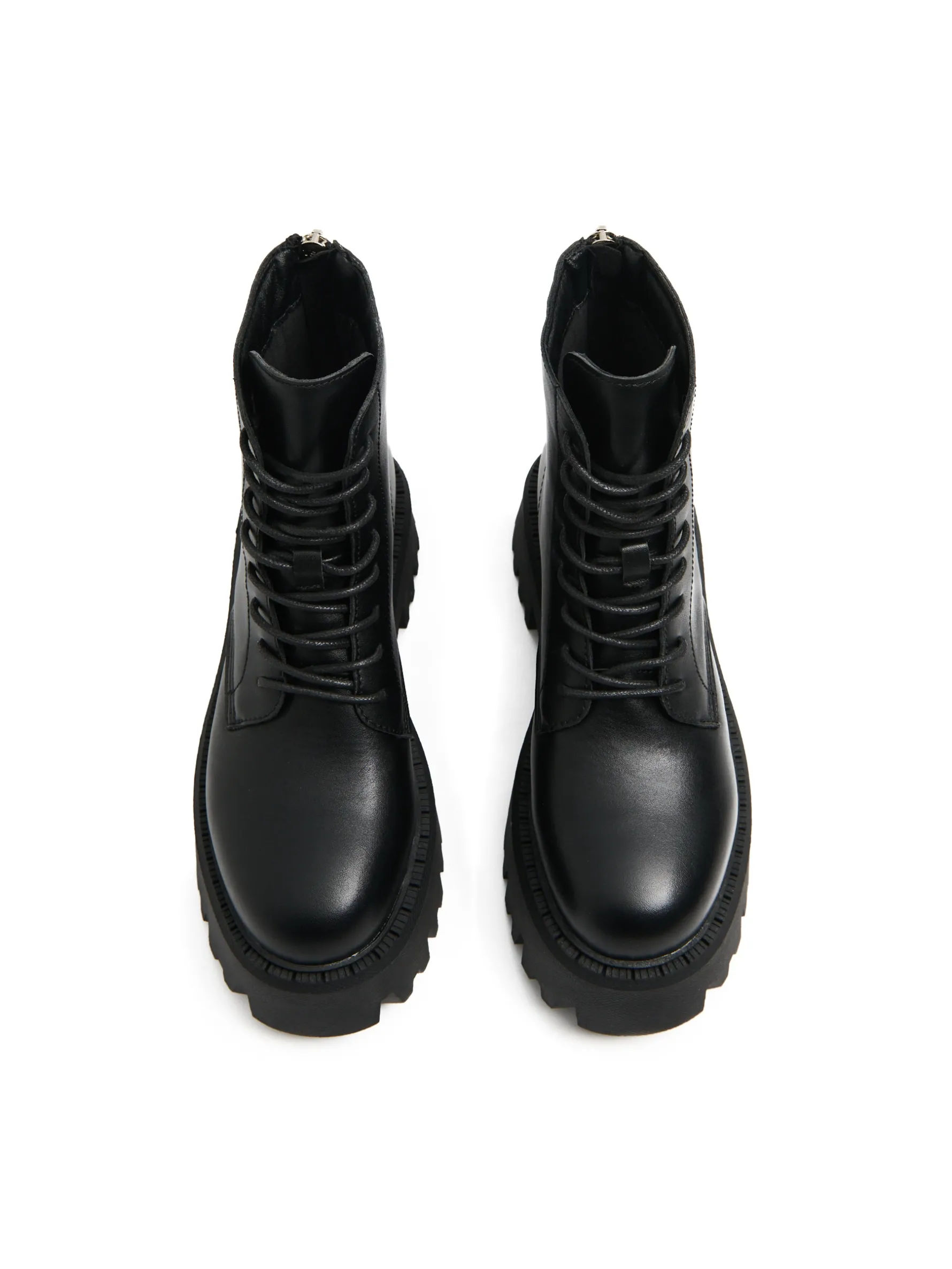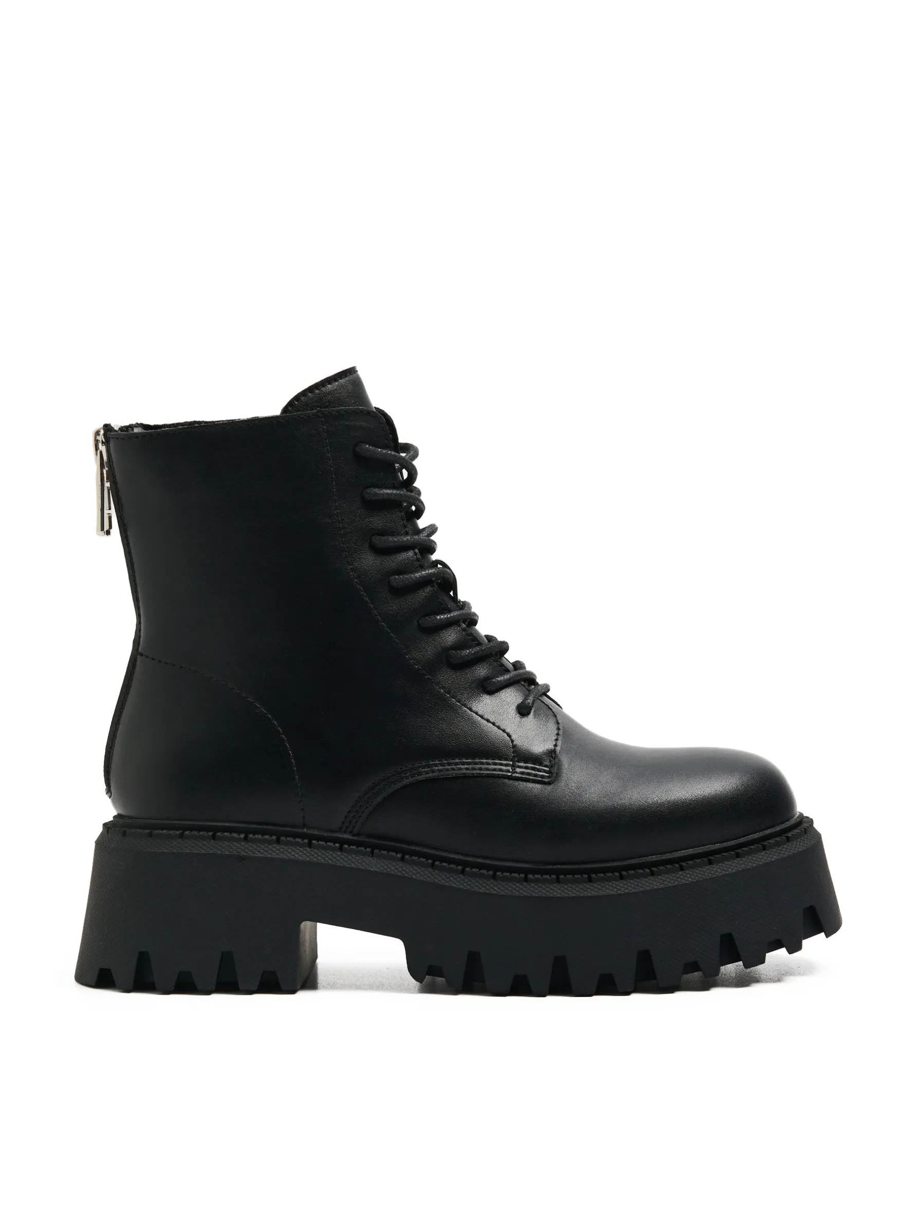 Czarne damskie botki z wysoką cholewką wykonane z imitacji skóry. Posiadają traktorową podeszwę i obcas z termoplastycznej gumy zapobiegającej starciu się materiału. Idealne na sezon przejściowy. botki za kostkę cholewka z imitacji skóry zapięcie z tyłu na zamek traktorowa podeszwa z gumy termoplastycznej wiązane na czarne sznurowadła