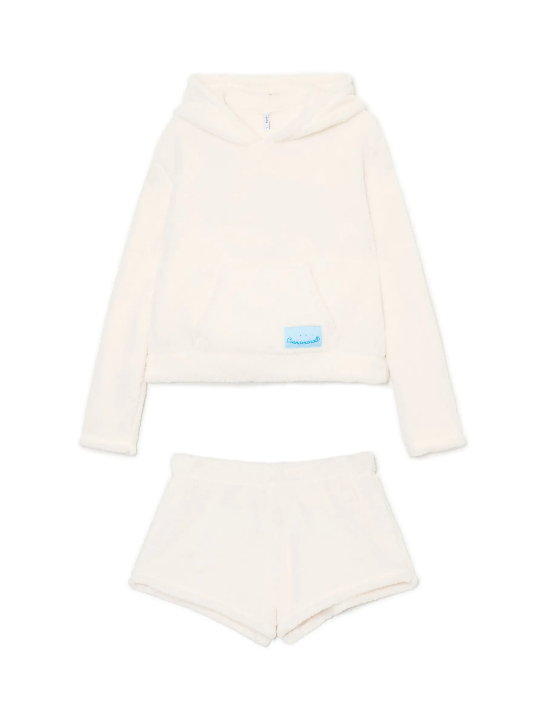 Cozy damska piżama uszyta ze sztucznego baranka. Zestaw zawiera krótkie spodenki i bluzę hoodie z kieszenią typu kangurka na wieczorne snacki. Ozdobą jest uroczy ogonek i kolorowy napis z imieniem bohatera serii Sanrio – Cinnamorollem. wykończenie na podszyciu ze sztucznego baranka swobodny, luźny krój kaptur z uszami długie rękawy duża kieszeń typu kangurka z przodu dekoracyjny ogon szorty z naszywką na tyle elastyczna guma w pasie Tworzy zestaw z modelem: 222AU-00X . © 2024 SANRIO CO., LTD.
