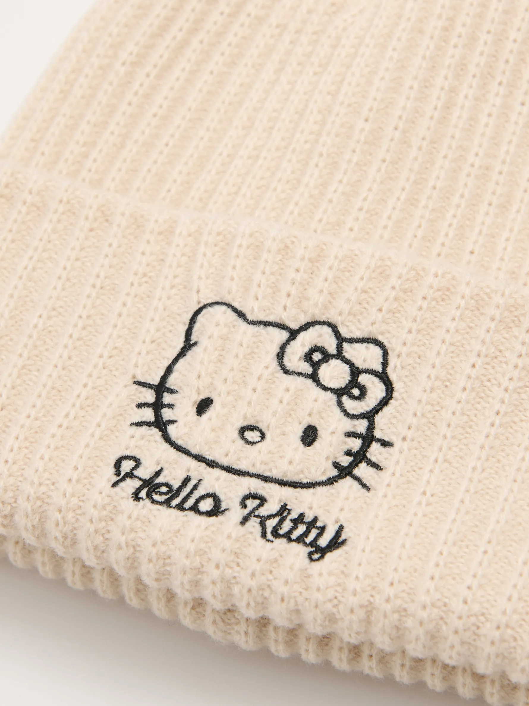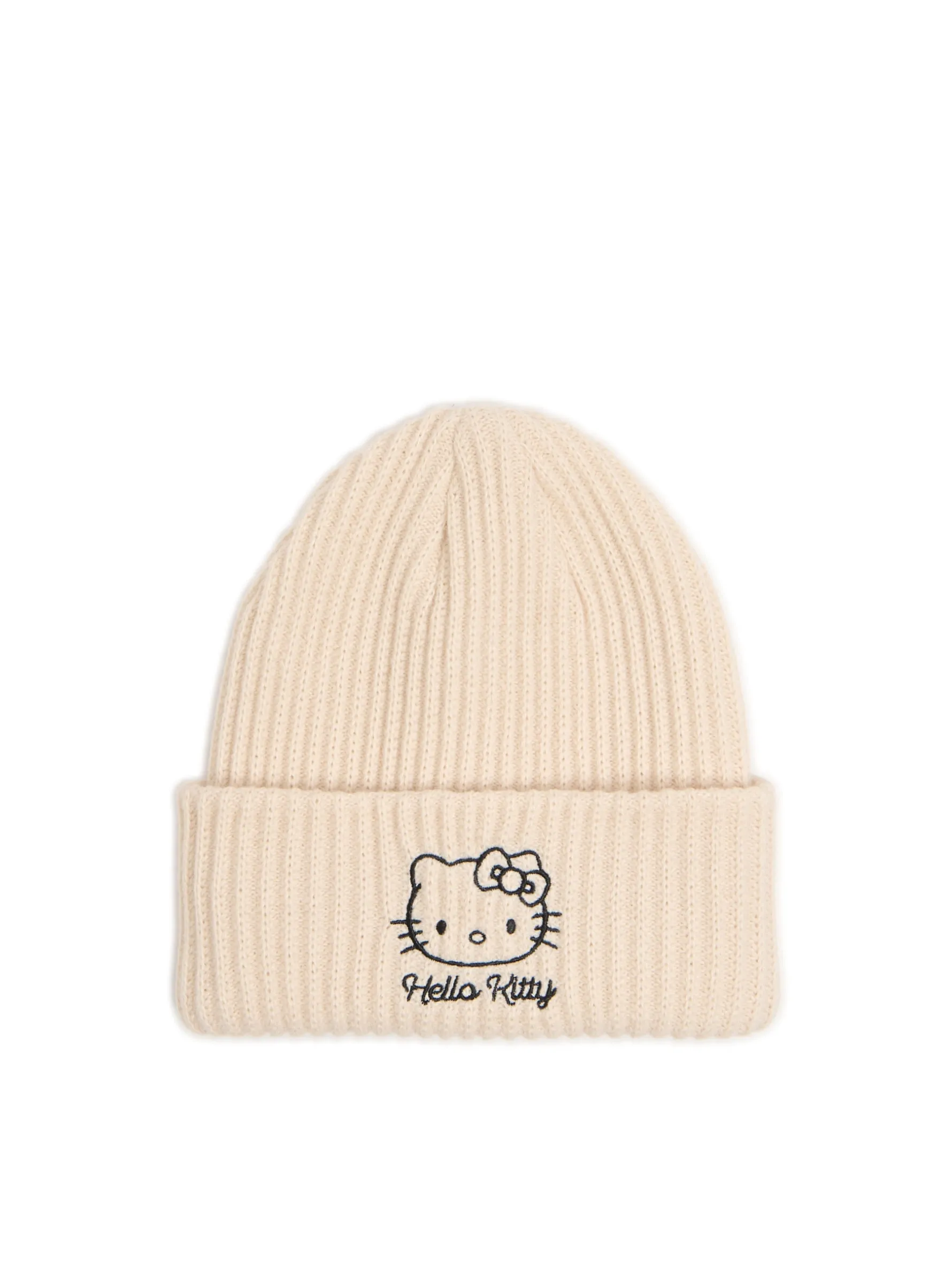 Kremowa damska czapka typu beanie z haftowaną postacią Hello Kitty z przodu. © 2024 SANRIO CO., LTD.
