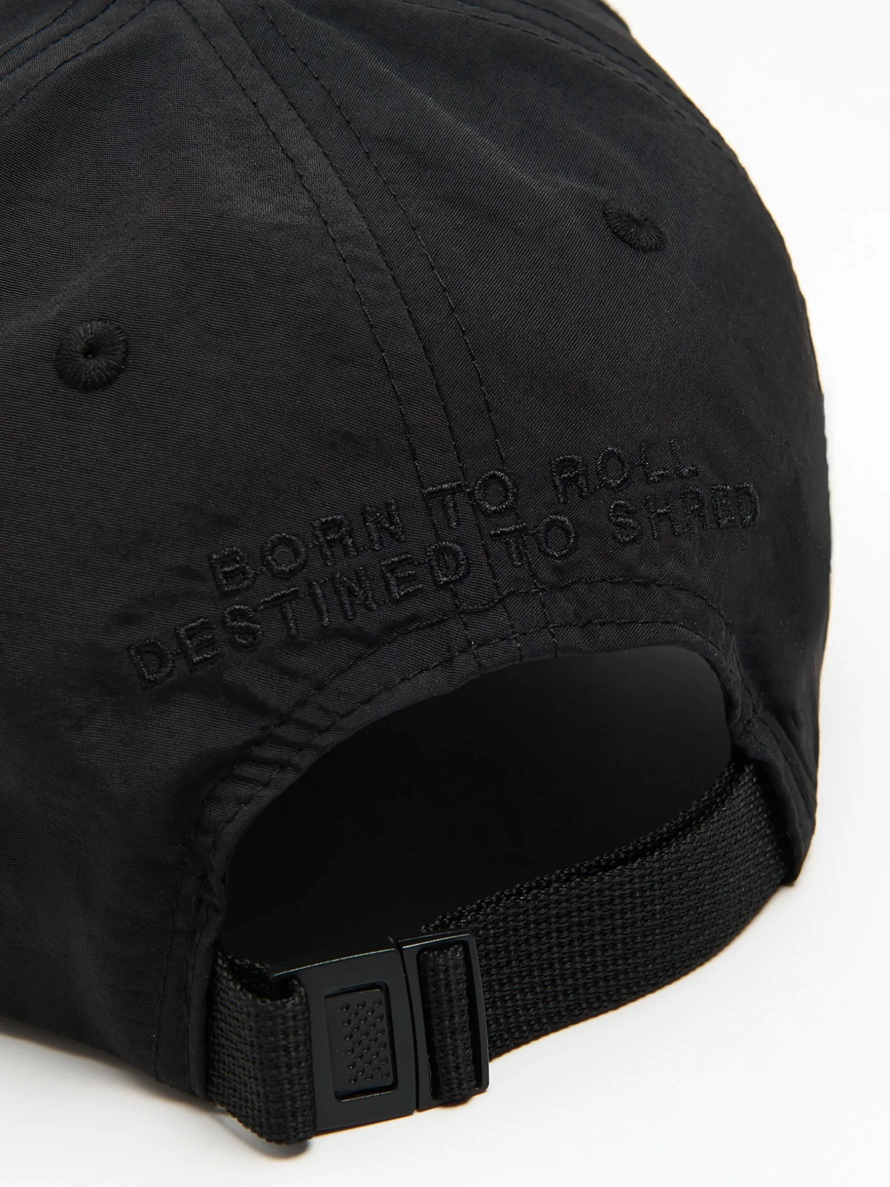 Czarna męska czapka z daszkiem, uszyta z gładkiej tkaniny. profilowany daszek z przodu niewielki streetwearowy haft z tyłu wyhaftowany napis „BORN TO ROLL, DESTINED TO SHRED” możliwość regulacji obwodu za pomocą paska z klamrą