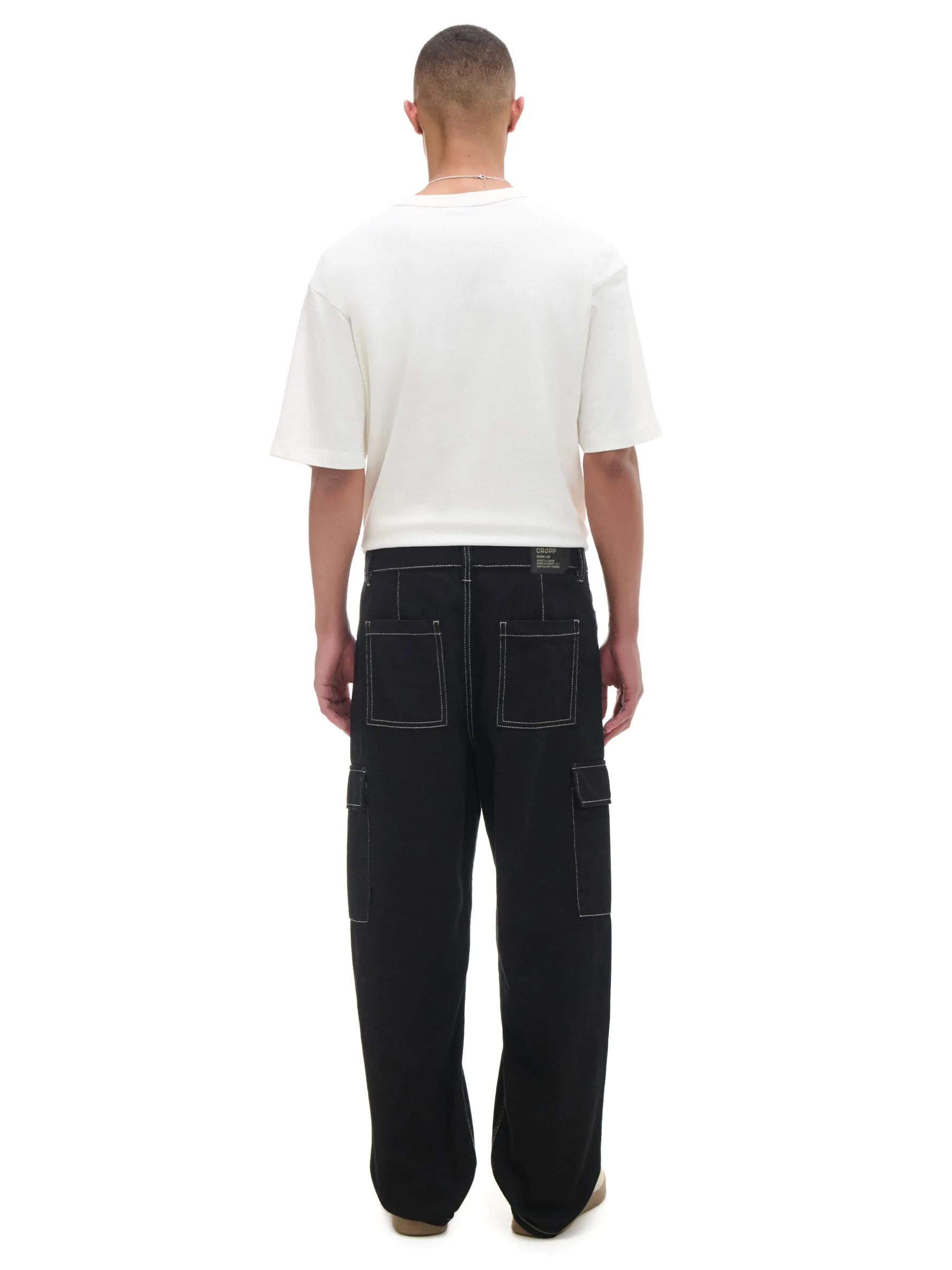 Męskie spodnie jeansowe o kroju baggy, uszyte z bawełnianej tkaniny. luźny fason o szerokiej nogawce obniżony krok efekt sprania materiału zapięcie na zamek i guzik sześć kieszeni, w tym dwie typu cargo z patkami szlufki na pasek Wzrost modela: 185 cm