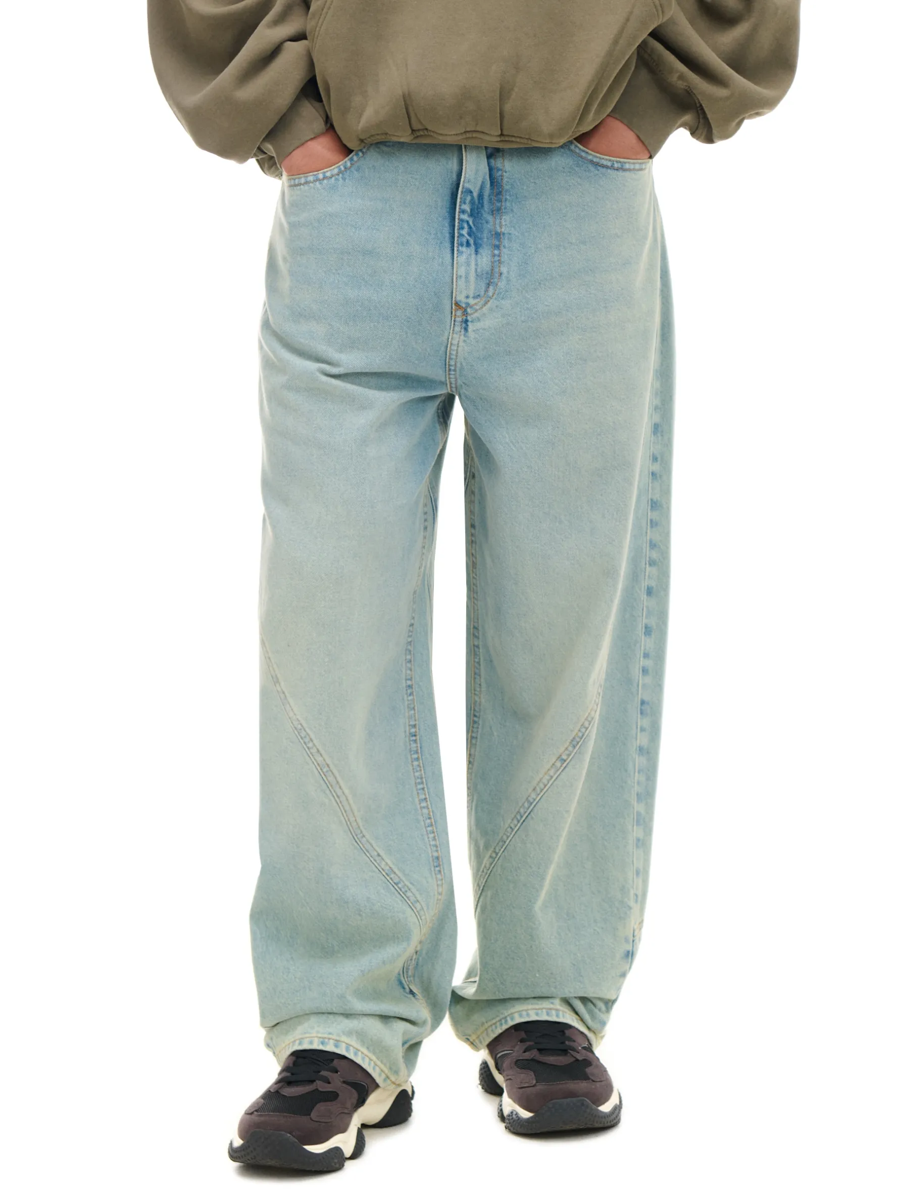 Męskie spodnie o poszerzonych nogawkach, uszyte z bawełnianej tkaniny w błękitnym odcieniu. Ozdobą tego modelu są przeszycia po obu stronach. Bardzo luźno i bardzo stylowo na spontaniczne wypady z ekipą. 100% bawełny obszerny krój super baggy długie, szerokie nogawki zapięcie na zamek i guzik cztery kieszenie jedna mała kieszeń na drobniaki szlufki na pasek ozdobne przeszycia efekt sprania na całości