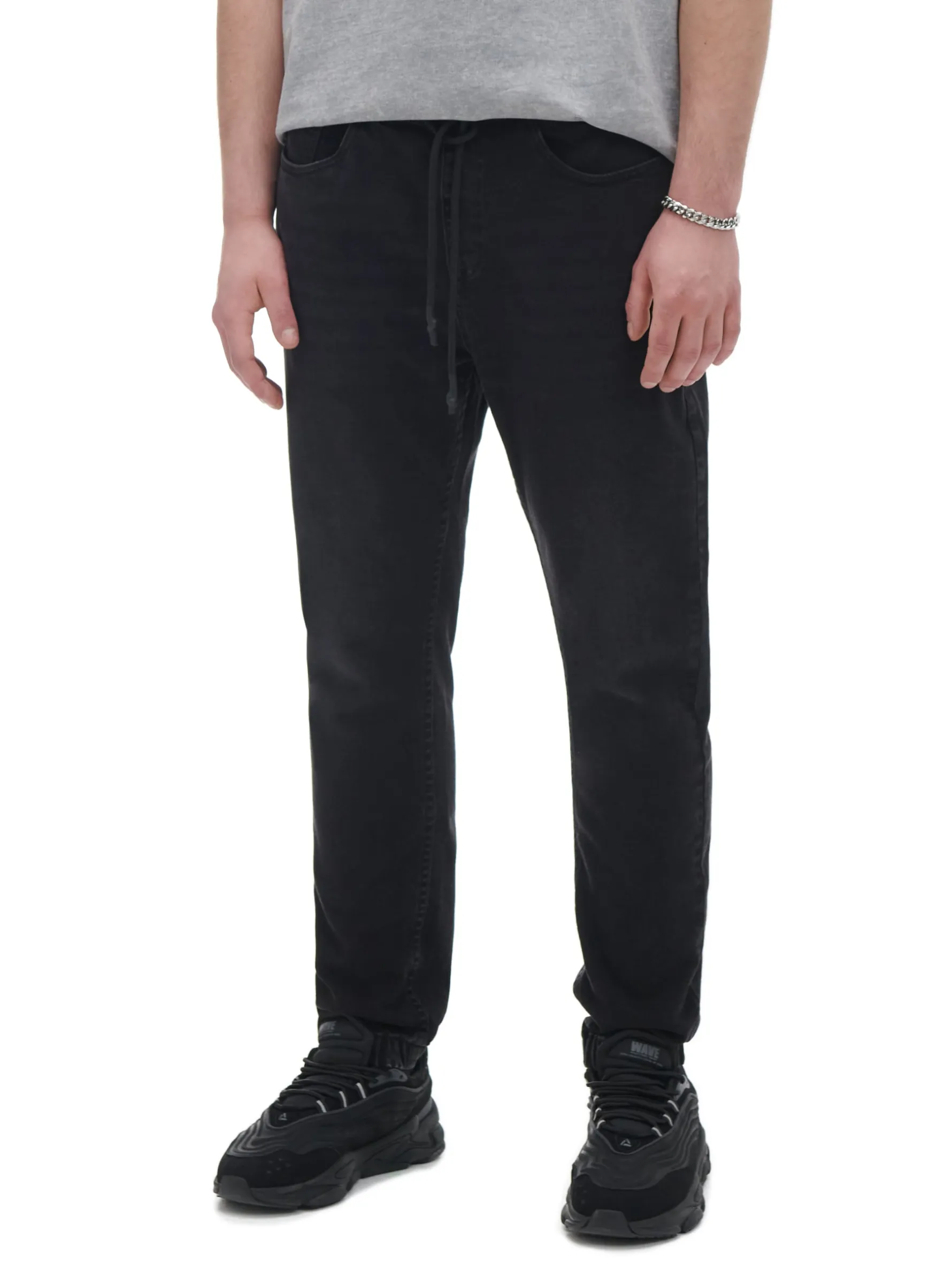 Męskie jeansy typu jogger o sportowym kroju, idealne dla osób ceniących sobie wygodę. Uszyte z mieszanki tkanin o bardzo wysokiej zawartości bawełny. regularna nogawka, zakończona ściągaczem z wszytą elastyczną gumką w pasie elastyczna gumka i sznurek do regulacji pięć kieszeni imitacja rozporka efekt sprania materiału Wzrost modela: 184 cm