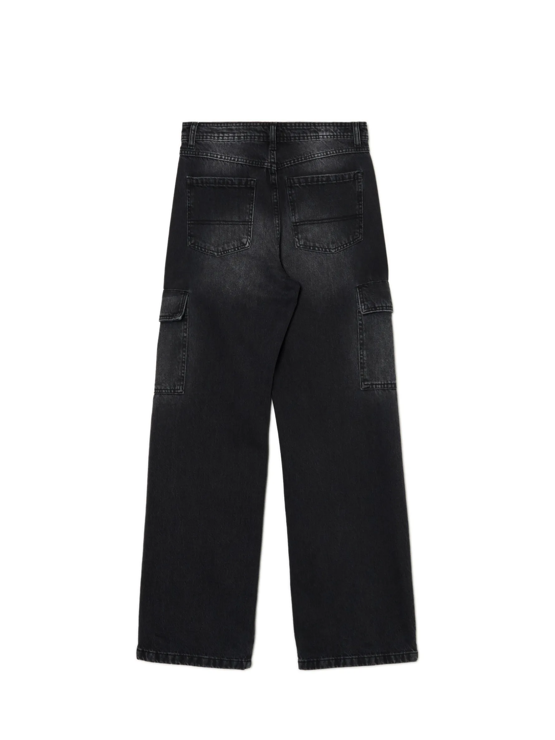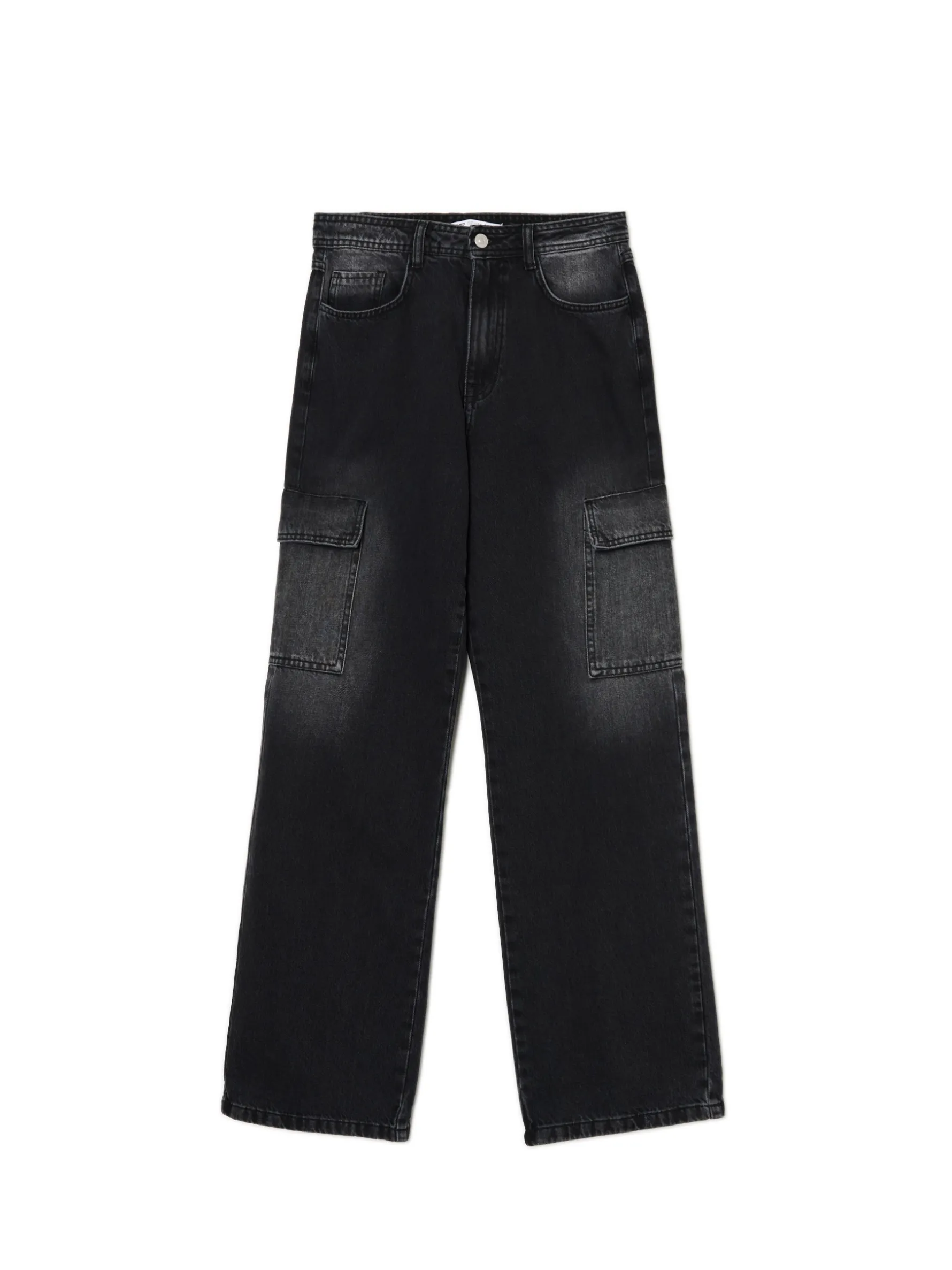 Damskie spodnie jeansowe uszyte z bawełnianej tkaniny. Szerokie nogawki, praktyczne kieszenie i szlufki blisko siebie – praktyczne rozwiązanie na pasek lub zmęczone ręce po całym dniu. 100% bawełny obszerny krój baggy zapięcie na zamek i guzik długie, szerokie nogawki pięć kieszeni dodatkowe kieszenie cargo na nogawkach efekt sprania Potrzebna Ci wersja petite? Jest tu: 745AQ-99M . Szukasz wersji tall? Kliknij tutaj: 748AQ-99M . Wzrost modelki: 177 cm